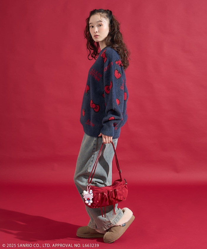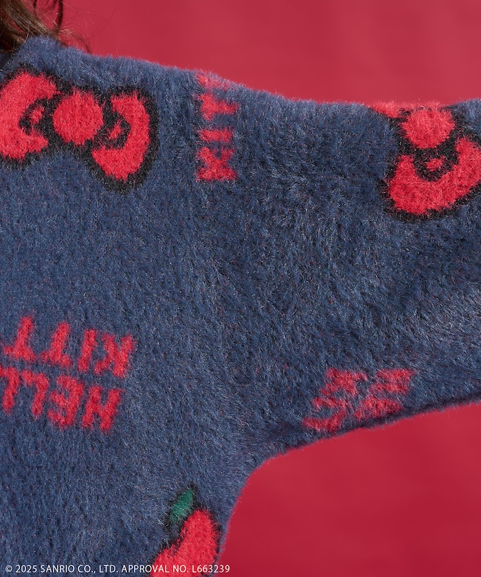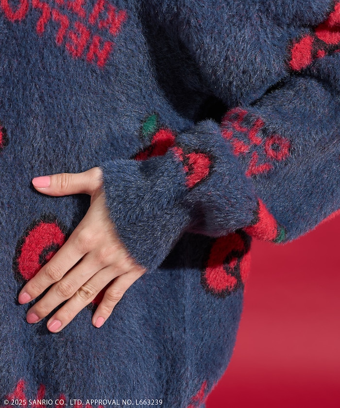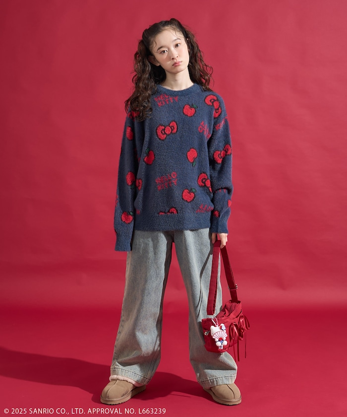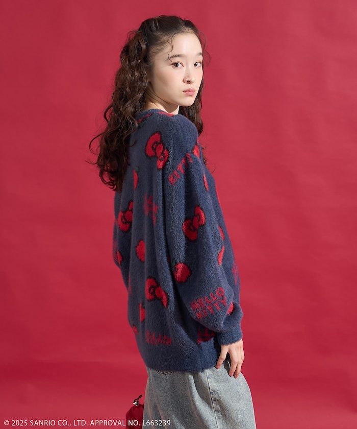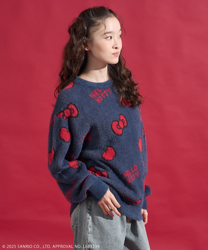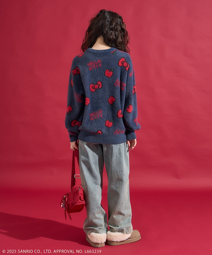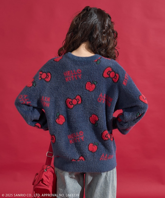 리본과 사과 모티브 패턴의 샤기 니트. 어깨가 살짝 드롭되는 오버사이즈 실루엣입니다.