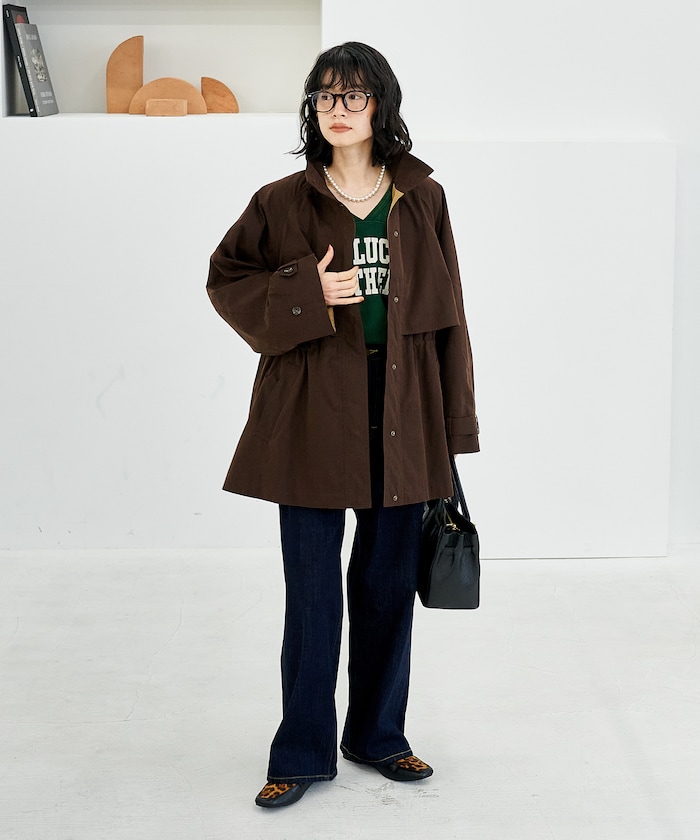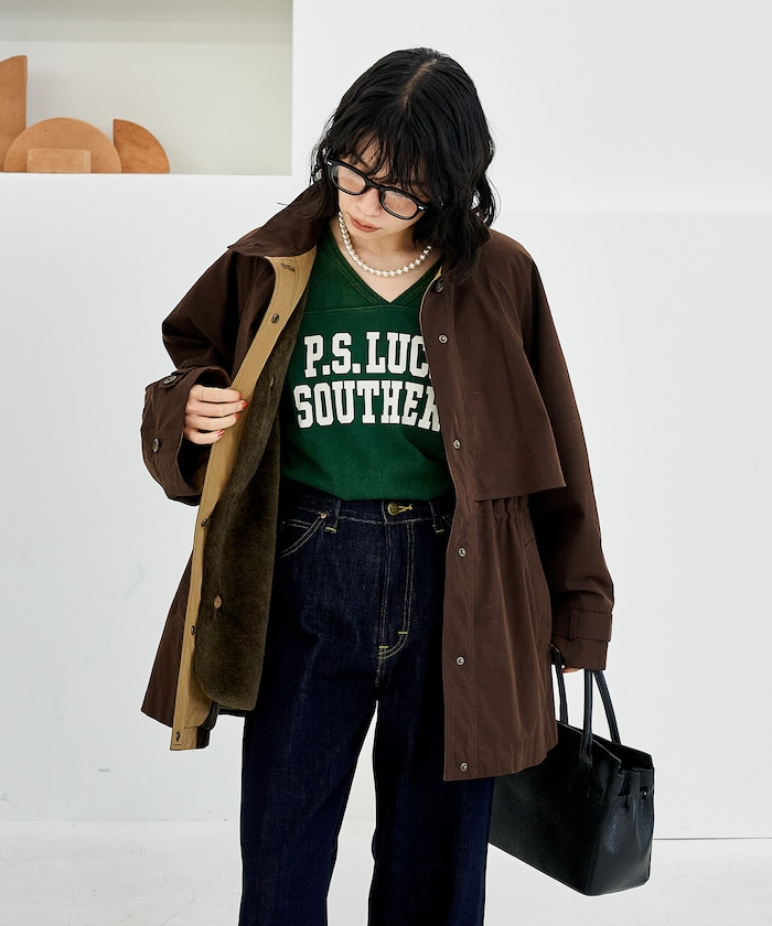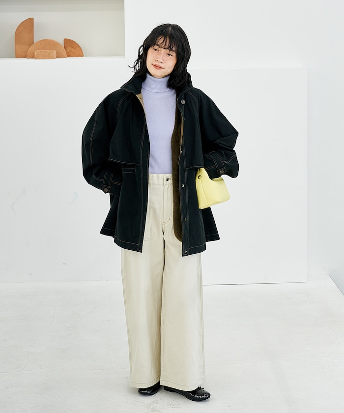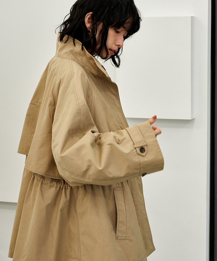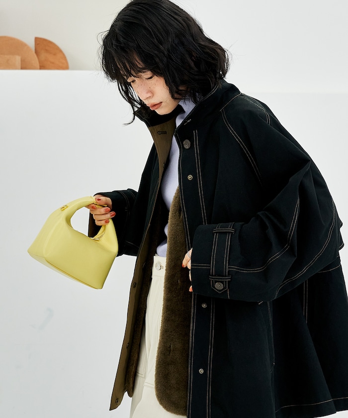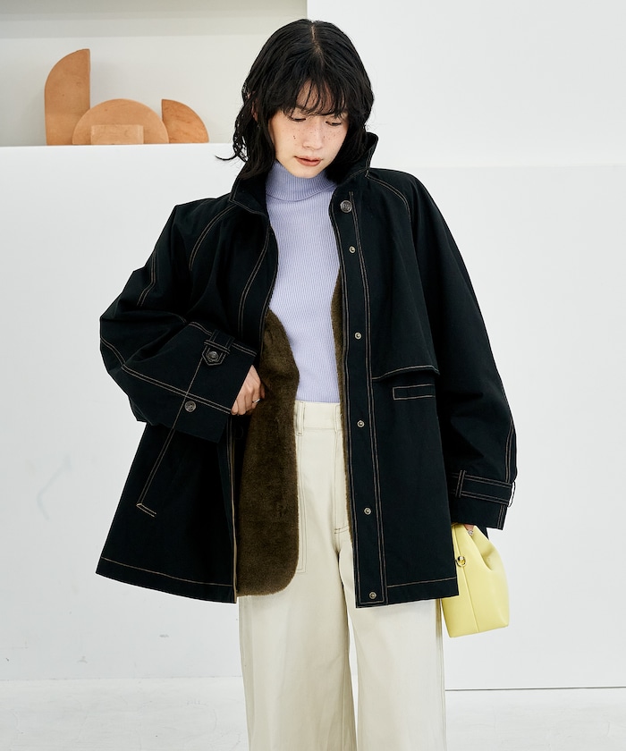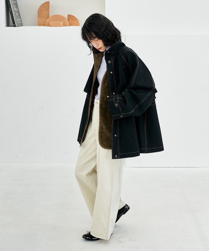 성숙한 분위기의 보아 베스트를 포함한 텐트라인 코트. 코트는 스탠드 칼라와 A 라인 실루엣엡니다. 허리 안쪽의 드로우스트링으로 실루엣 조절이 가능합니다. 보아베스트는 코트 안쪽에 고정해 라이너로 입거나 아우터로 입을 수 있습니다.