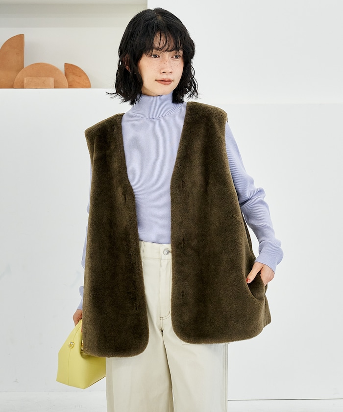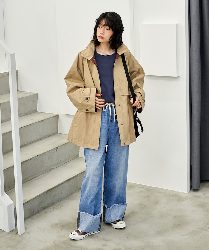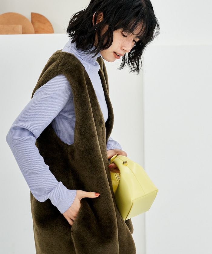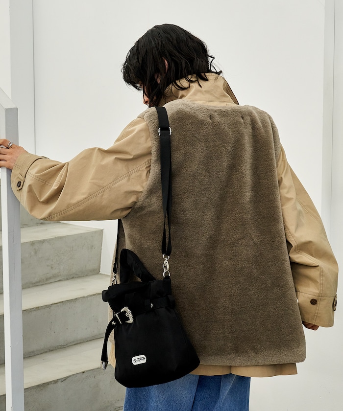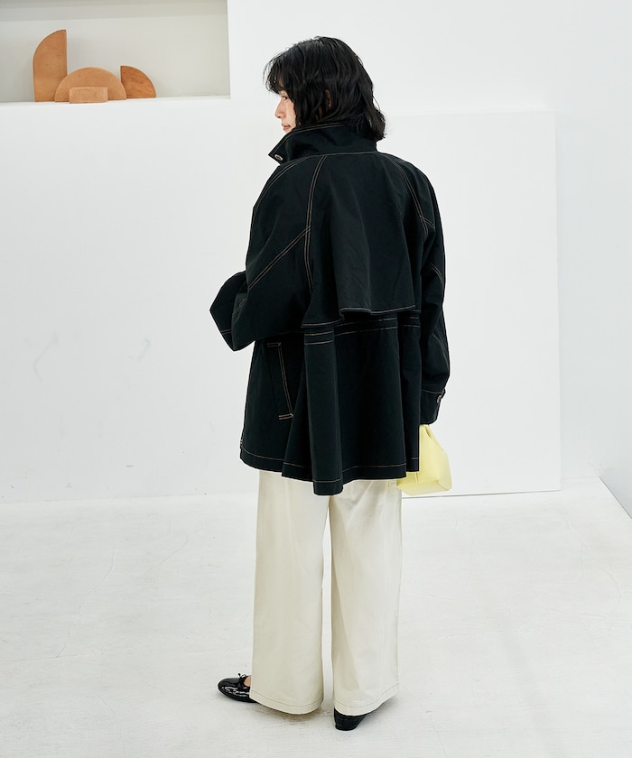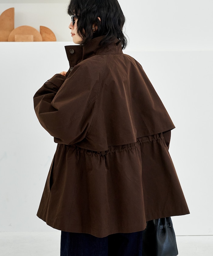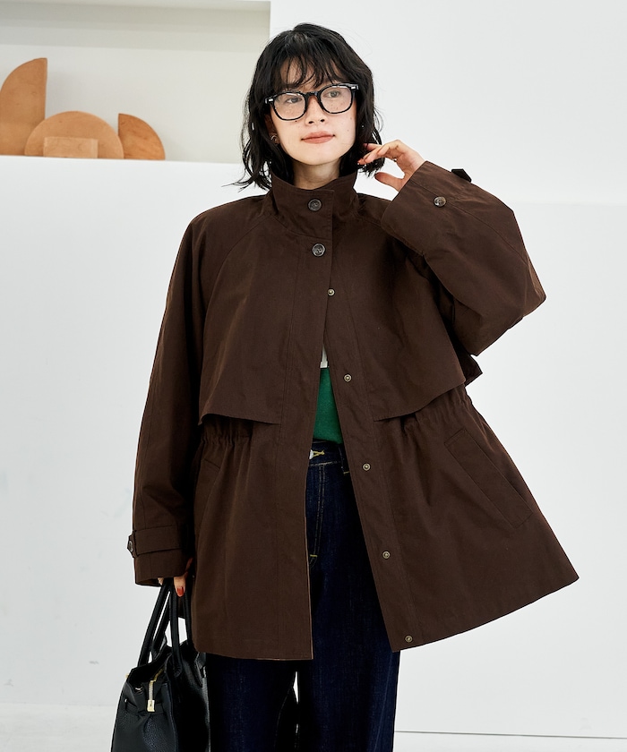 성숙한 분위기의 보아 베스트를 포함한 텐트라인 코트. 코트는 스탠드 칼라와 A 라인 실루엣엡니다. 허리 안쪽의 드로우스트링으로 실루엣 조절이 가능합니다. 보아베스트는 코트 안쪽에 고정해 라이너로 입거나 아우터로 입을 수 있습니다.