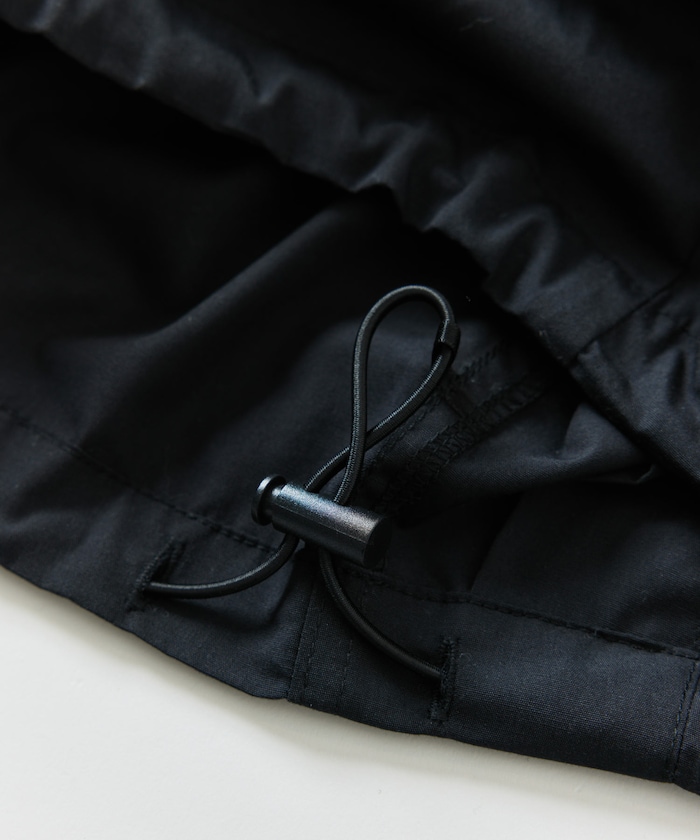 허리는 밴딩과 스핀들이 있으며 밑단에 드로우스트링이 있어 핏을 조절할 수 있습니다.