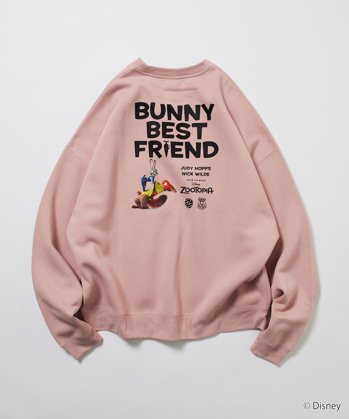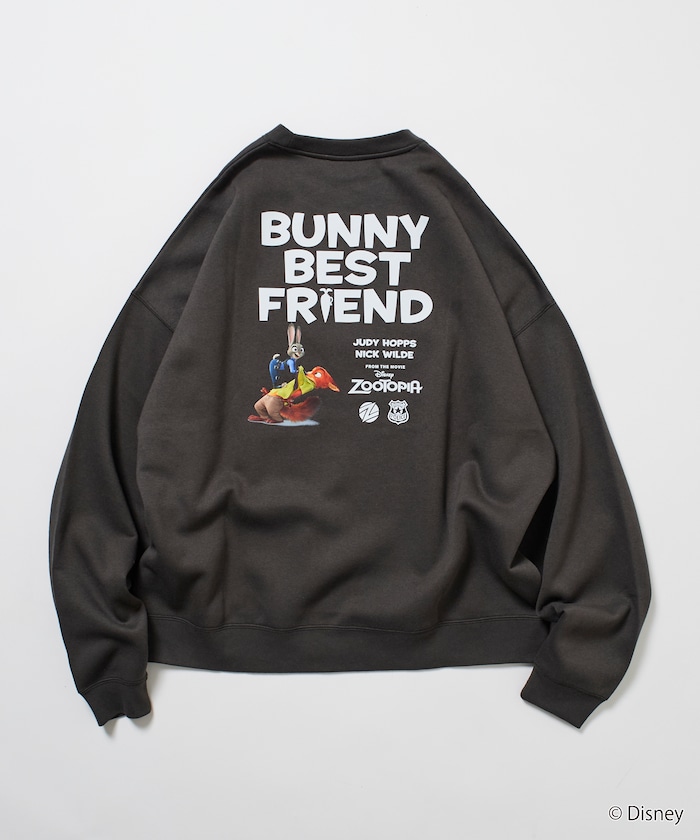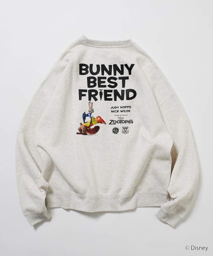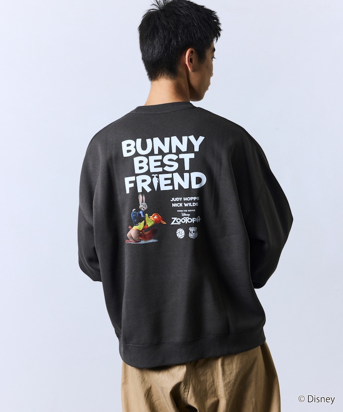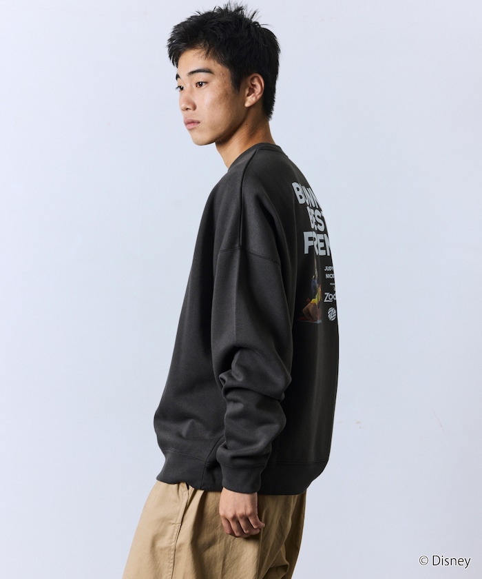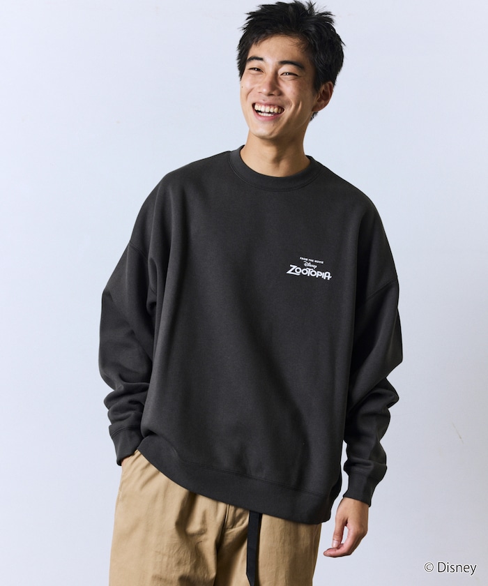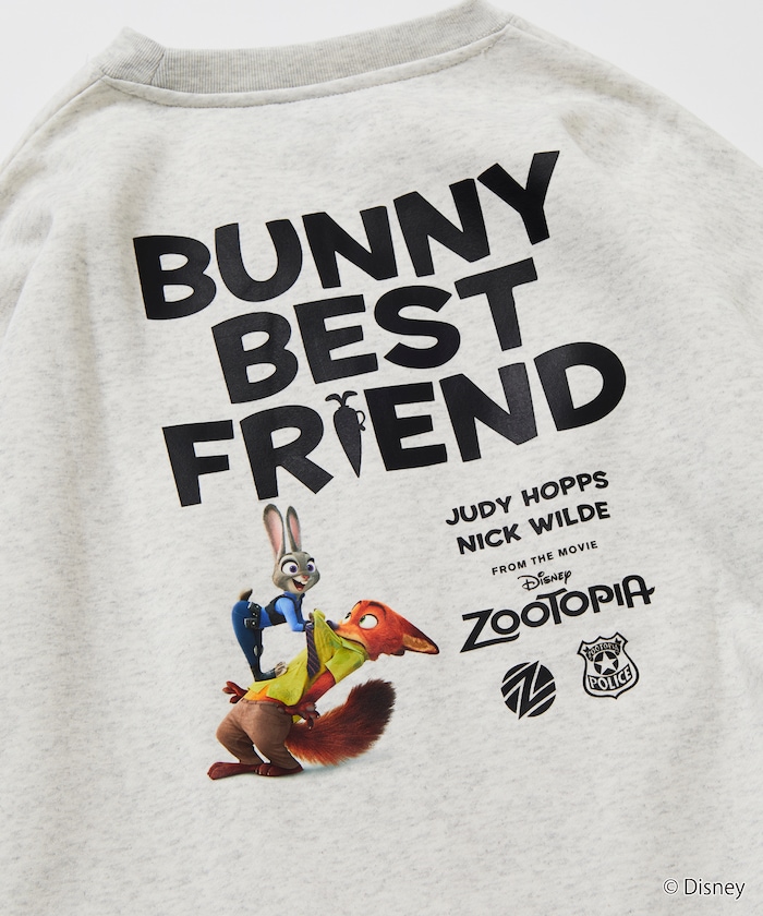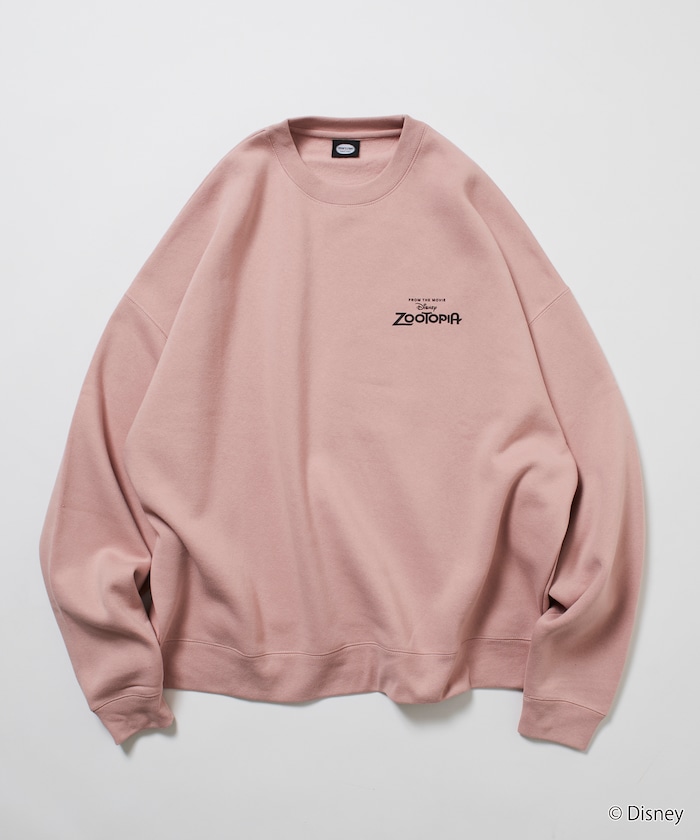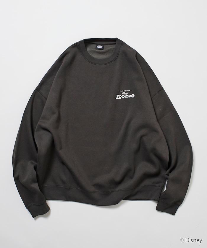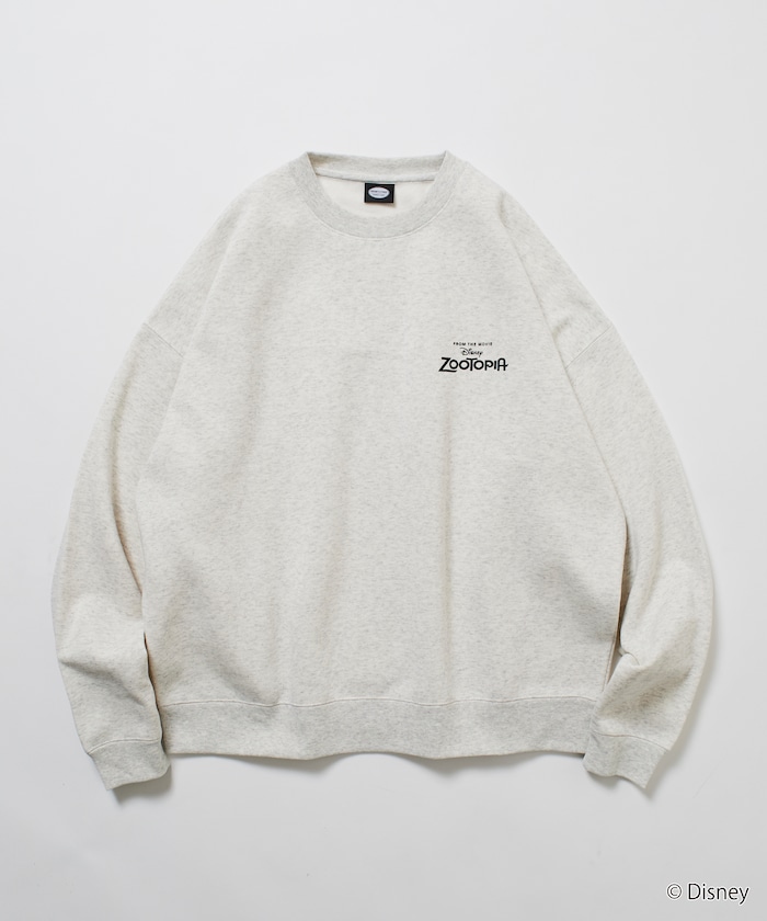 뒷면에 주토피아 그래픽 프린팅이 있는 스웨트 티. 앞면은 심플한 원포인트 디자인입니다. 부드럽고 따뜻한 기모 안감 소재를 사용합니다.