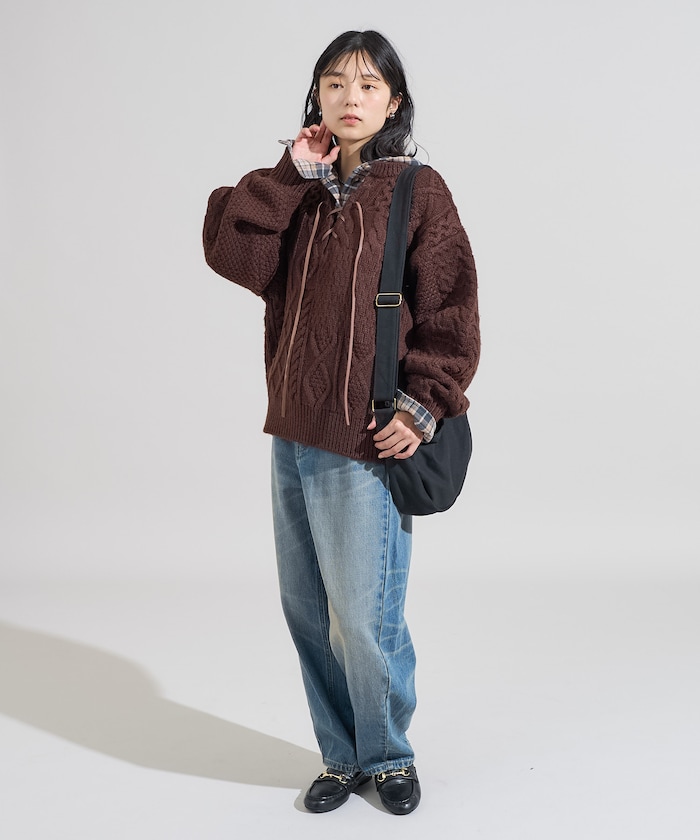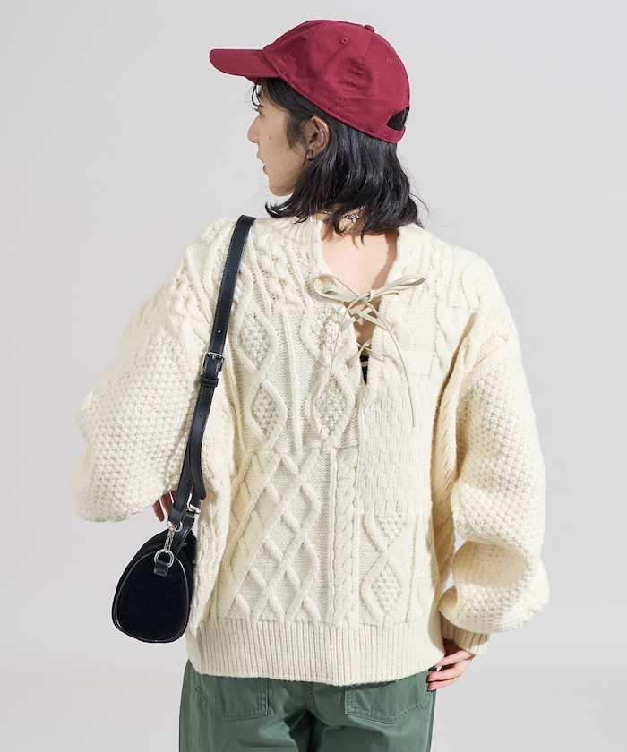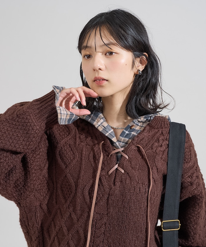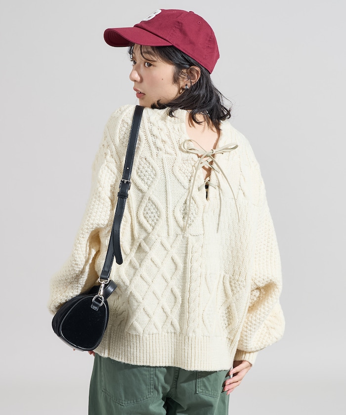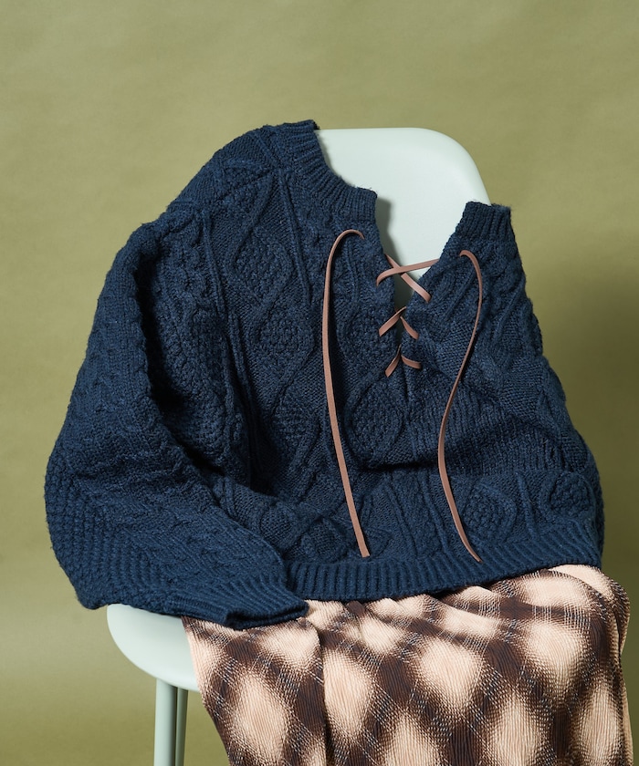 클래식한 케이블 니트를 레이스업 디테일로 리메이크 한 듯한 디자인의 니트. 앞뒤를 2way로 착용 가능하며 도톰한 소재로 겨울까지 입을 수 있습니다. 오버사이즈 실루엣.