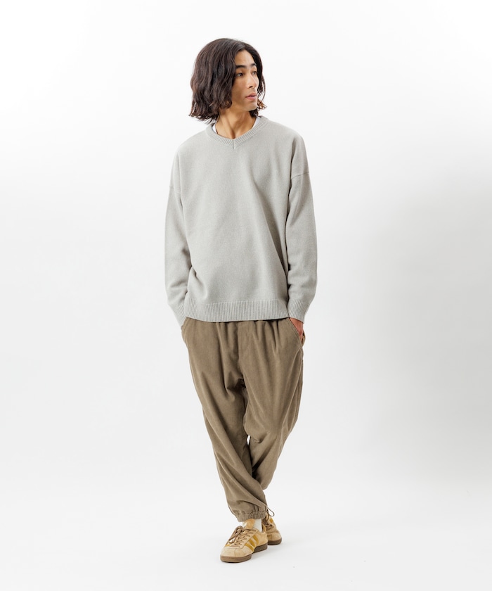 부드러운 코듀로이 소재를 사용하며 허리 밴딩으로 편안합니다. 허벅지는 여유 있고 밑단으로 갈수록 좁아지는 테이퍼드 실루엣입니다.