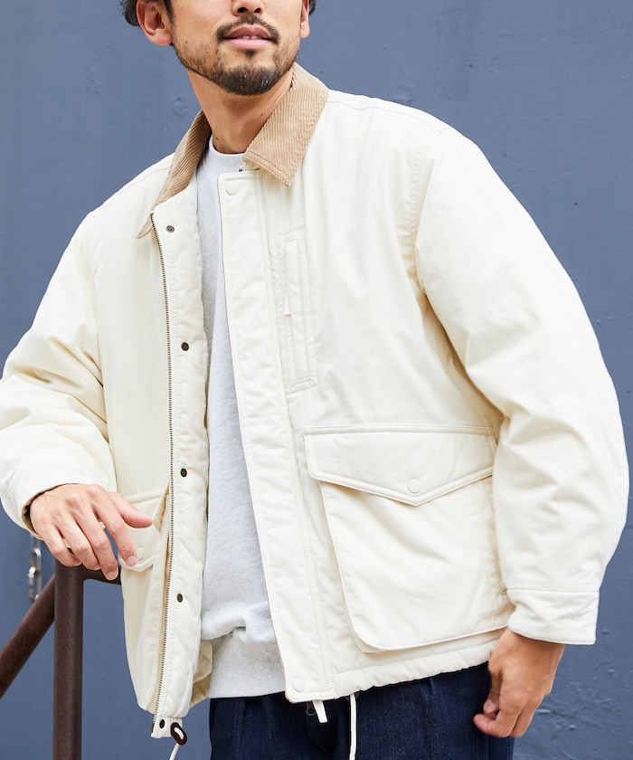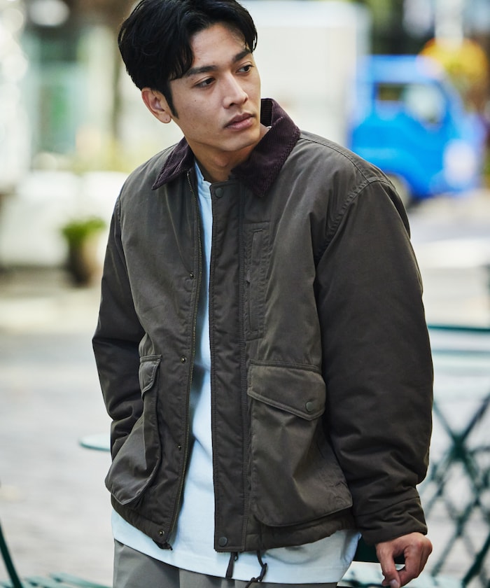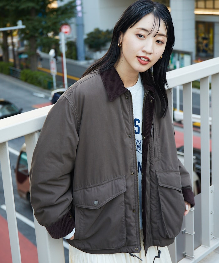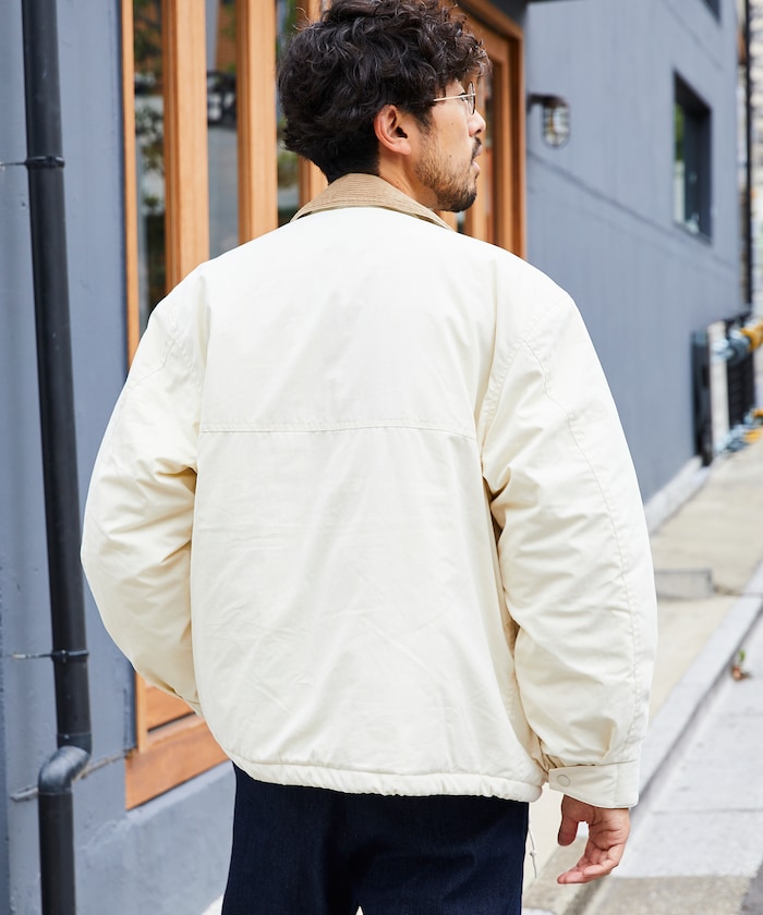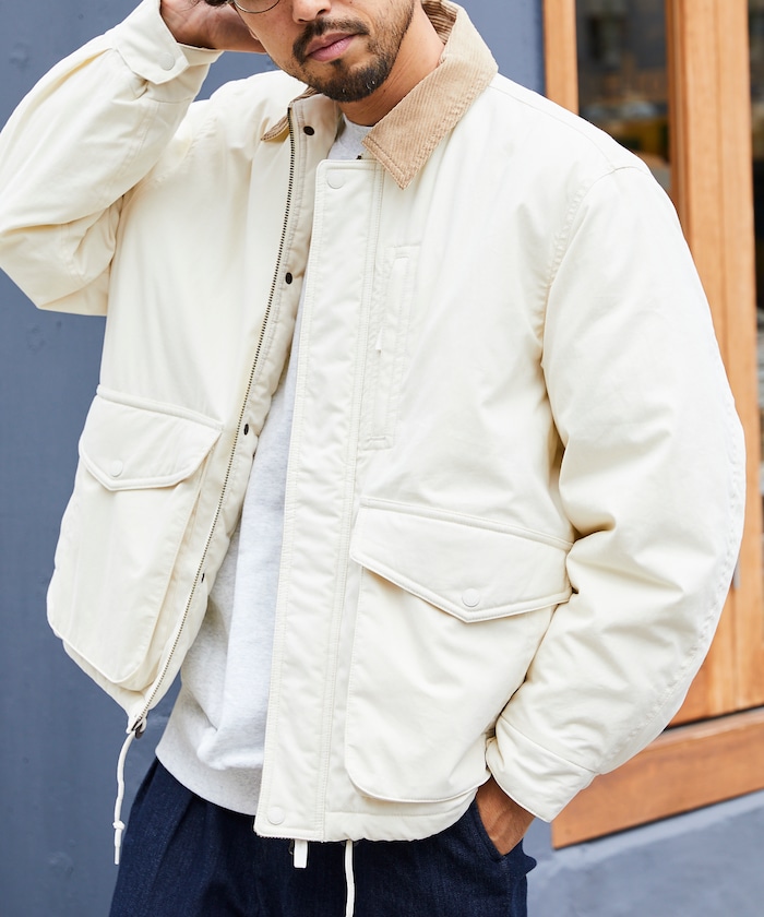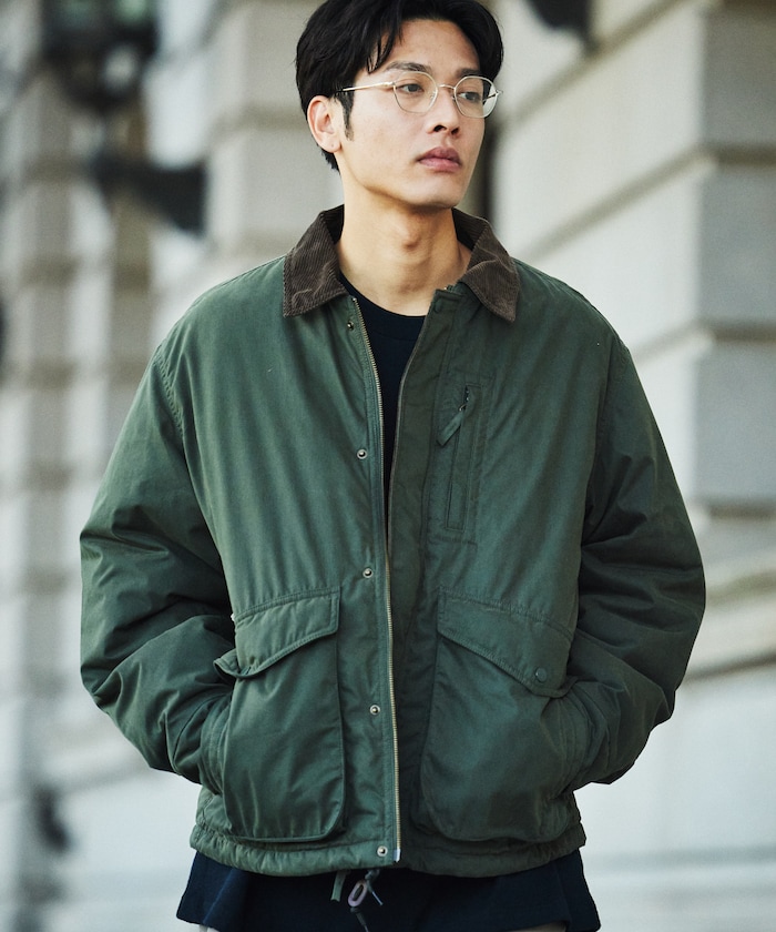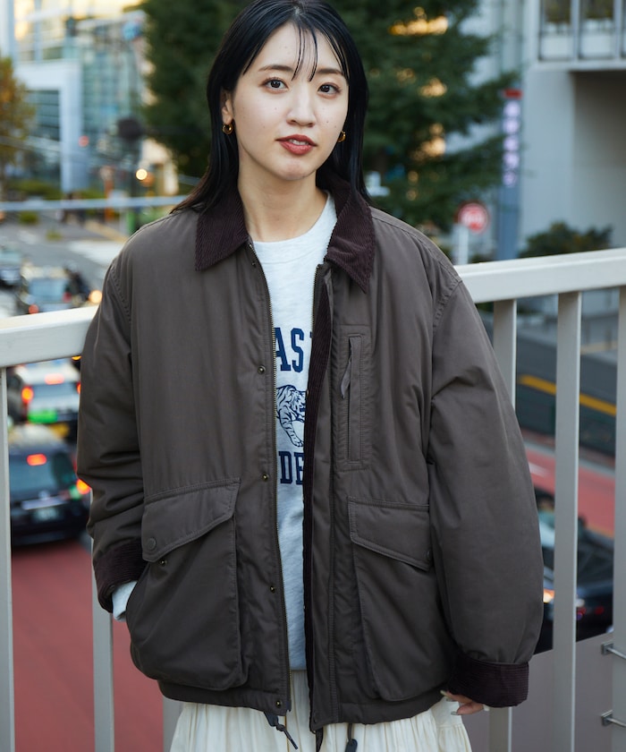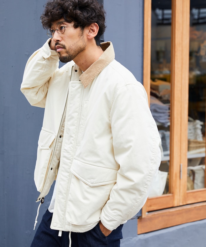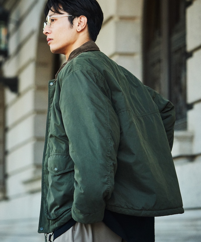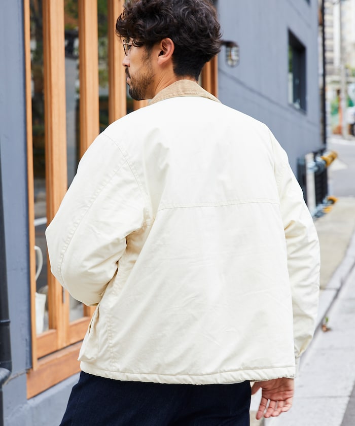 코튼 나일론 혼방 소재의 재킷. 칼라는 코듀로이 사양입니다. 양 사이드에 조금 큰 슬래시 포켓이 있으며 가슴에 지퍼 포켓이 있습니다. 겉감은 조금 기모감이 있습니다. 드롭숄더로 적당히 느긋한 박스 실루엣입니다.