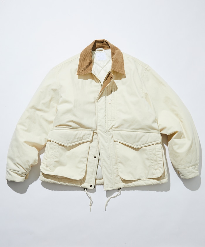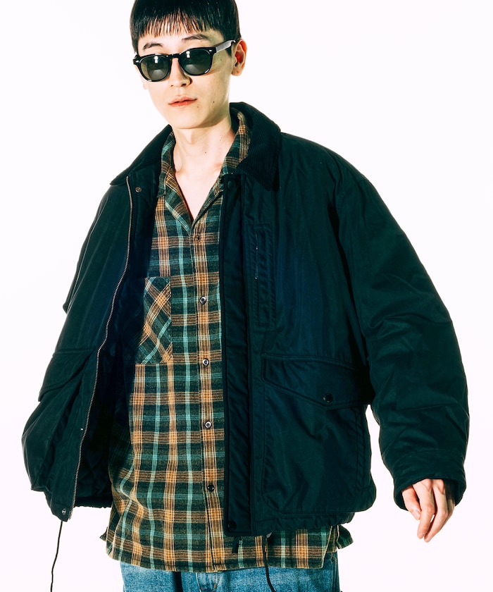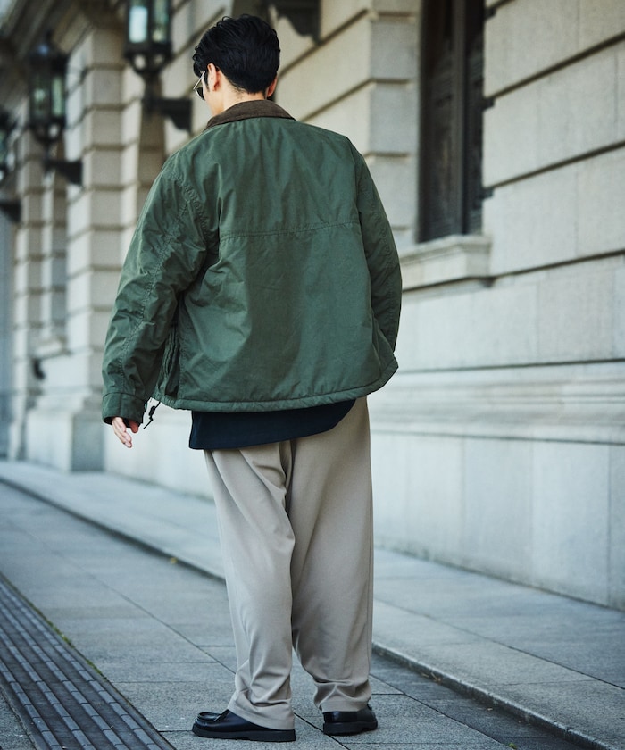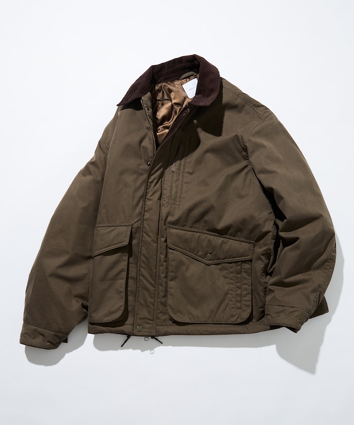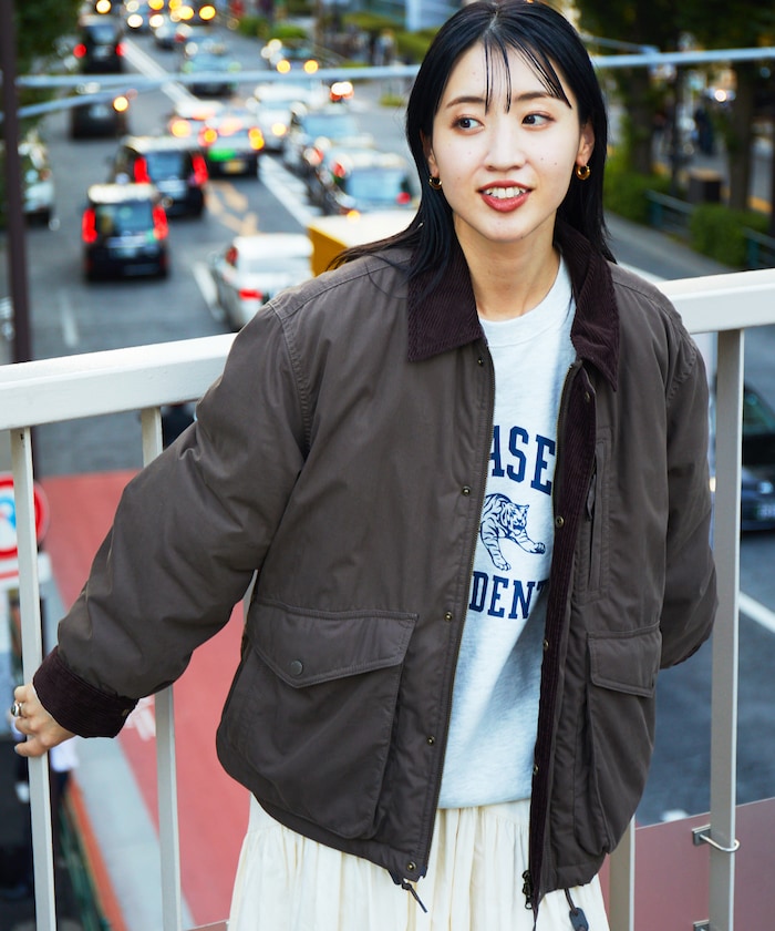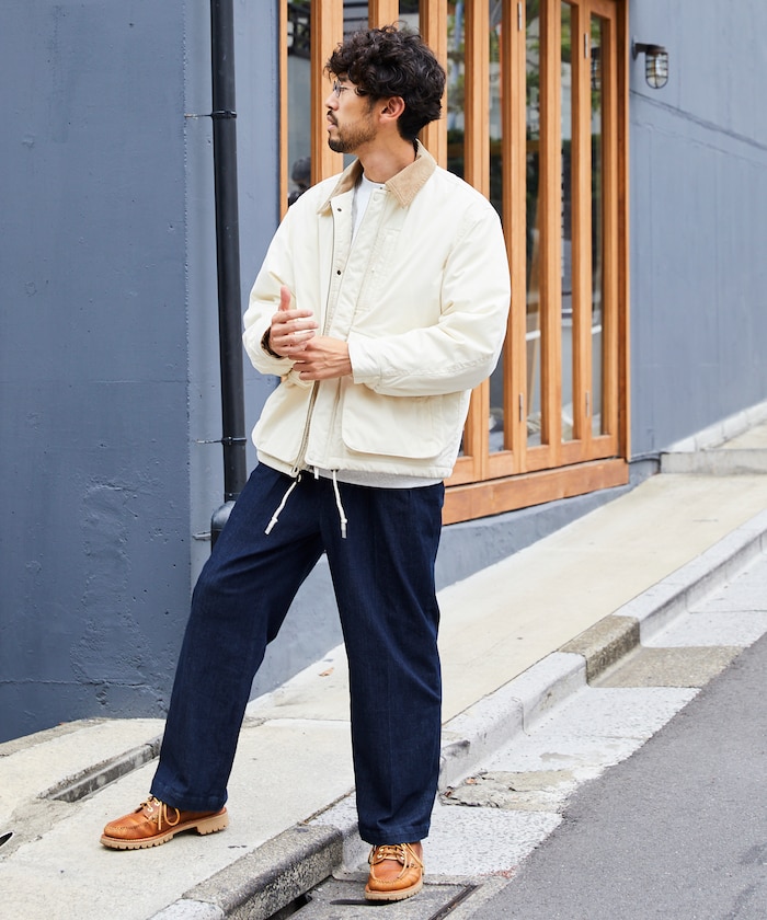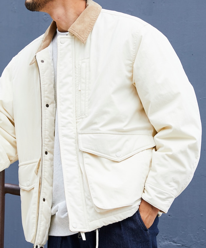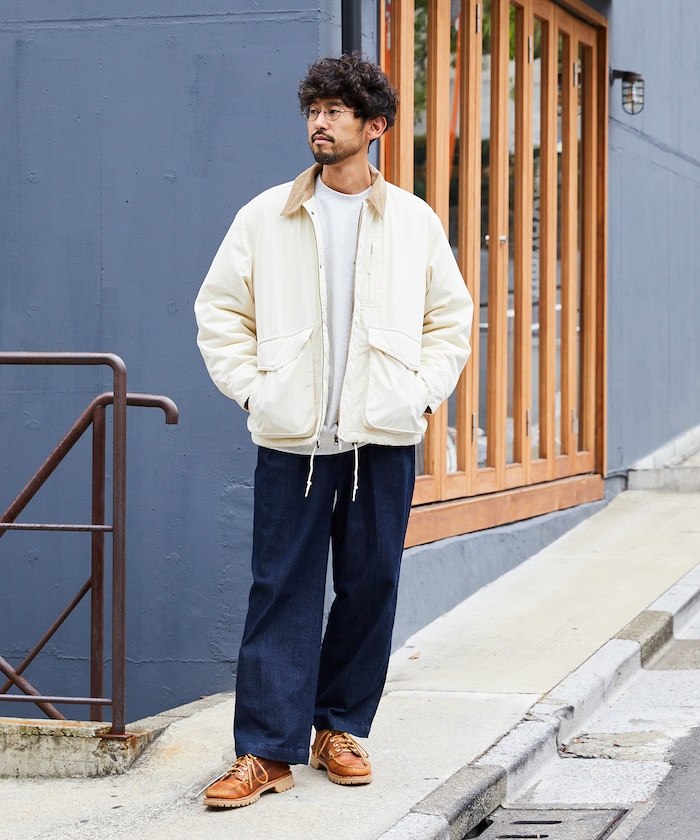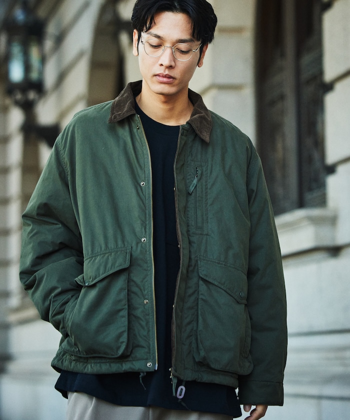 코튼 나일론 혼방 소재의 재킷. 칼라는 코듀로이 사양입니다. 양 사이드에 조금 큰 슬래시 포켓이 있으며 가슴에 지퍼 포켓이 있습니다. 겉감은 조금 기모감이 있습니다. 드롭숄더로 적당히 느긋한 박스 실루엣입니다.