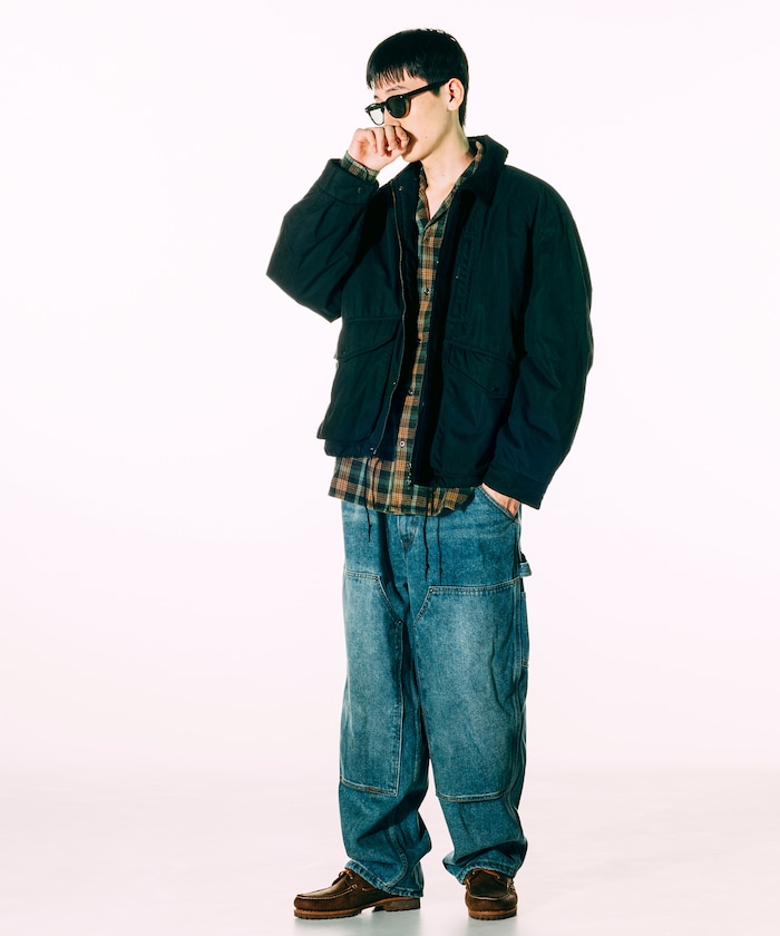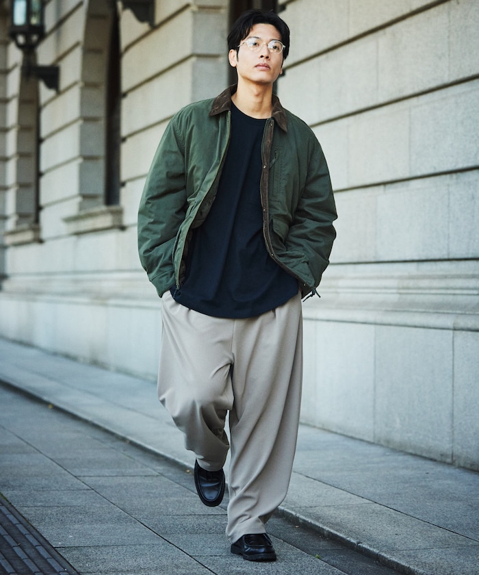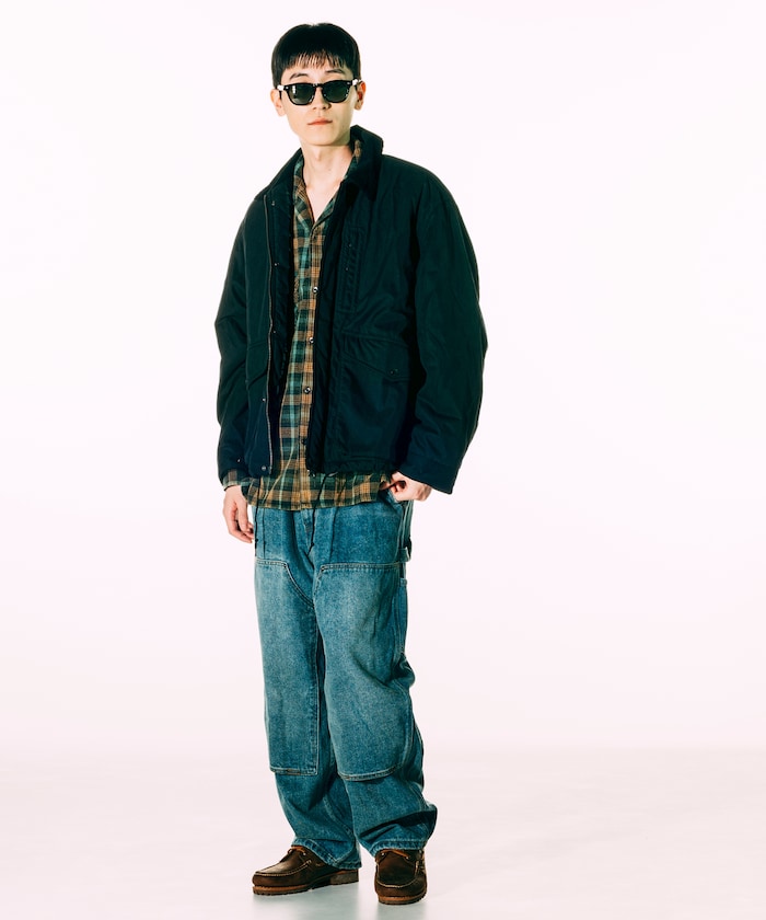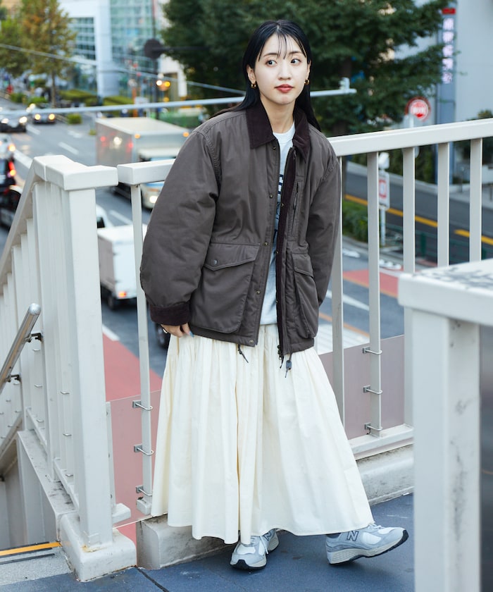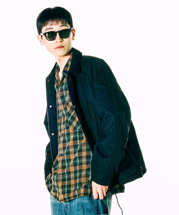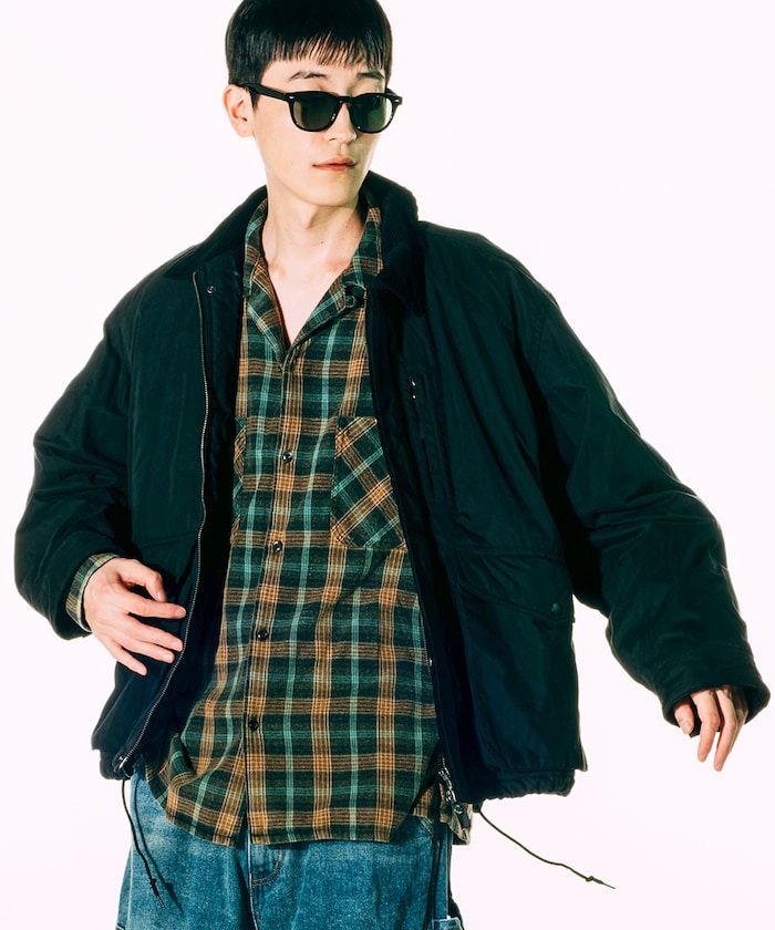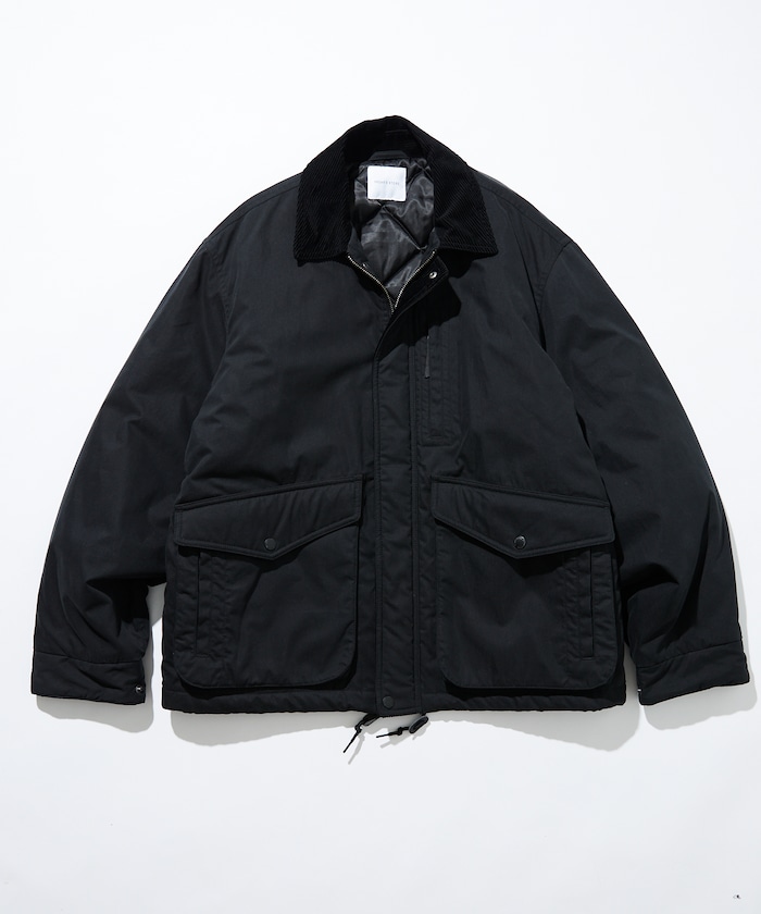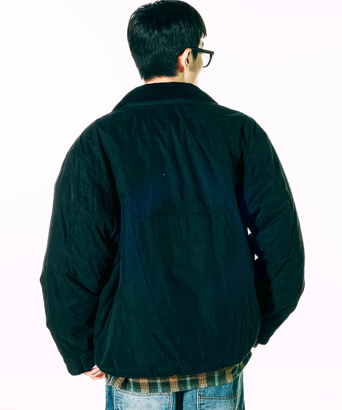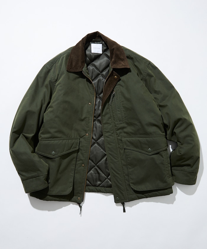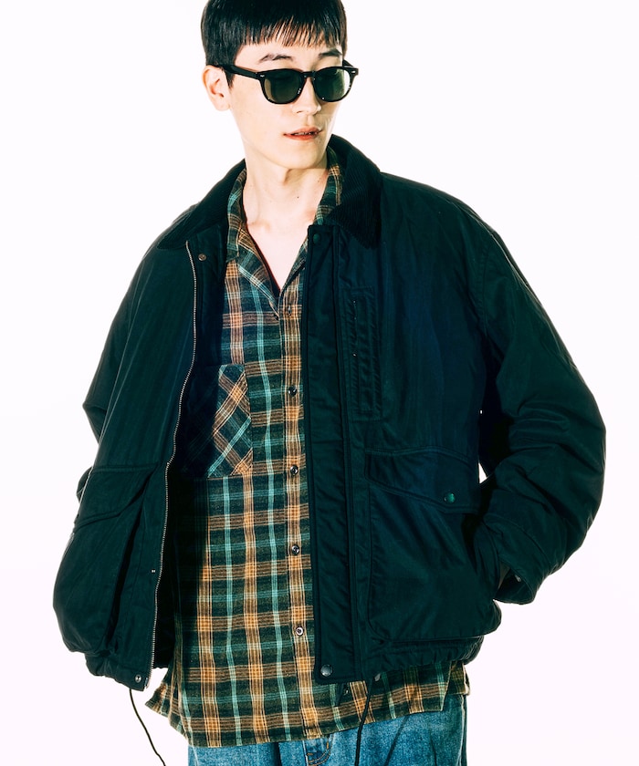 코튼 나일론 혼방 소재의 재킷. 칼라는 코듀로이 사양입니다. 양 사이드에 조금 큰 슬래시 포켓이 있으며 가슴에 지퍼 포켓이 있습니다. 겉감은 조금 기모감이 있습니다. 드롭숄더로 적당히 느긋한 박스 실루엣입니다.