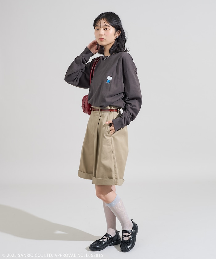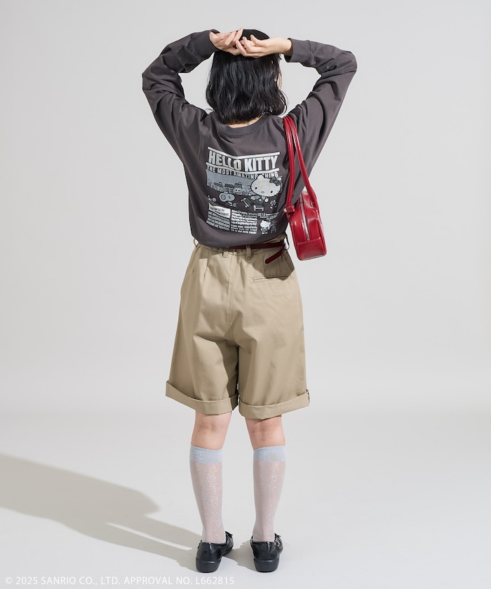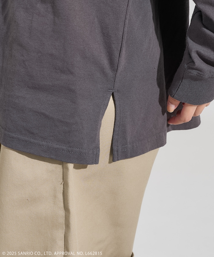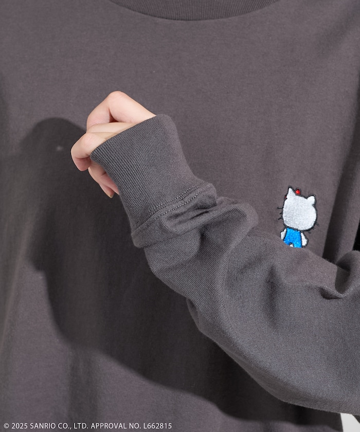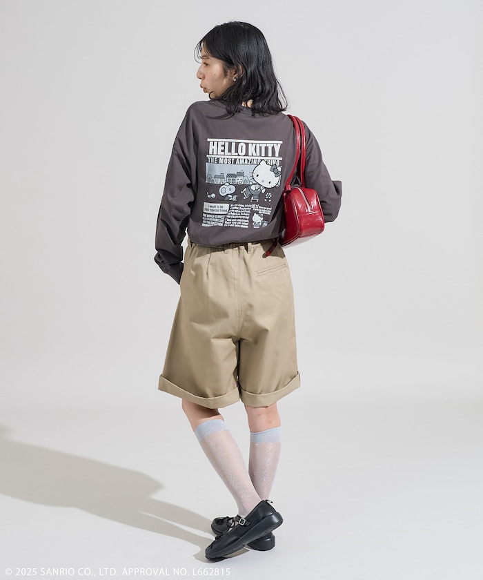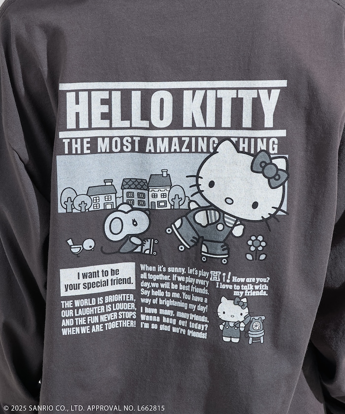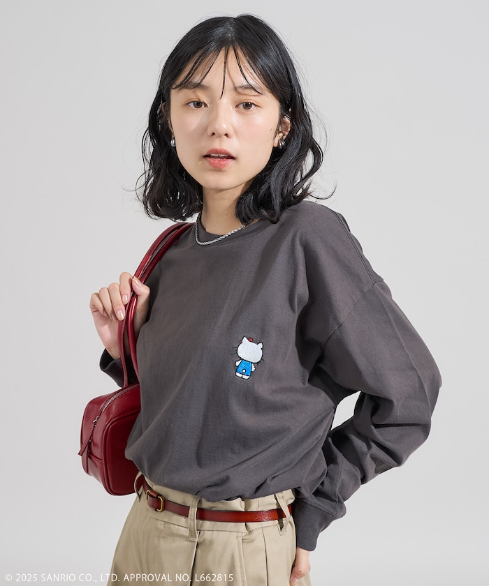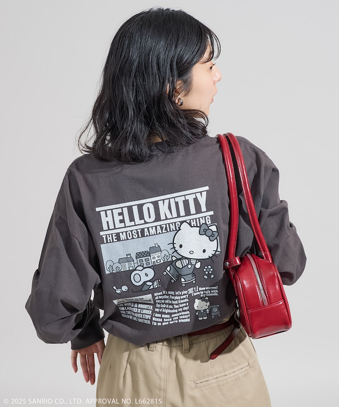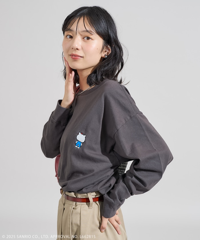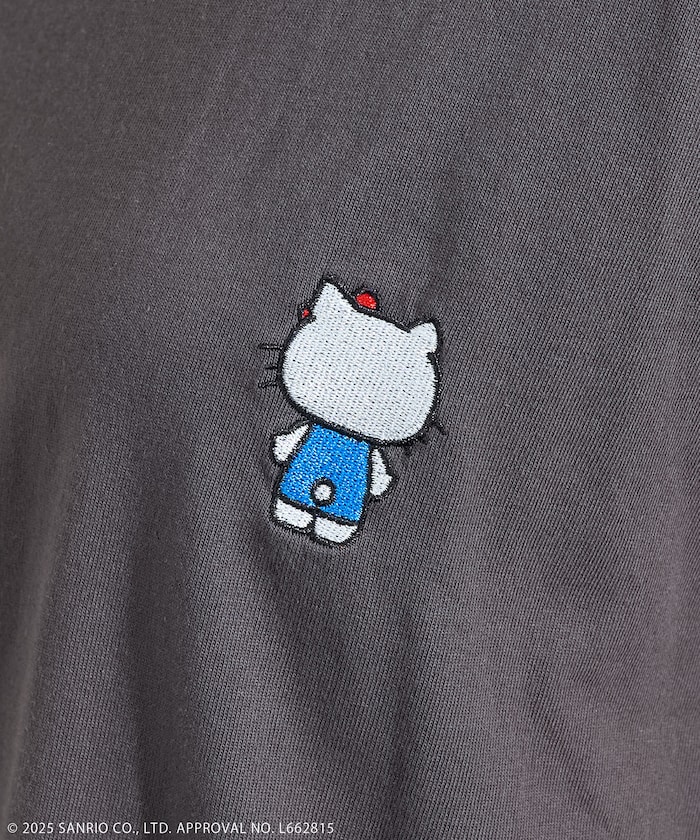 전면에는 뒤돌아선 헬로 키티 가 작게 프린트되어 은근한 포인트가 있습니다. 루즈핏 실루엣