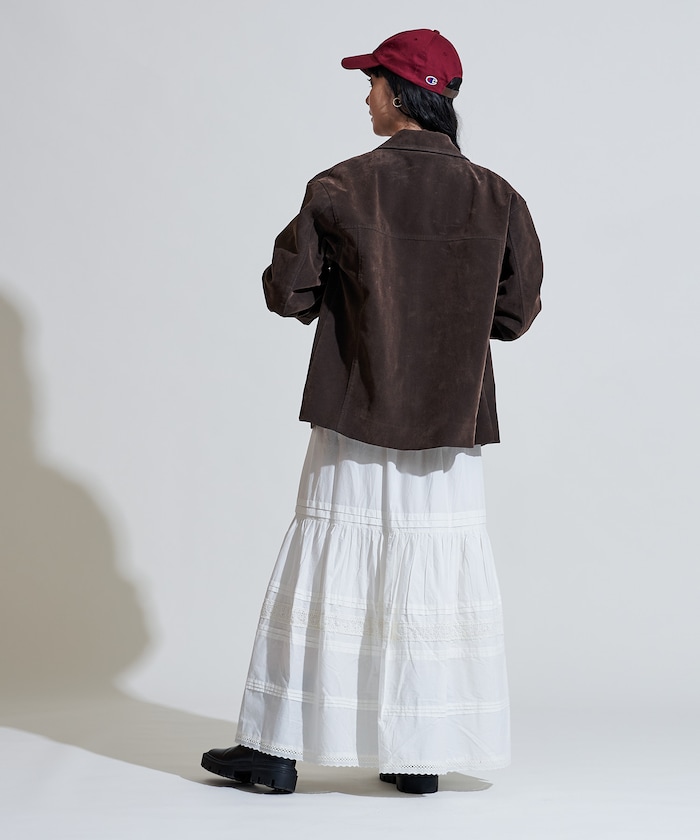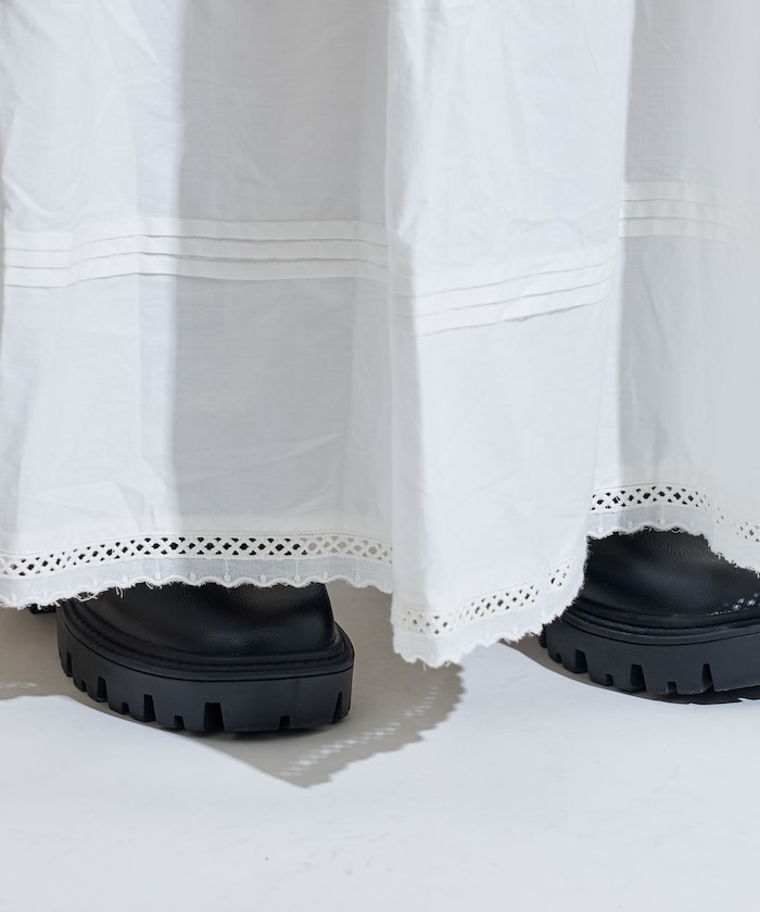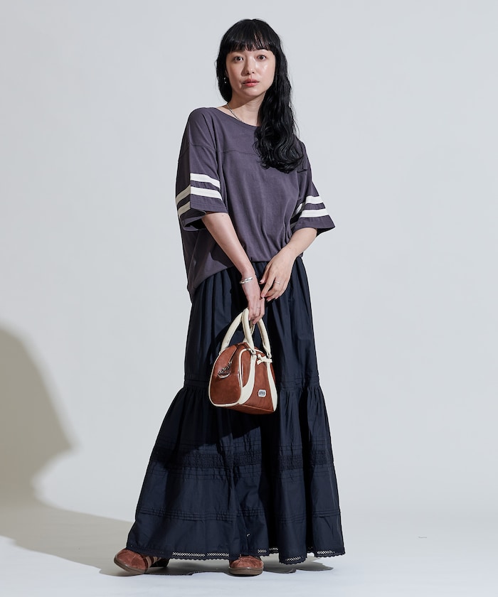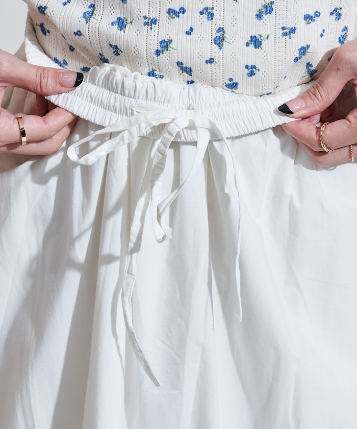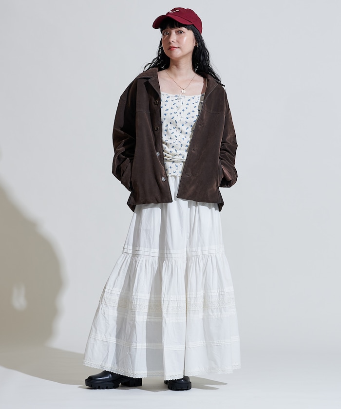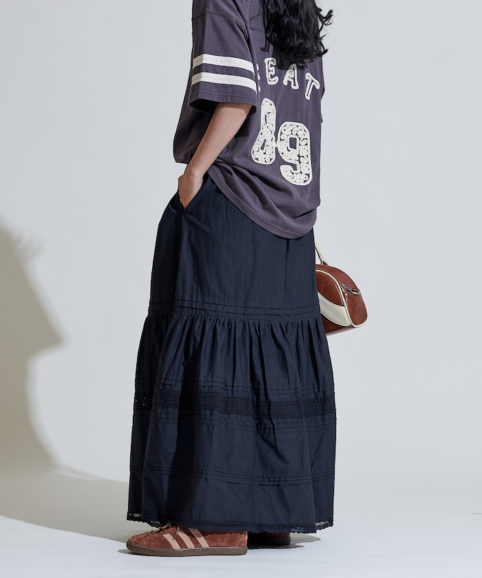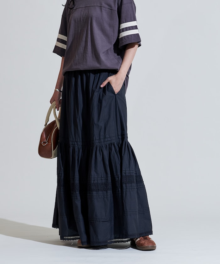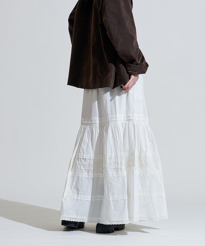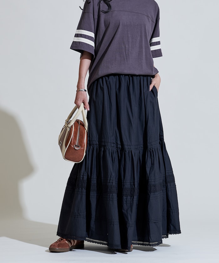 티어드와 턱 디자인의 우아한 플레어 실루엣 스커트.