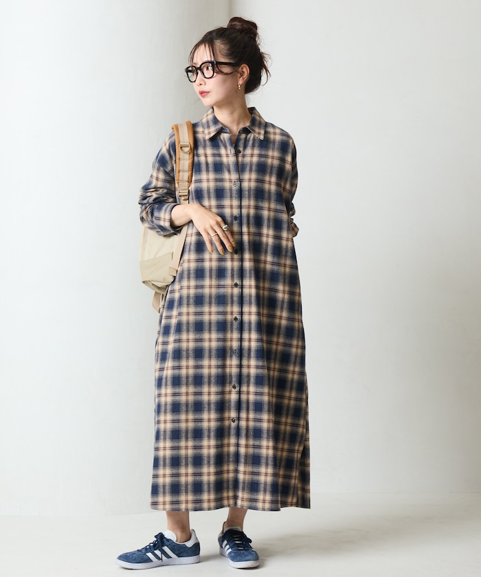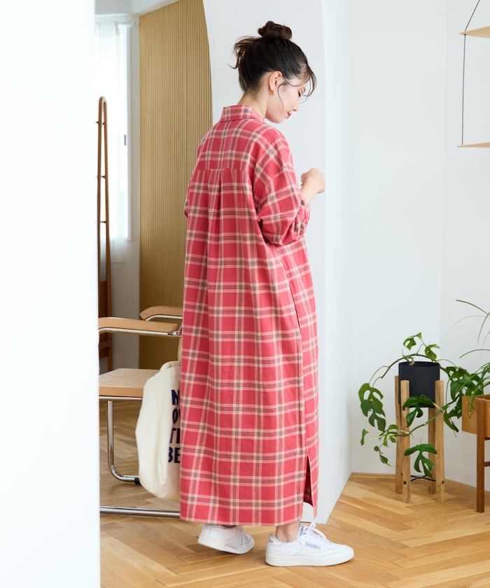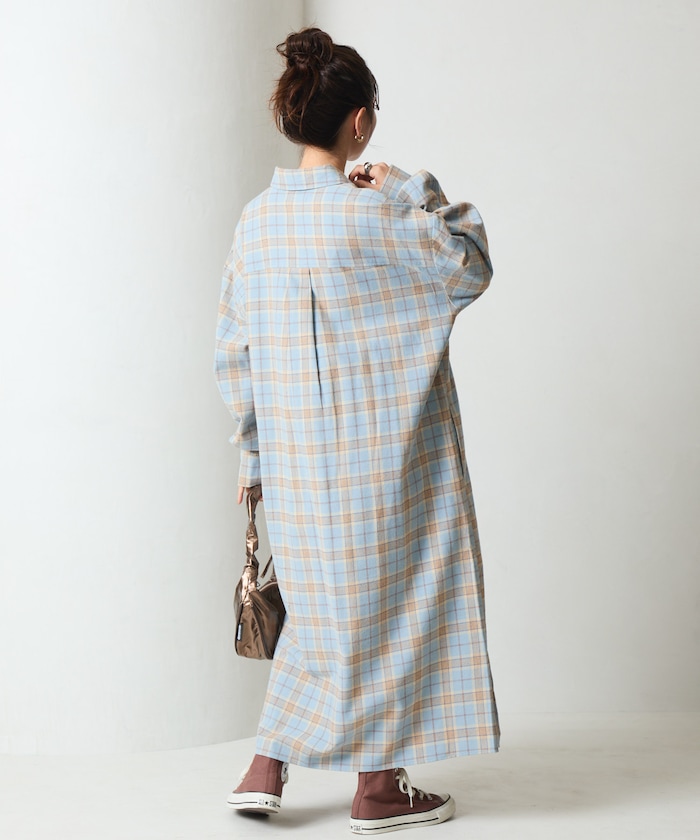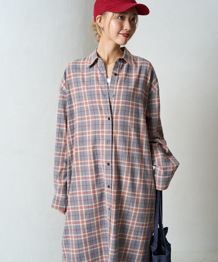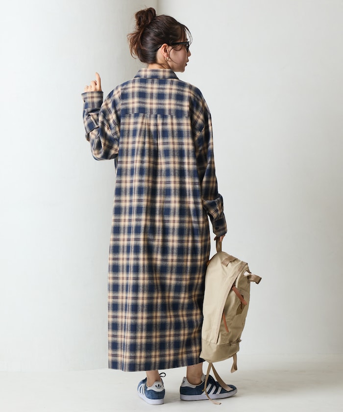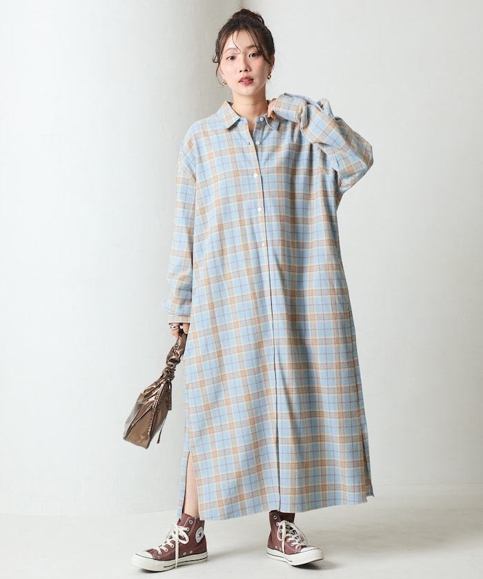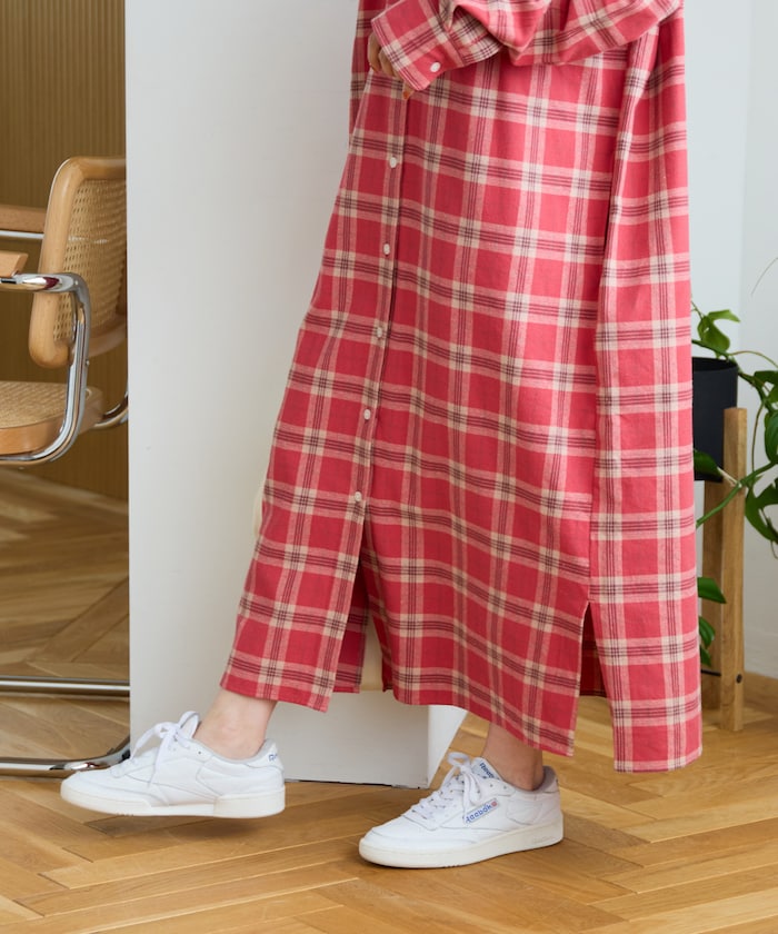 부드럽고 폭신한 플란넬 소재의 원피스. 사이드 포켓이 있으며 종아리까지 내려오는 긴 길이입니다.