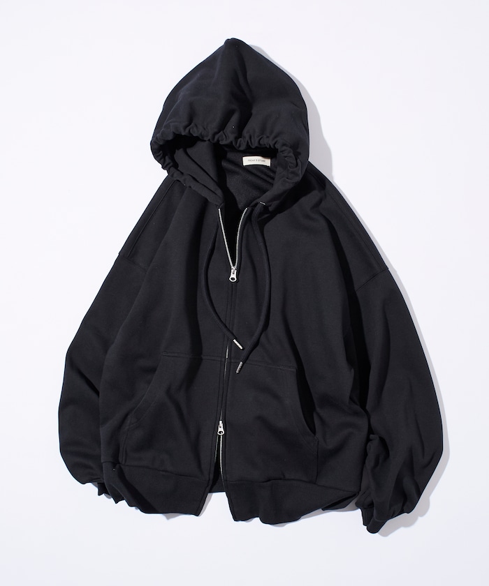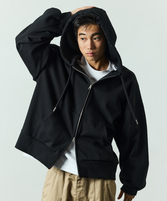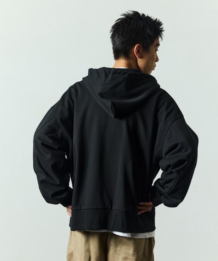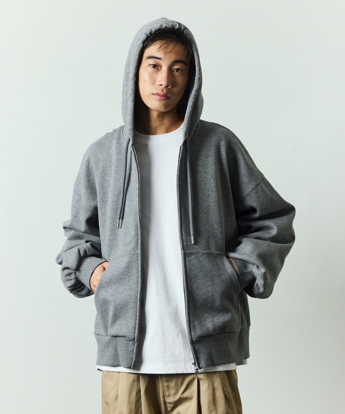 바인딩 공법 으로 제작되어 탄탄하면서도 부드럽고 가벼운 소재의 후드 집업. 서로 다른 소재를 조합하여 보온성, 경량감을 구현했습니다. 여유 있는 빅실루엣입니다.