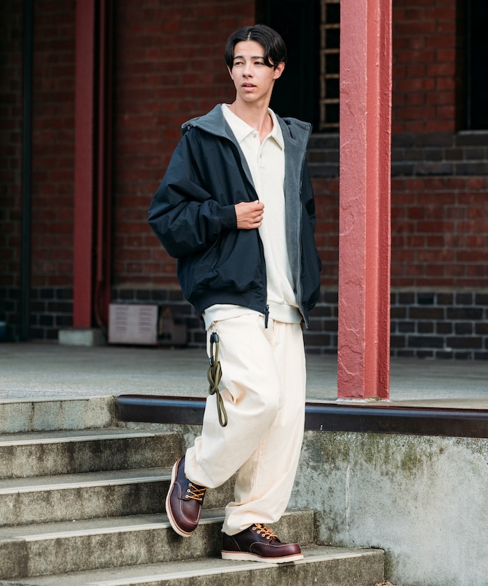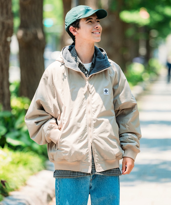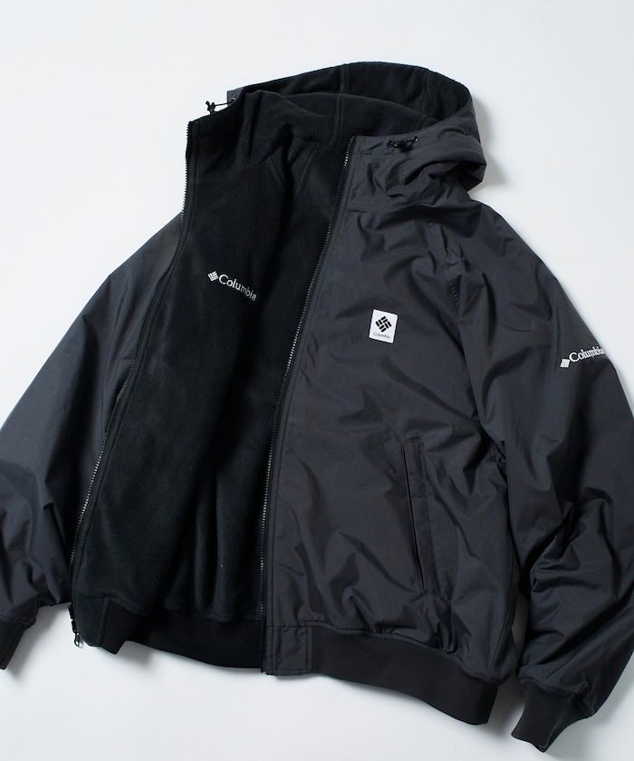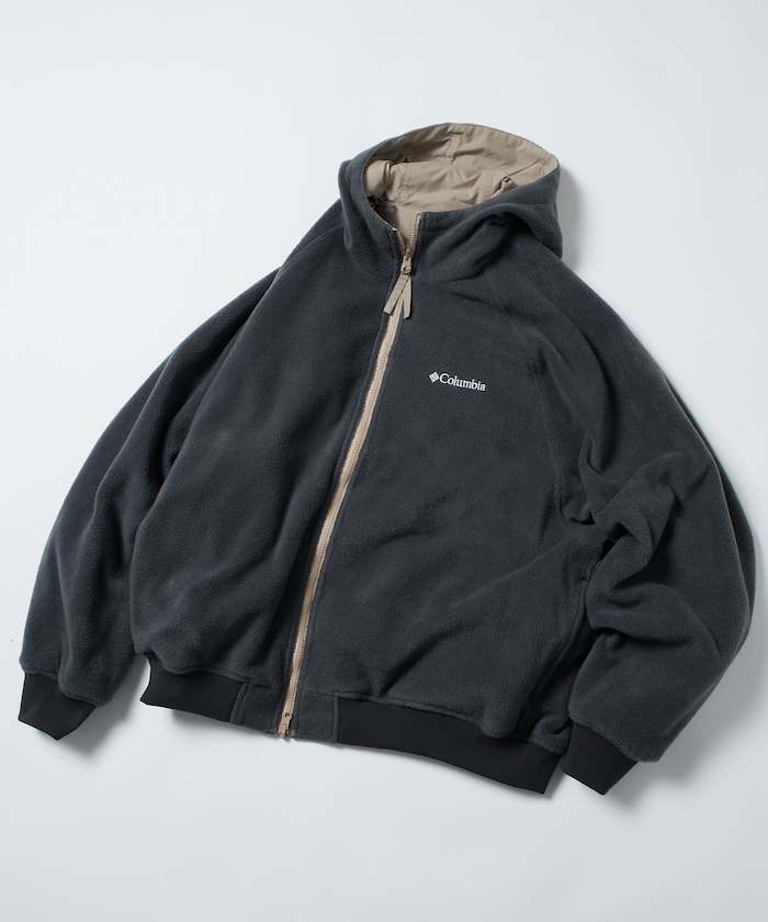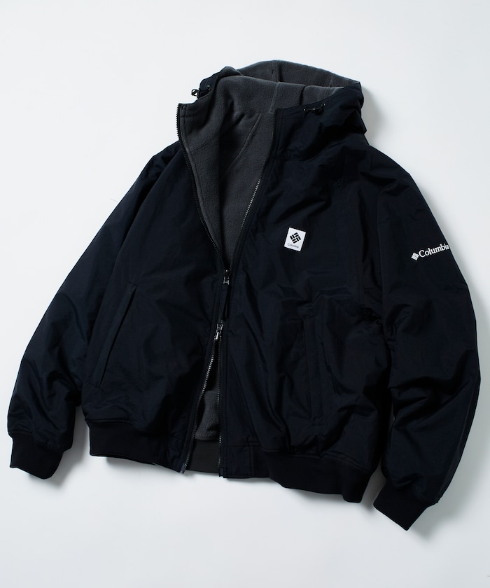 겉감은 탄탄한 나일론, 안감은 부드러운 마이크로 플리스 소재로 리버시블이 가능한 후드 블루종. 가슴과 소매에 브랜드 로고 포인트가 있습니다.