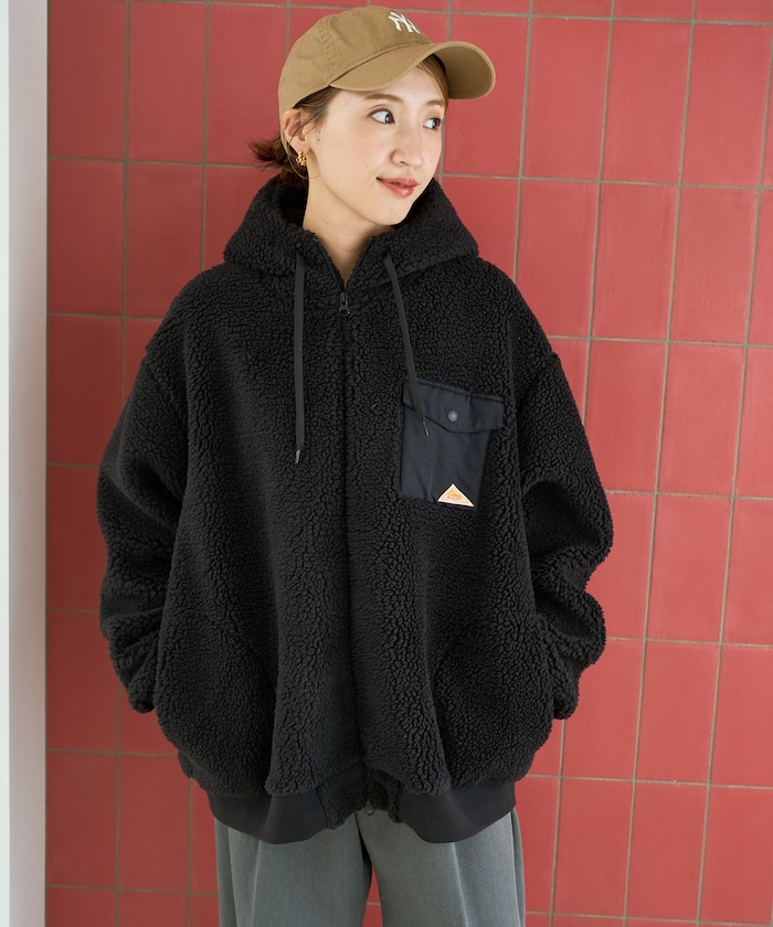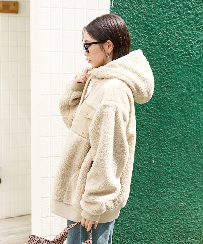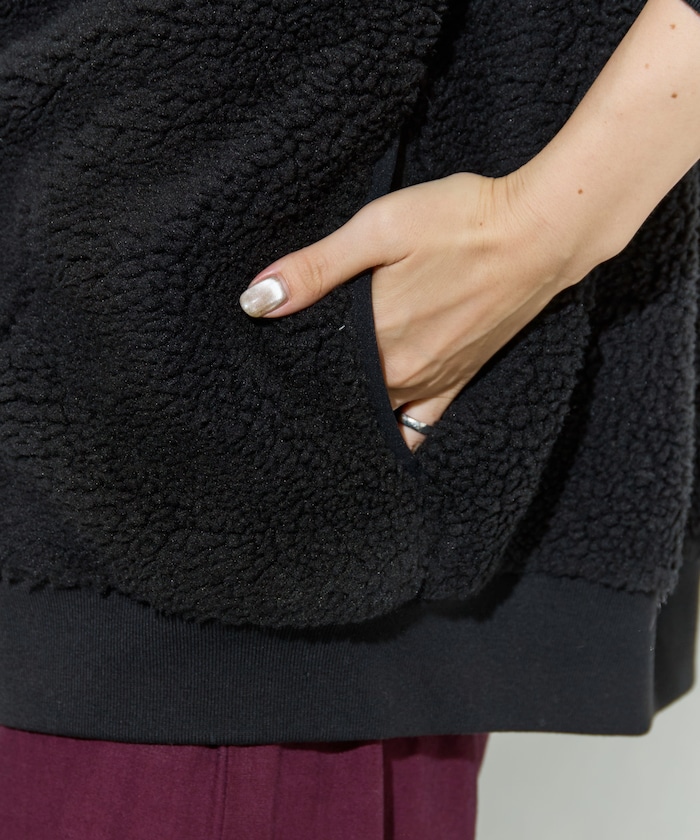 부드럽고 따뜻한 보아 소재로 두꺼운 이너도 여유 있게 입을 수 있는 오버핏 미들 코트. 왼쪽 가슴의 나일론 포켓과 로고 포인트가 있습니다.