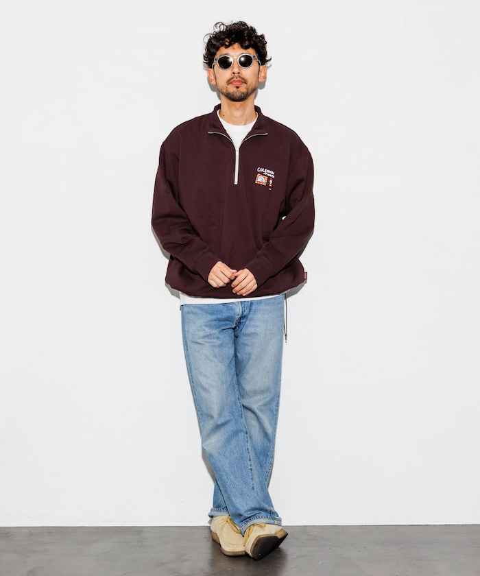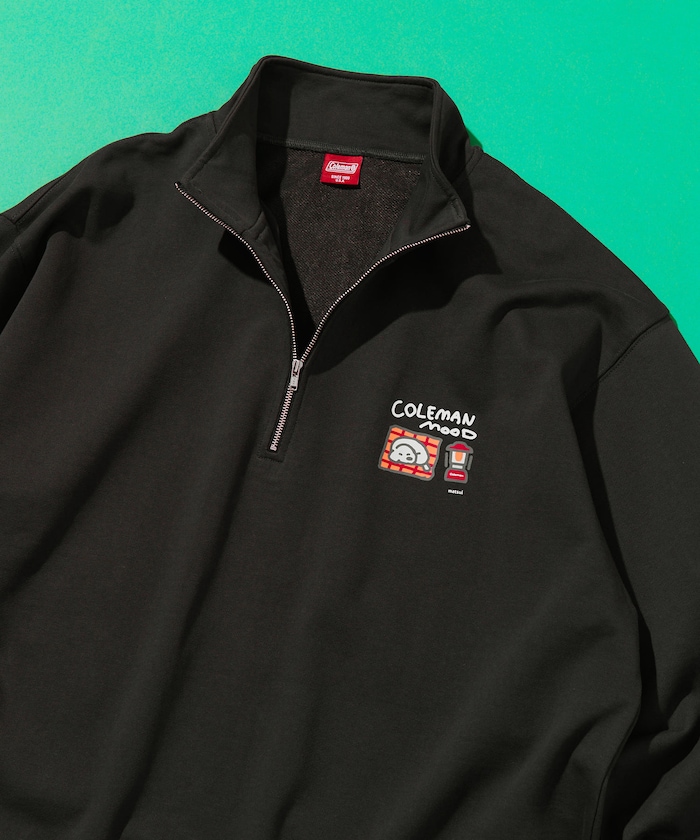 인기 아웃도어 브랜드 Coleman의 별주 하프집 스웨트 티. 앞면에 미니 포인트, 뒷면에 과감한 백 프린트가 있습니다.