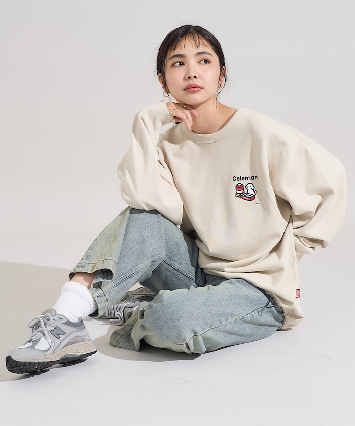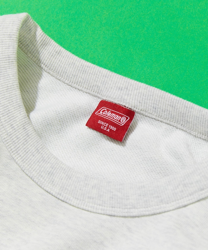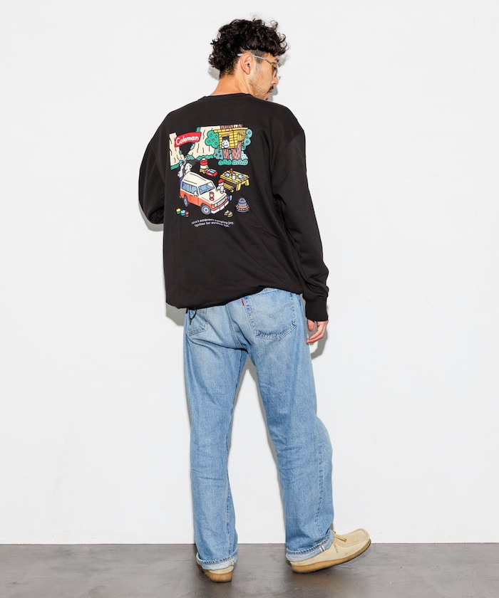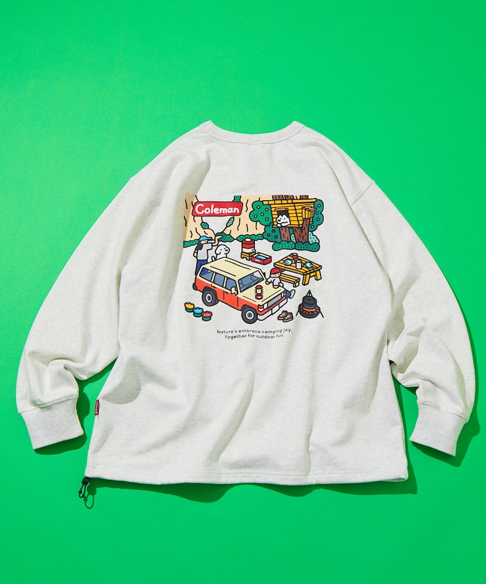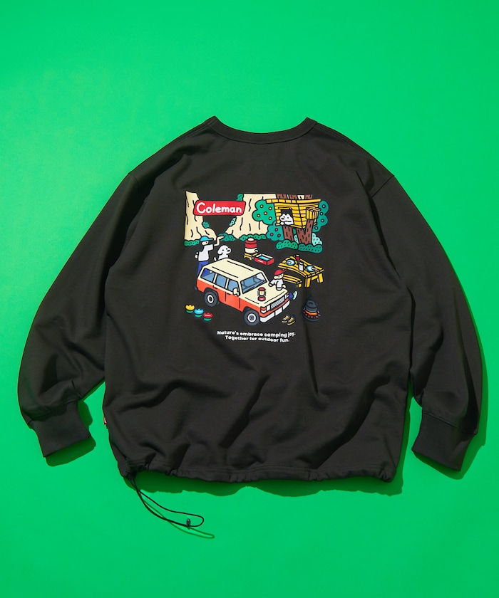 인기 아웃도어 브랜드 Coleman의 별주 크루넥 스웨트 티. 앞면에 워터 저그와 강아지 일러스트 포인트가 있으며 뒷면에 임팩트 있는 프린팅이 있습니다. 밑단 드로우코드로 실루엣을 조절할 수 있습니다. 레귤러핏.