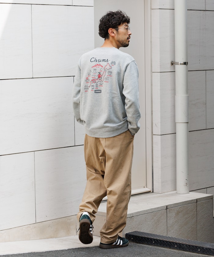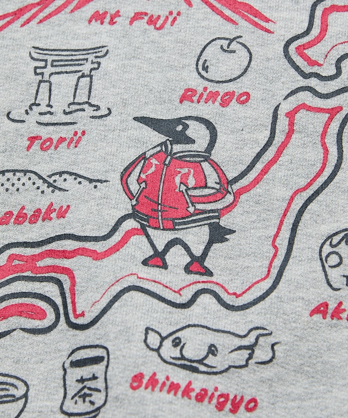 두시면에 일본 지도와 각 지역 명물을 담은 그래픽 프린트의 티. 앞면은 스카잔을 입은 특별한 부비버드의 원포인트 디자인이 있습니다. 안감 기모 소재로 부드럽고 따뜻합니다.
