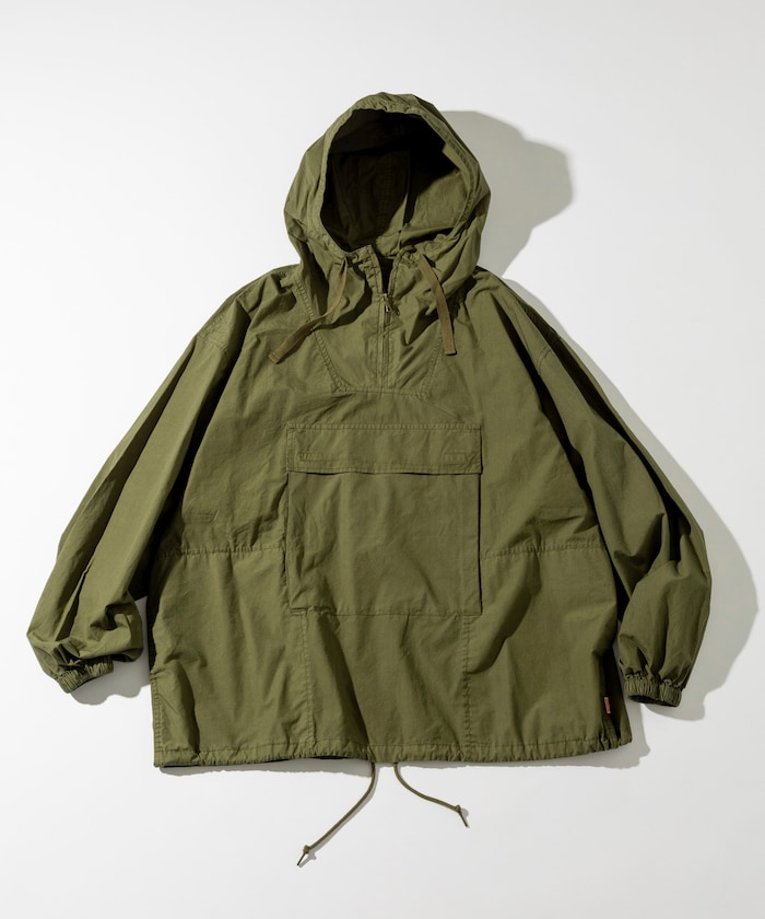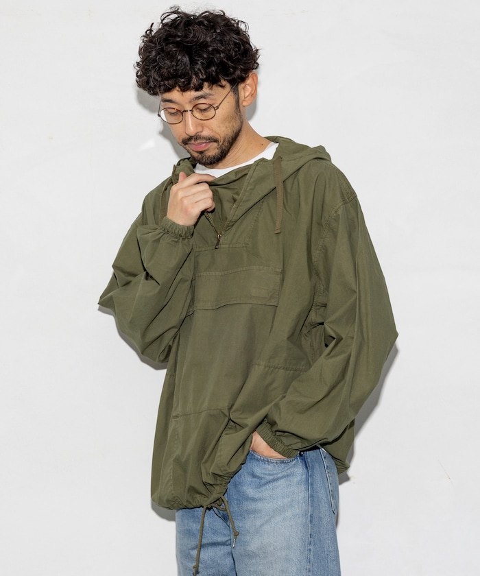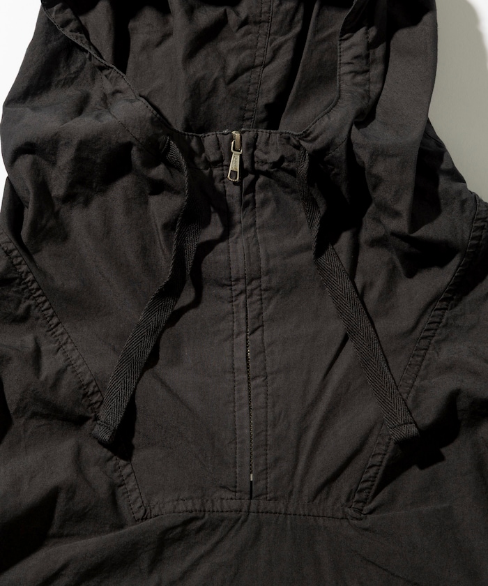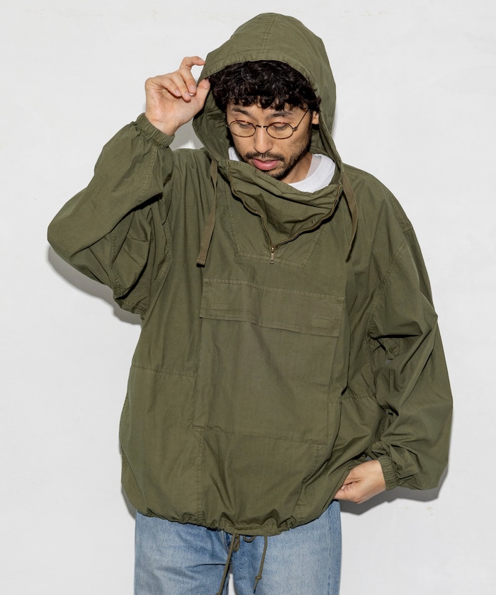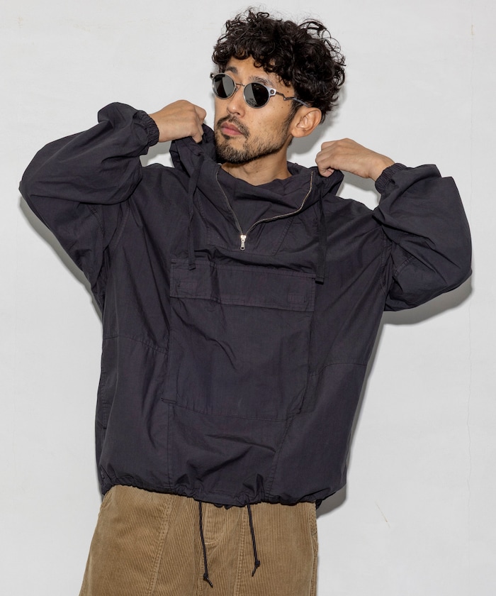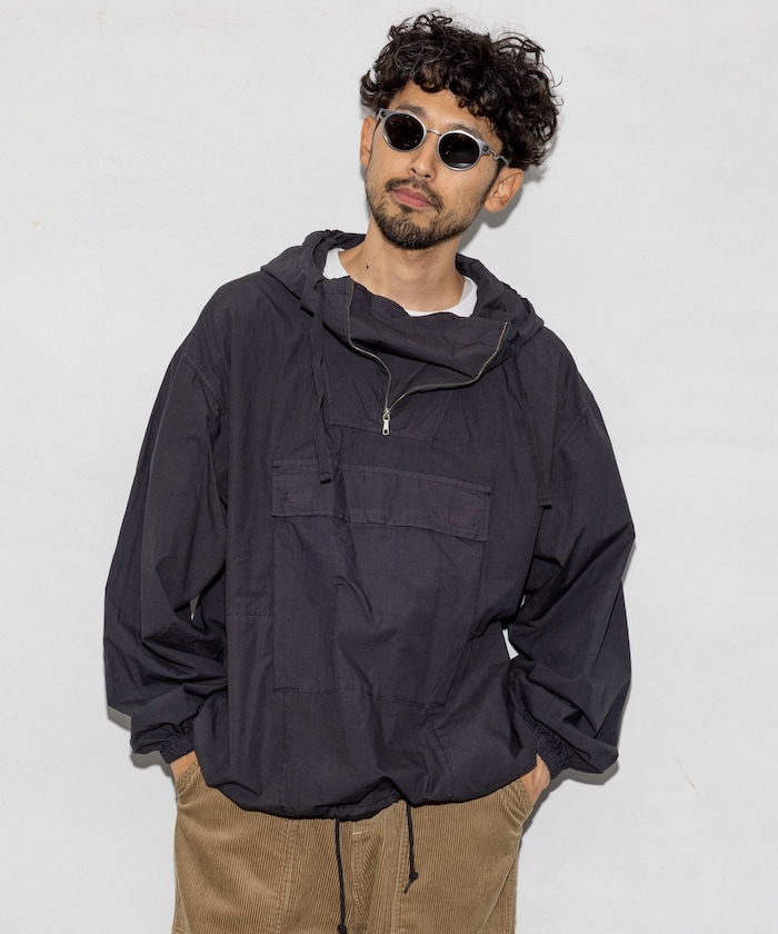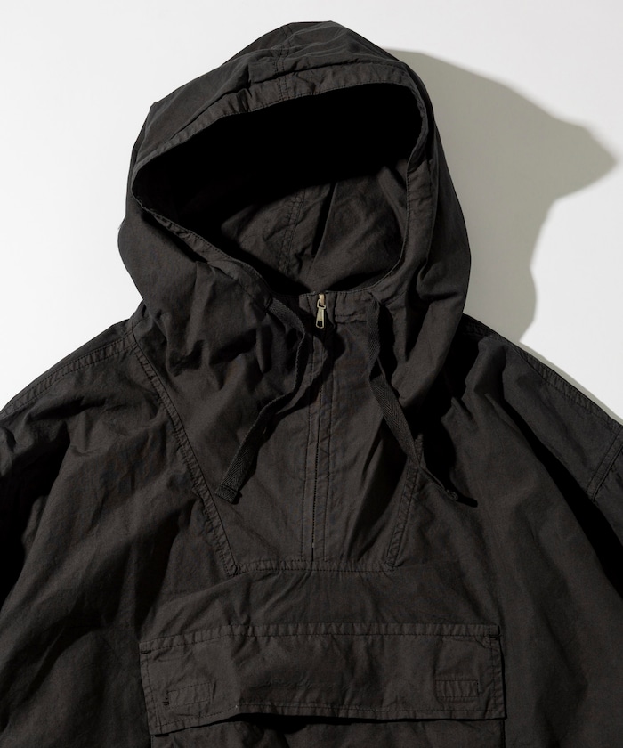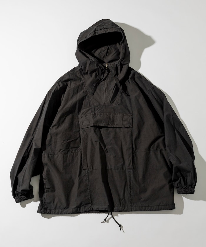 피그먼트 염색으로 가공된 빈티지 분위기의 아노락 파카. 영국군 스모크 파카를 모티브로, 하프집업 디테일이 특징입니다.