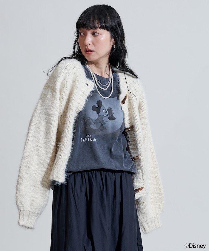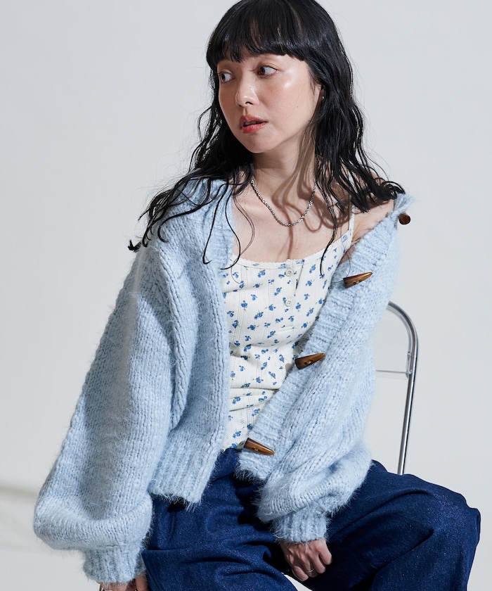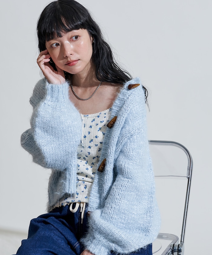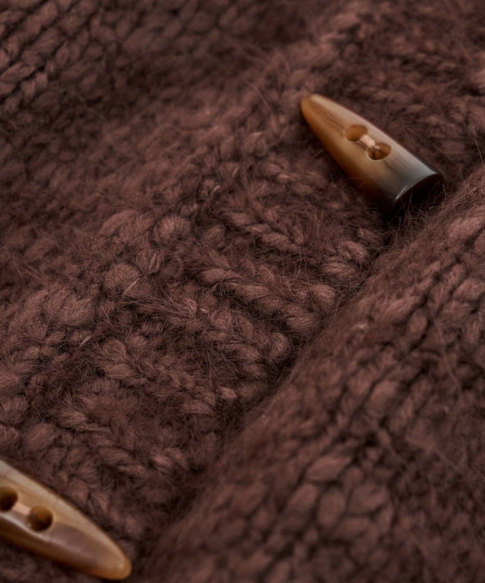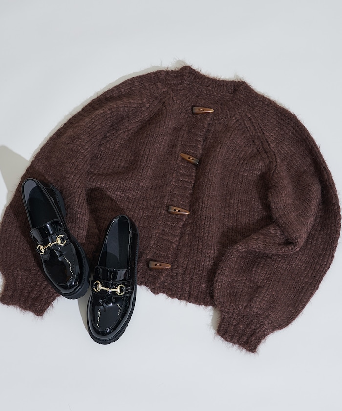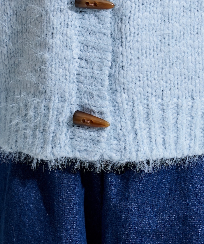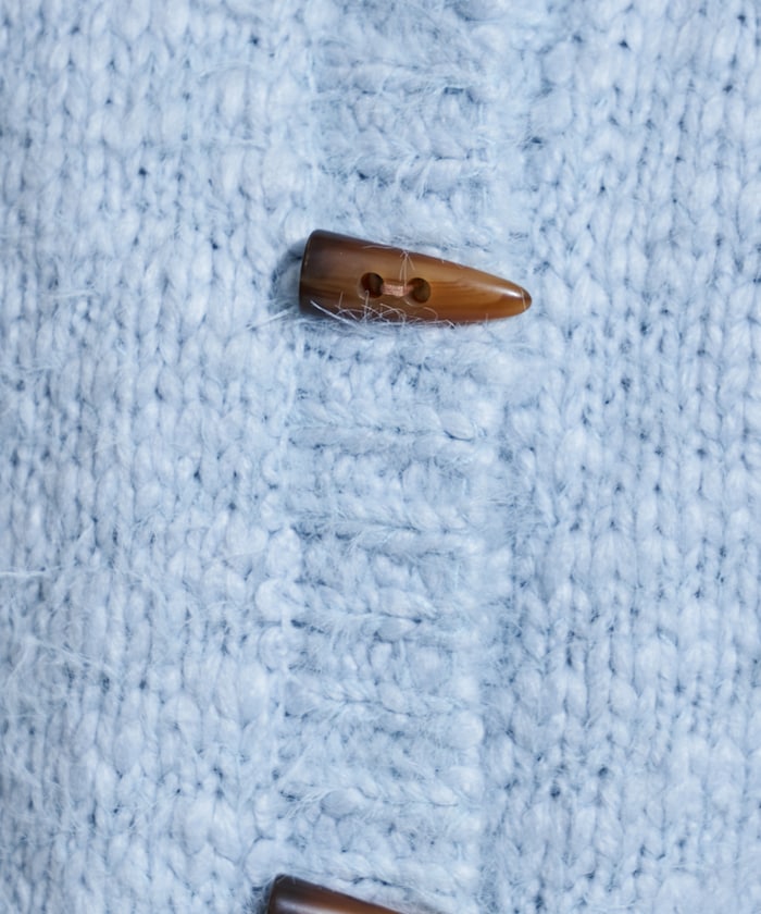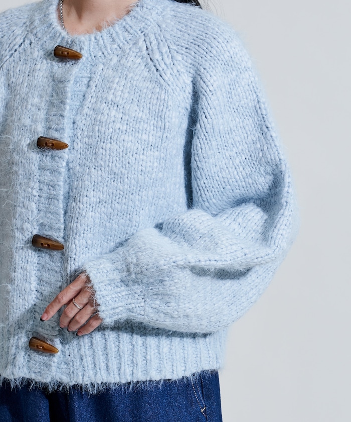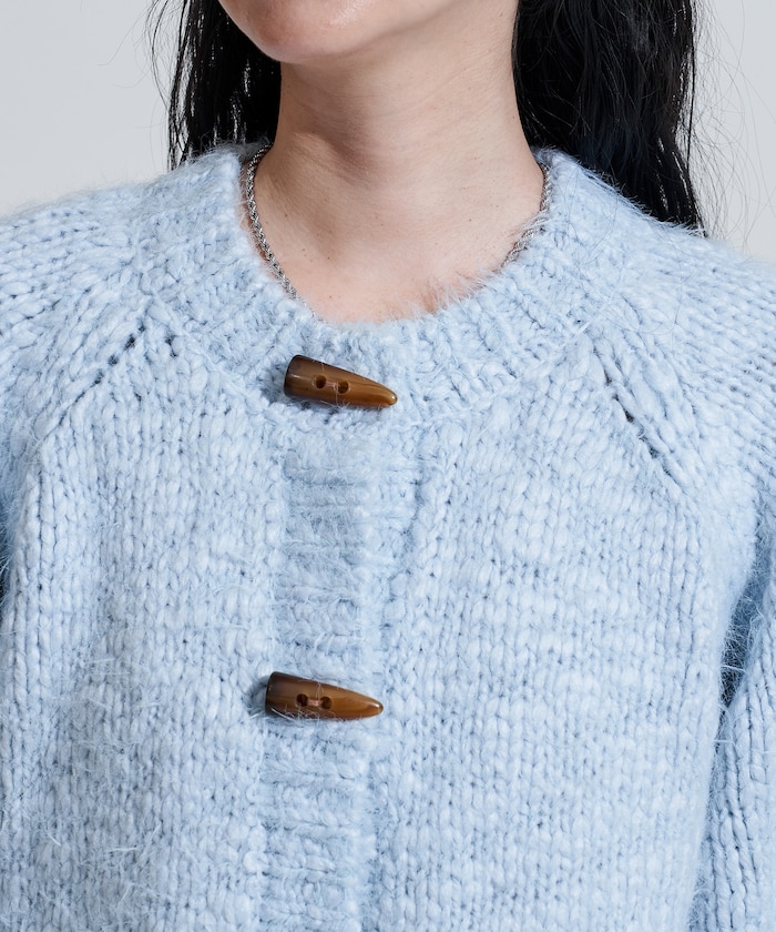 두가지 실을 조합해 짜여진 텍스처가 돋보이는 니트 가디건. 내추럴해 보이는 토굴 버튼 디자인입니다.