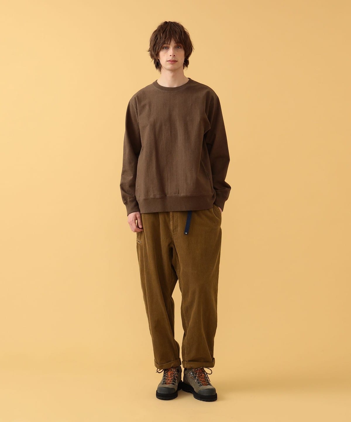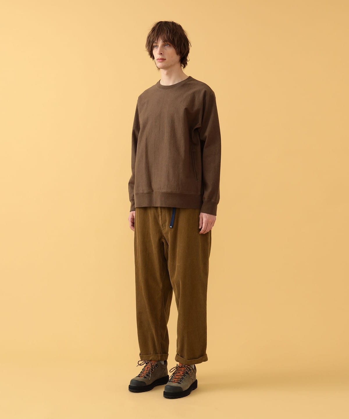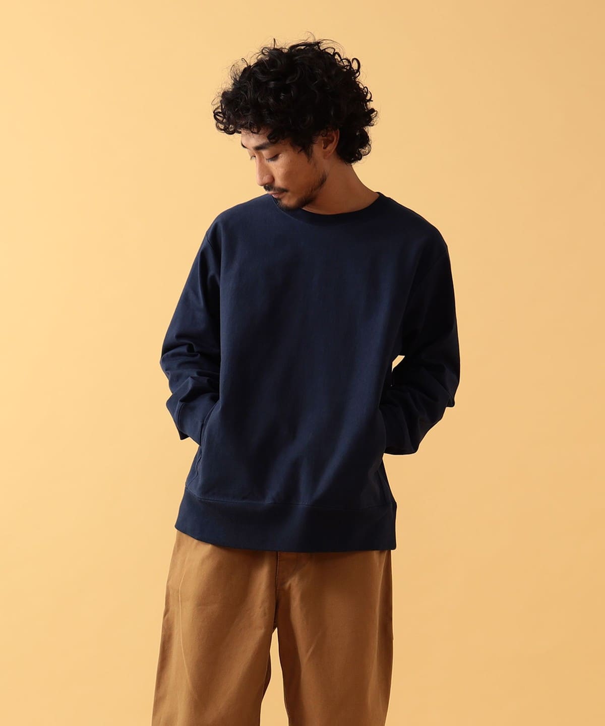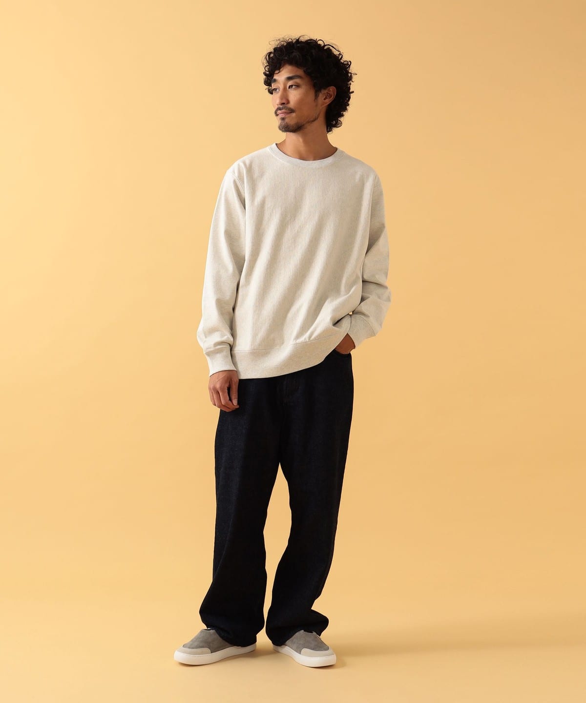 내추럴한 질감의 크루넥 티. 스루인 포켓은 양쪽 솔기 라인에 있습니다. 데일리로 입기 좋은 레귤러 핏