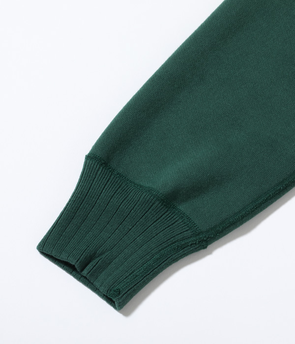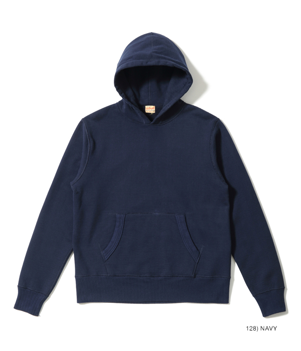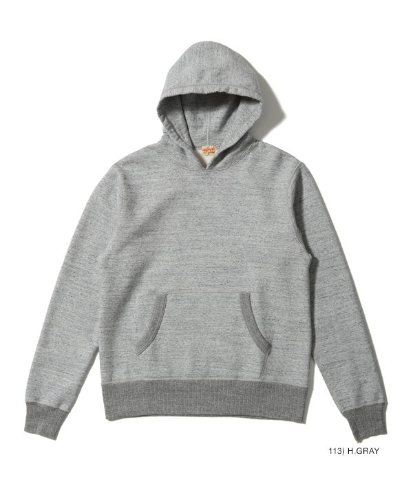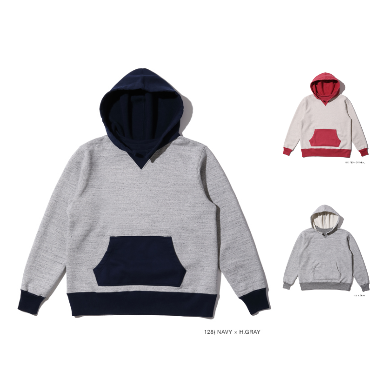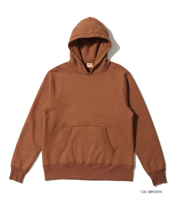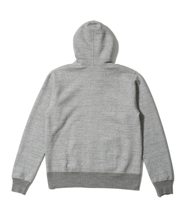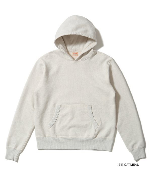 플랫 시머 재봉틀로 20/20/7 원사 수로 편직한 헤비 스웨트 파카. 후드는 두 개의 천을 붙여서 만들어졌으며 캥거루 주머니가 있습니다.