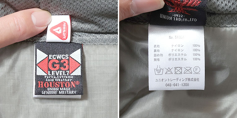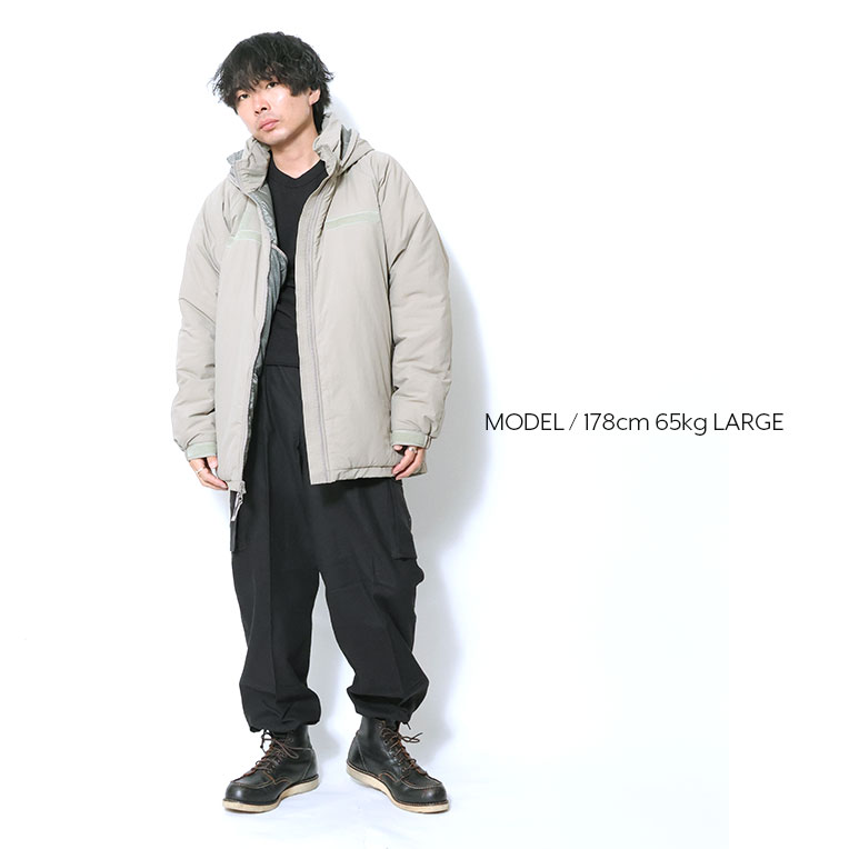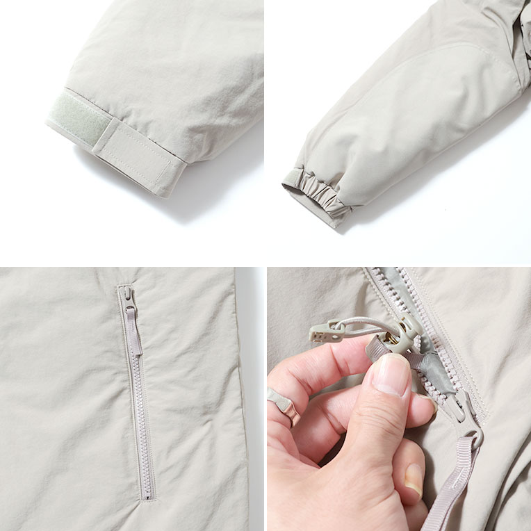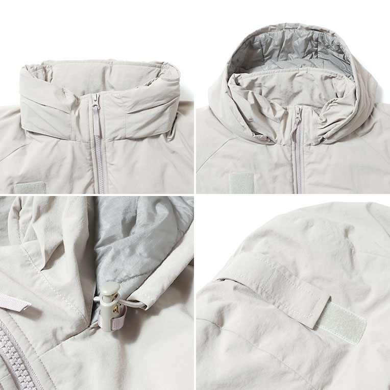 미군에서 채택된 기능성 충전재 프리마로프트 를 사용한 LEVEL7 모델입니다. 표면은 실제 군용에 가까운 질감의 코팅 나일론을 사용했으며, 넥은 후드가 들어 있는 두툼한 스탠드 칼라 구조입니다.