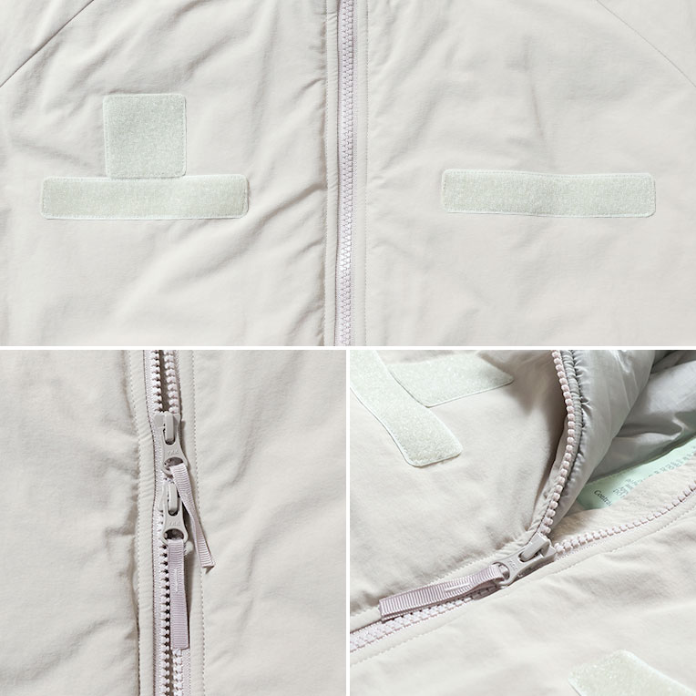 후드에는 고무 스트링과 벨크로 타입 조절 장치가 있고, 전면은 손잡이가 달린 양방향 지퍼로 여닫습니다. 가슴 부분에는 LEVEL7 특유의 벨크로 패치가 있으며, 양쪽 사이드에는 지퍼 포켓이 있고 내부에서 밑단 조절 스트링을 사용할 수 있습니다.