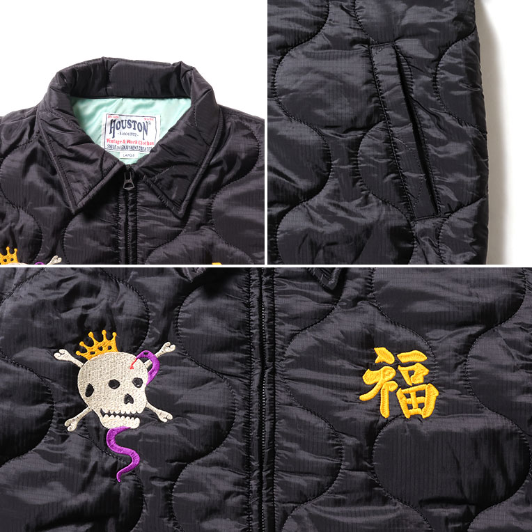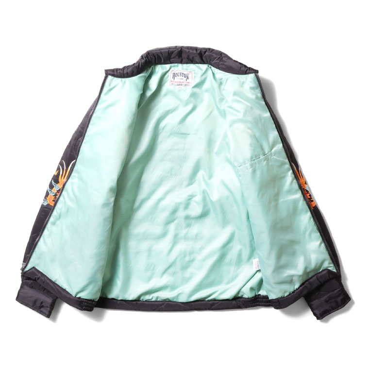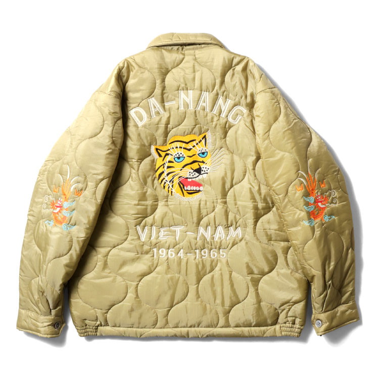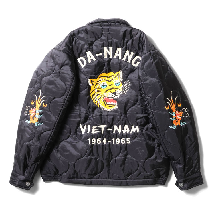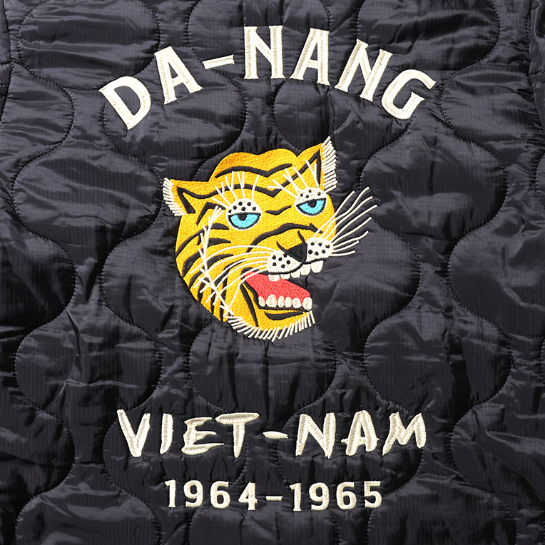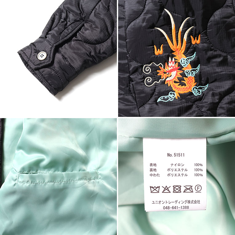 내구성이 뛰어난 나일론 립스톱 원단을 사용한 베트남 자켓입니다. 손자수 느낌의 대형 지도 자수 패턴을 전체적으로 더한 디자인이며 안감에는 빈티지 아이템에서도 자주 볼 수 있는 선명한 민트 그린 컬러를 적용했습니다.