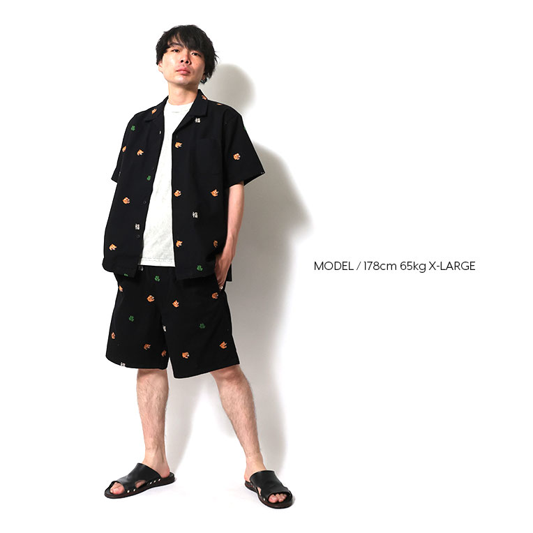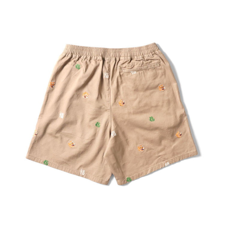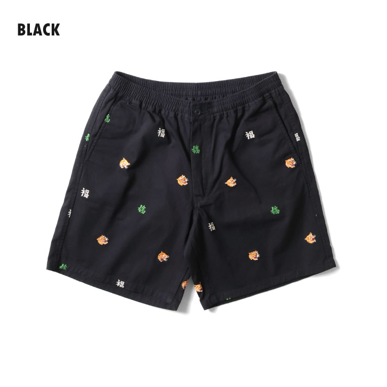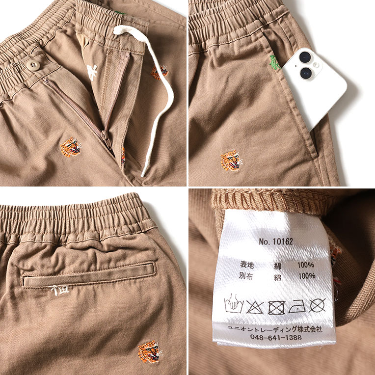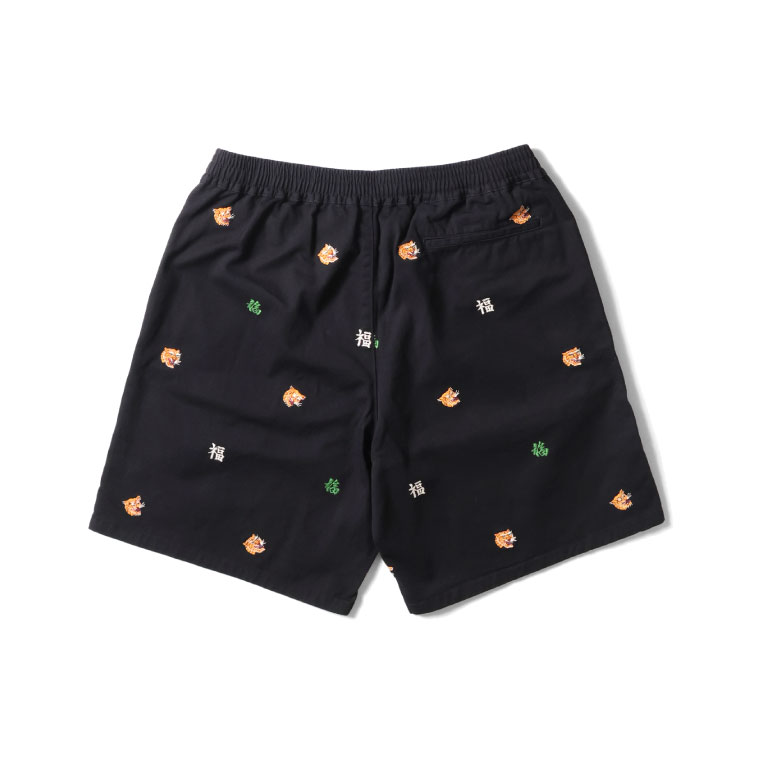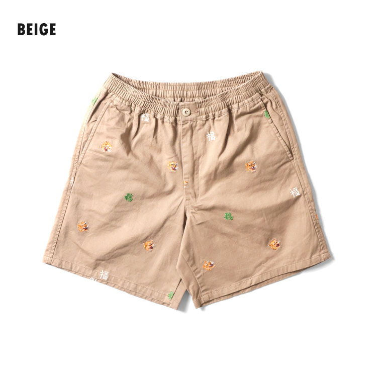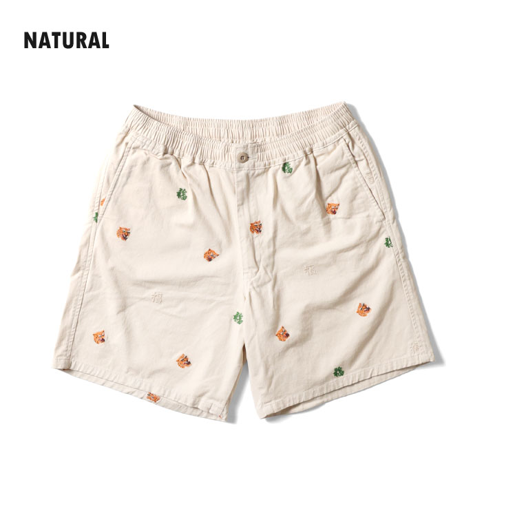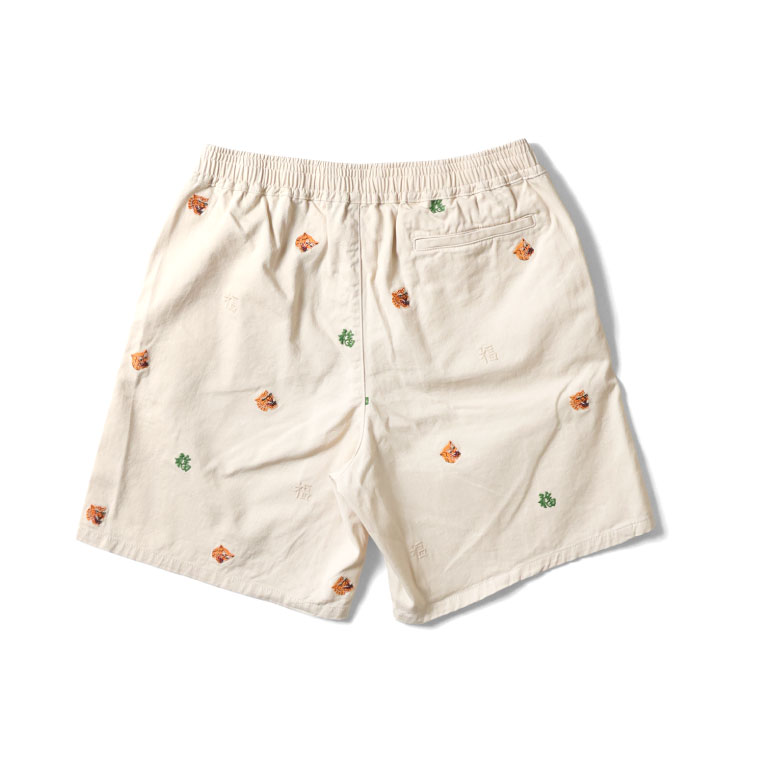 코튼 트윌 원단 위에 베트남 재킷 특유의 호랑이와 복 문양의 이지 쇼츠. 허리는 밴딩과 스트링이 있어 편안합니다.