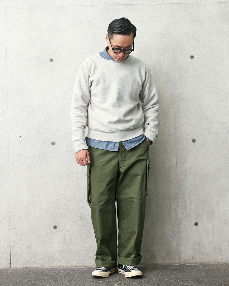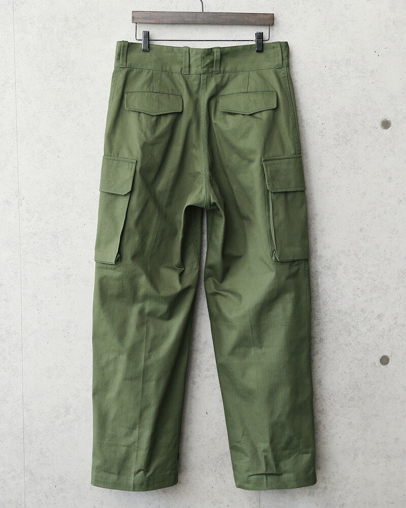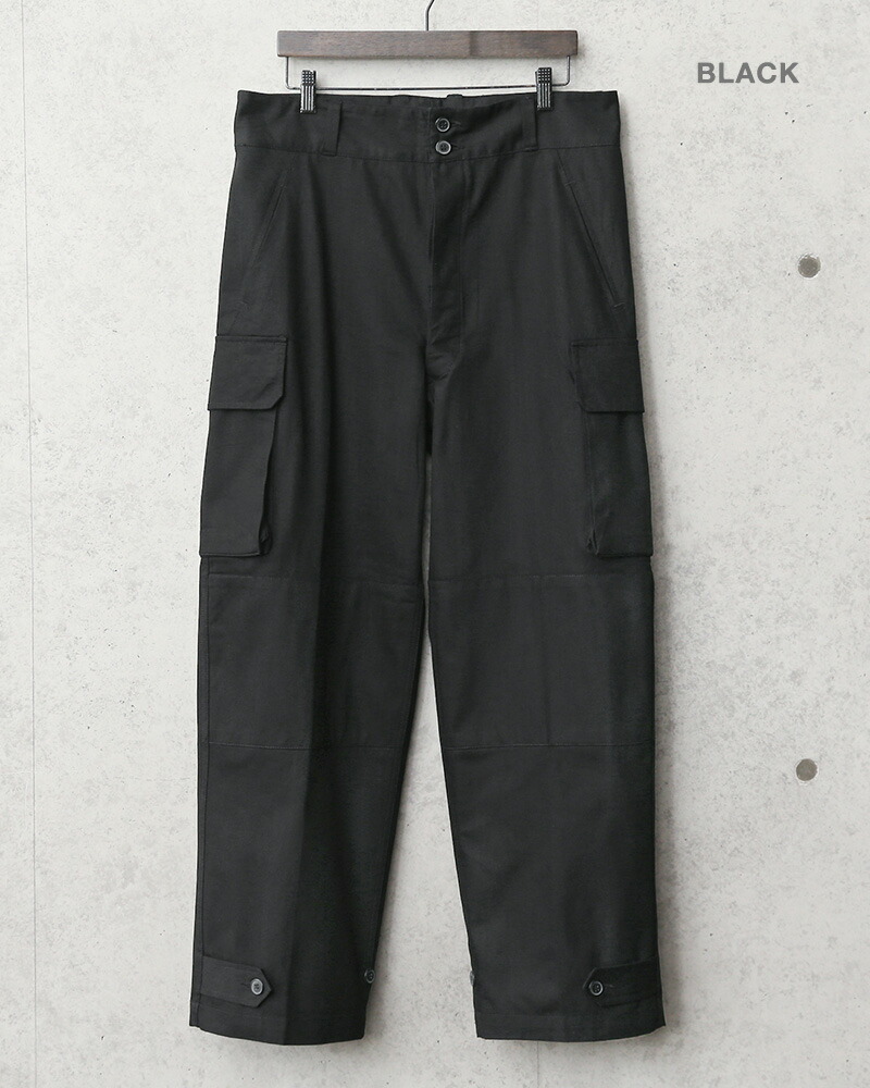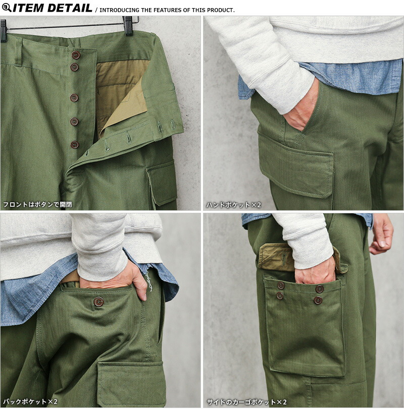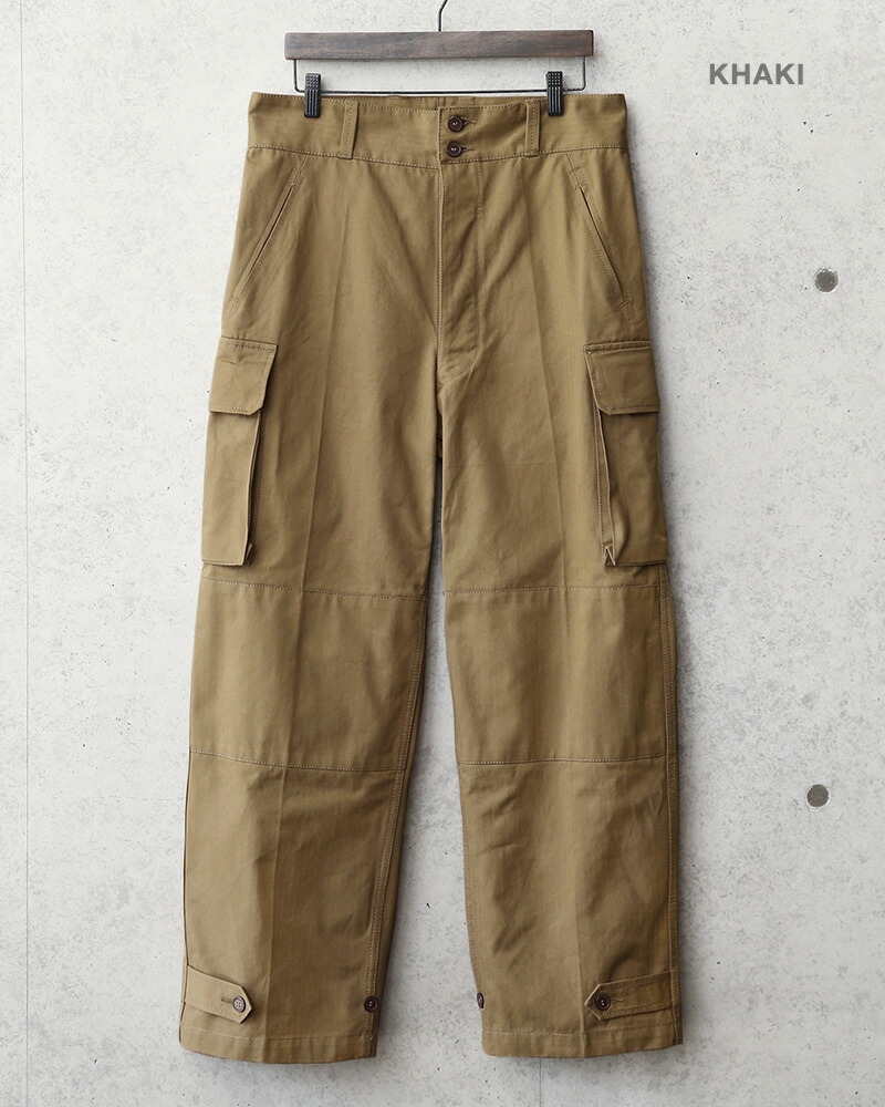 프랑스 군에 의해 처음 개발되어 채택 된 M-47 필드 카고 팬츠. 원단은 HBT(헤링본 트윌)로, 실제 제품의 후기 모델에 사용된 소재입니다. 루즈한 실루엣이 특징으로 사이드에 큰 카고 포켓, 밑단에 버튼 여밈 사이즈 조절기가 있습니다.
