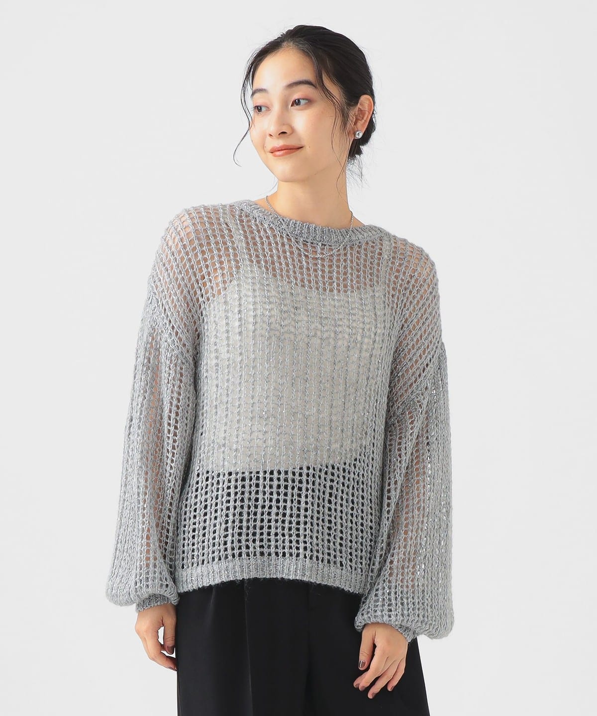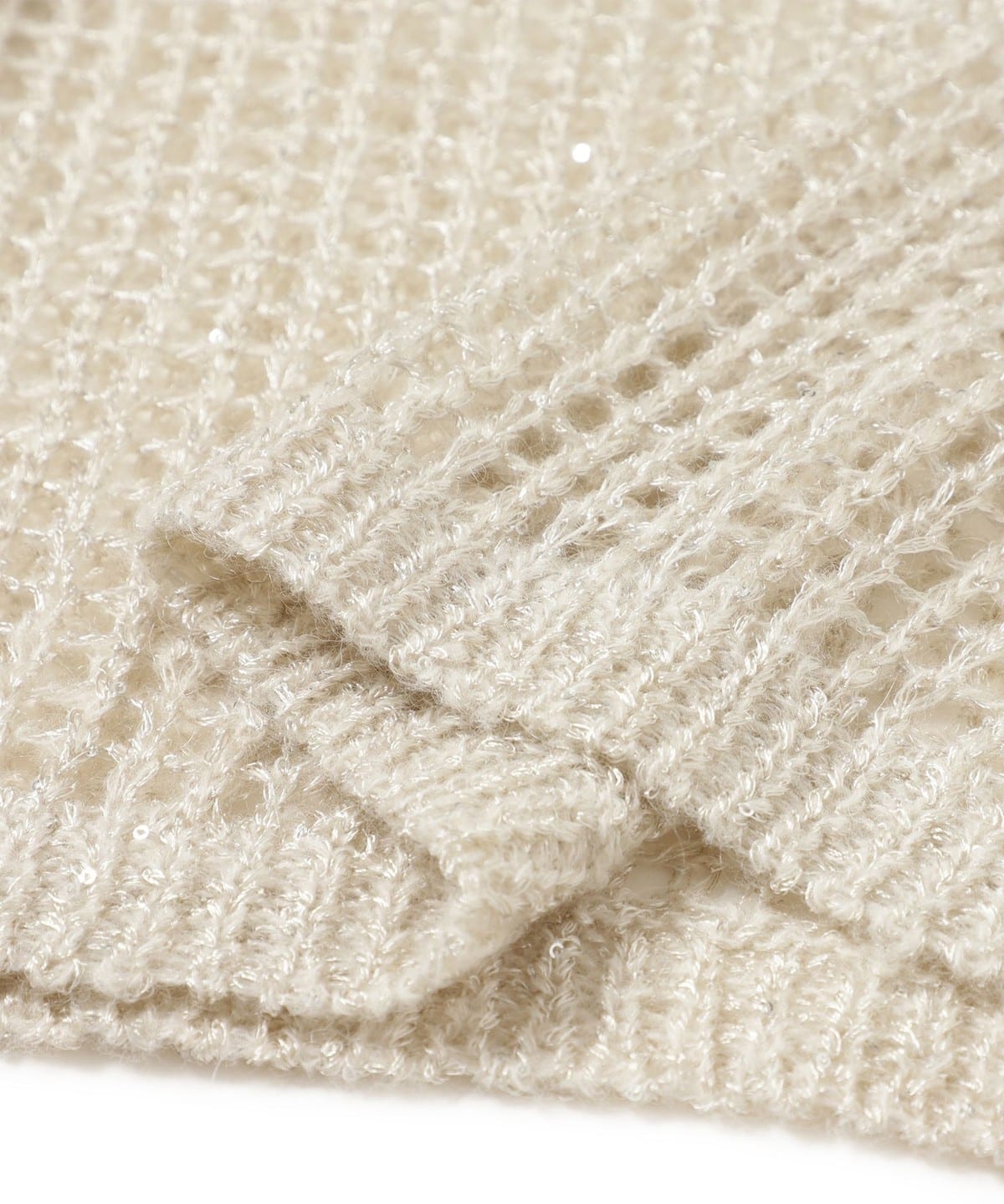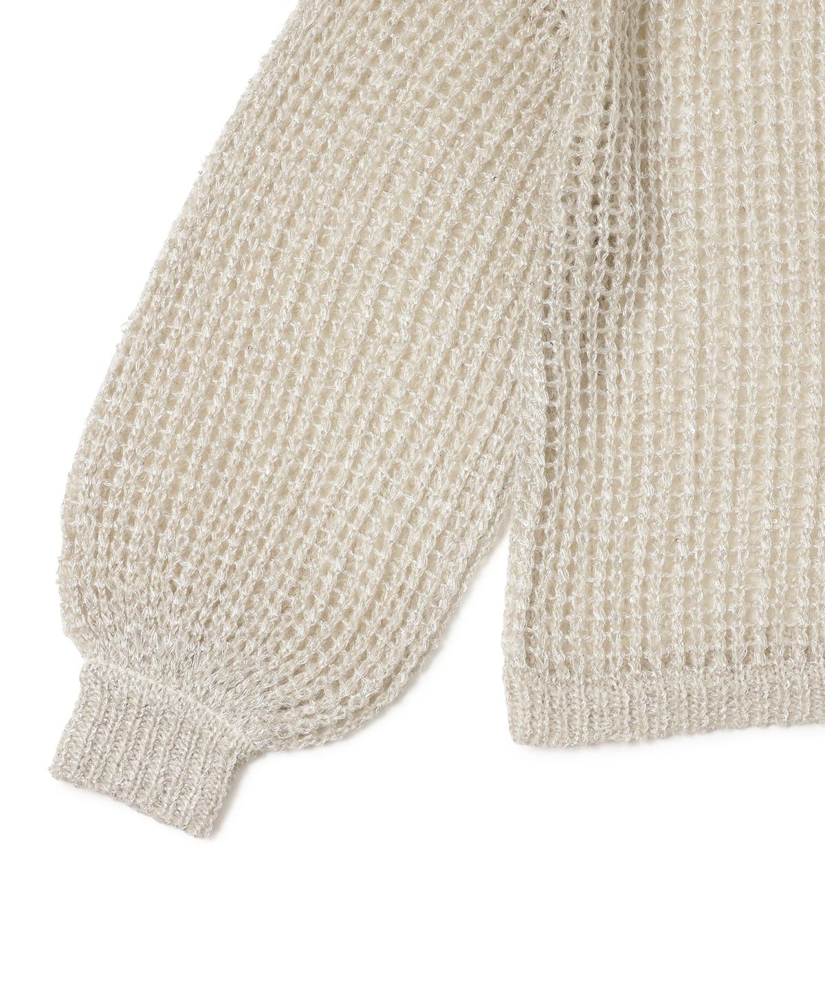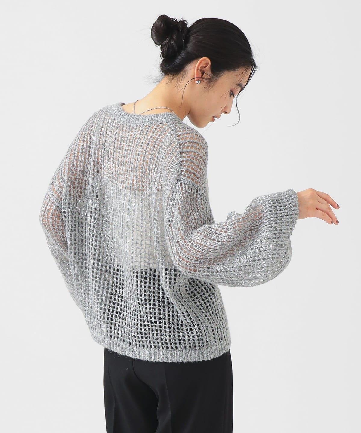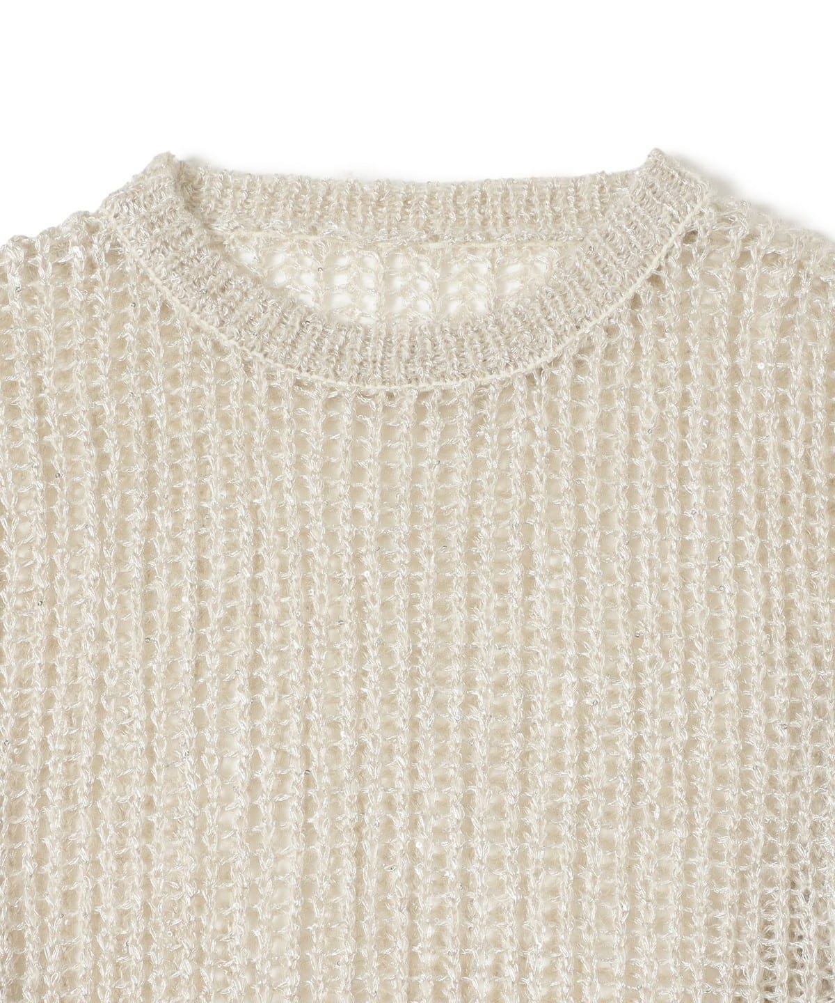적당한 반짝임과 투명함이 특징인 메시 니트. 전체적으로 시어한 짜임이 특징입니다.