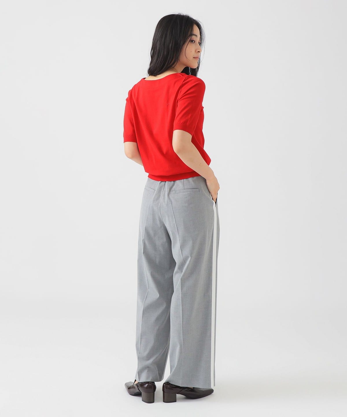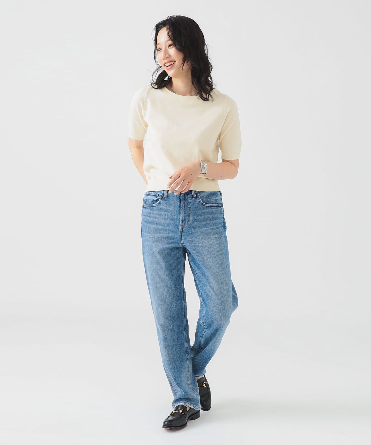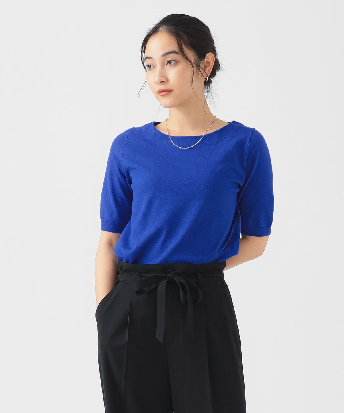 베이직한 디자인의 반팔 니트. 너무 붙지 않으면서도 바디에 자연스럽게 핏되는 슬림한 실루엣입니다.