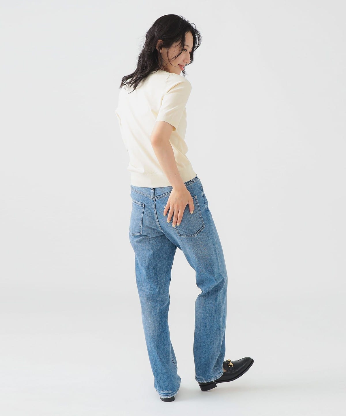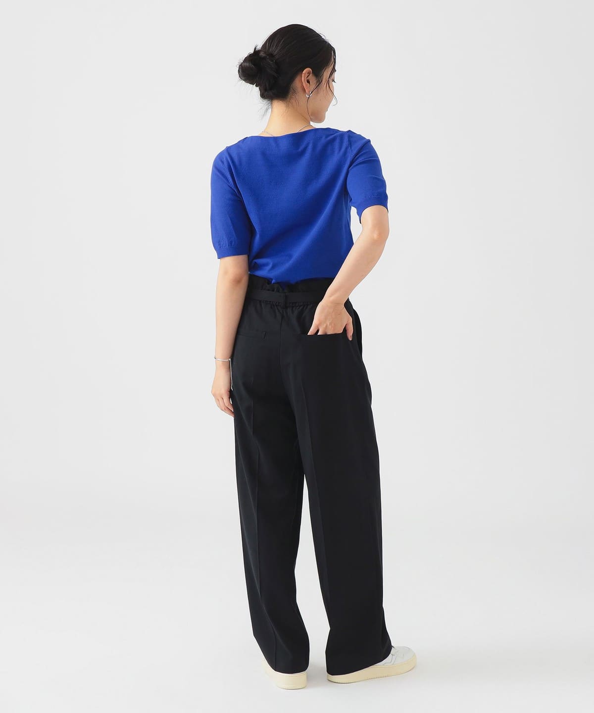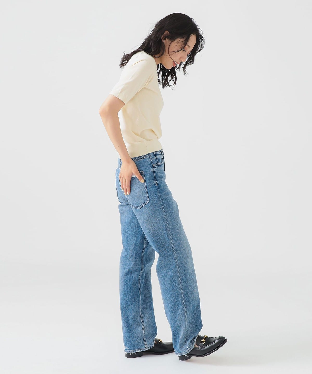 베이직한 디자인의 반팔 니트. 너무 붙지 않으면서도 바디에 자연스럽게 핏되는 슬림한 실루엣입니다.
