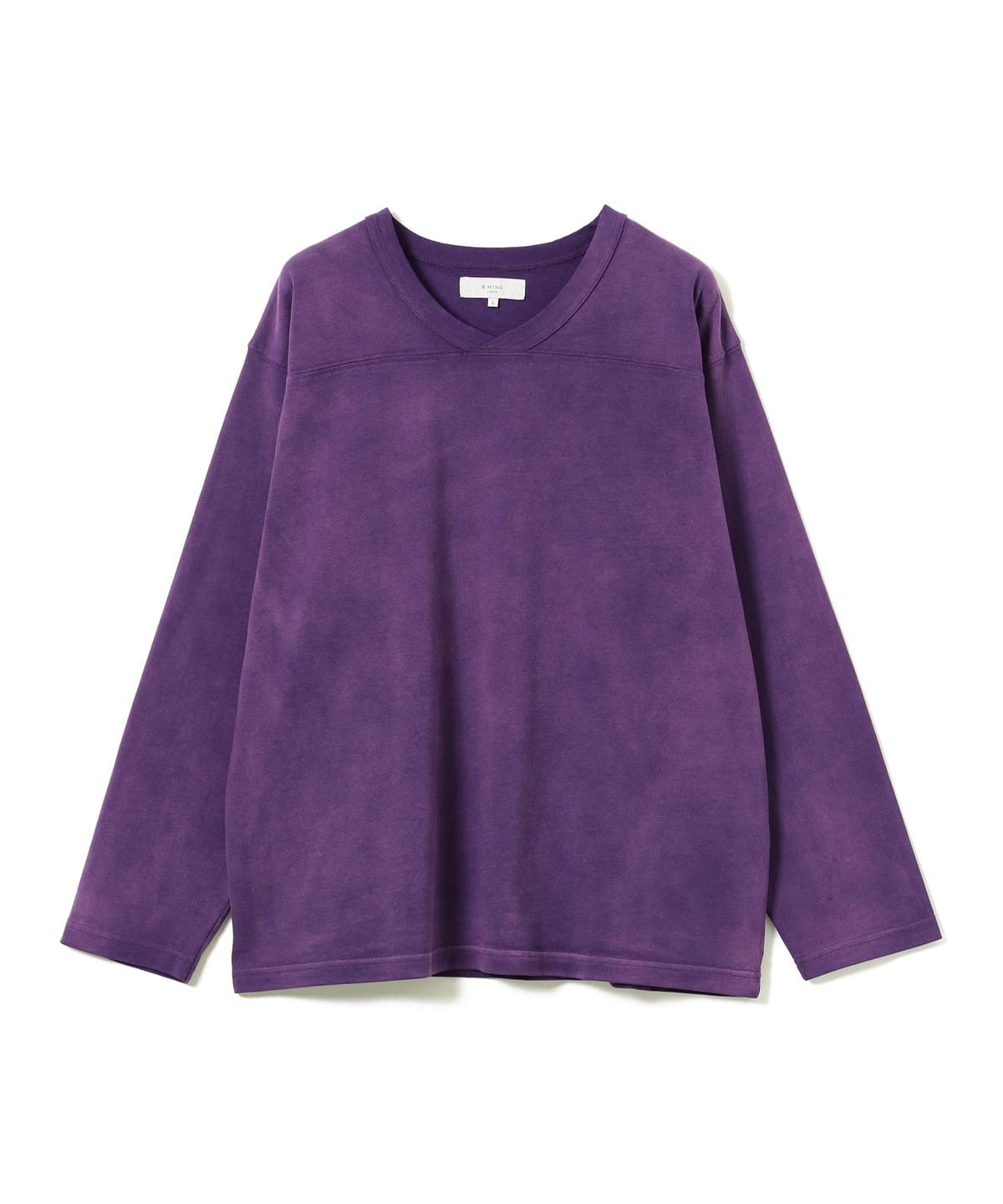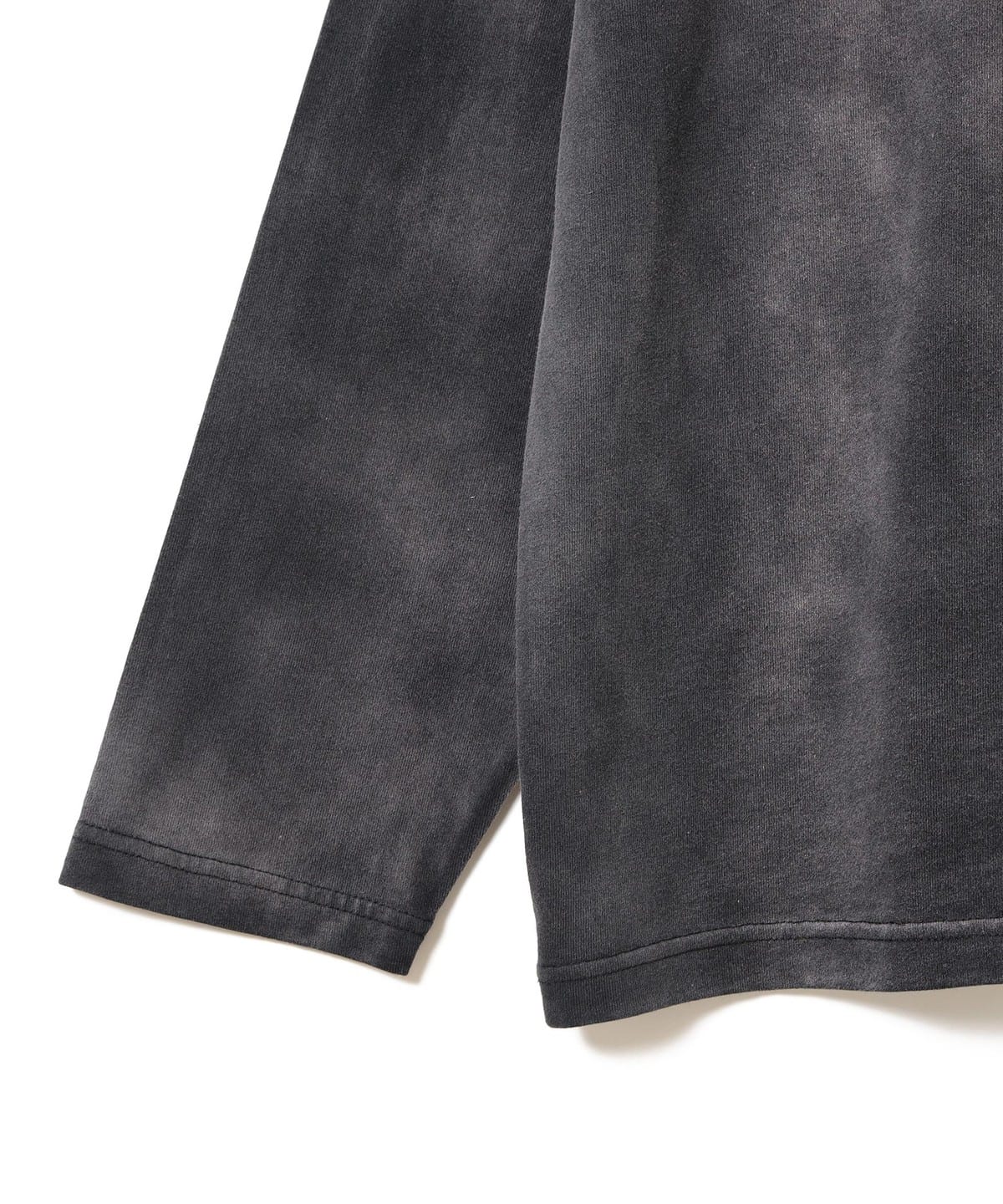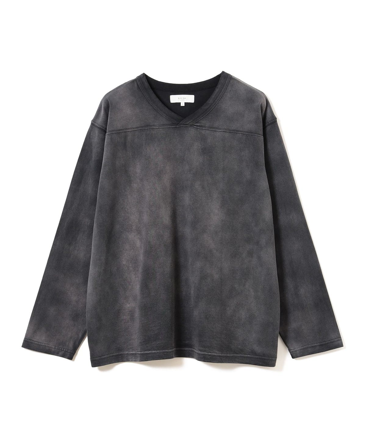 스프레이 표백 가공으로 자연스러운 페이드 디자인입니다. 겹쳐진듯한 디자인의 브이넥이 포인트이며 드롭 숄더 실루엣으로 여유로운 핏입니다.