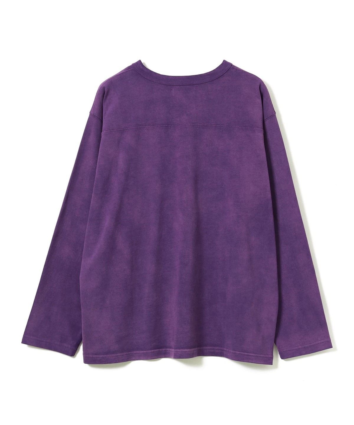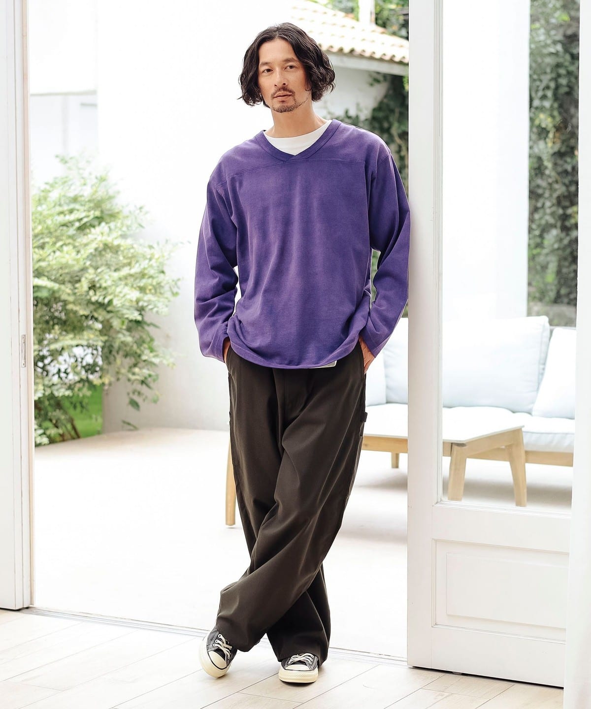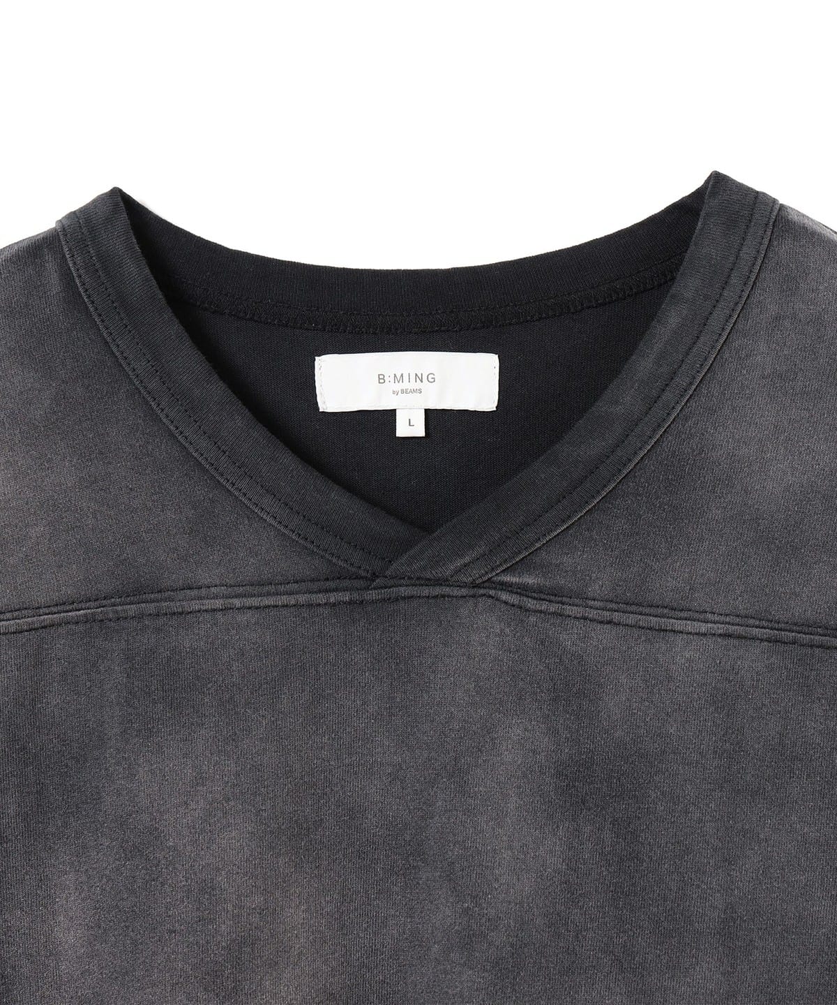 스프레이 표백 가공으로 자연스러운 페이드 디자인입니다. 겹쳐진듯한 디자인의 브이넥이 포인트이며 드롭 숄더 실루엣으로 여유로운 핏입니다.