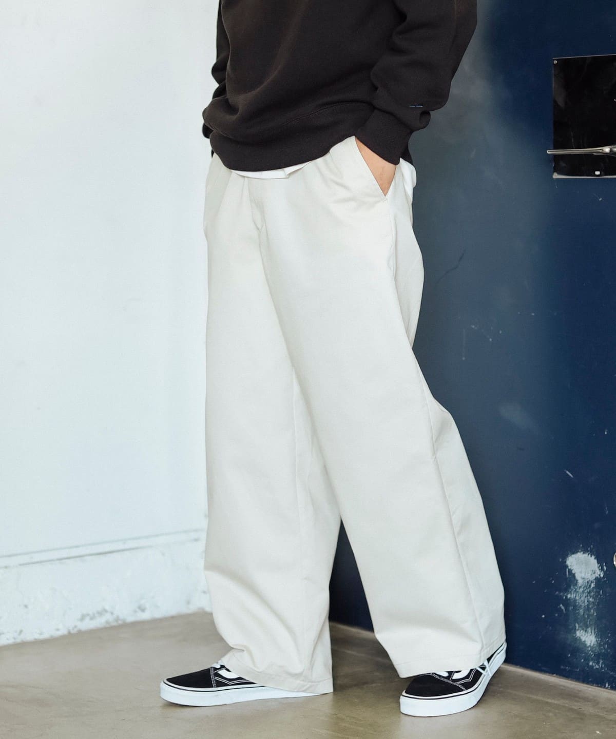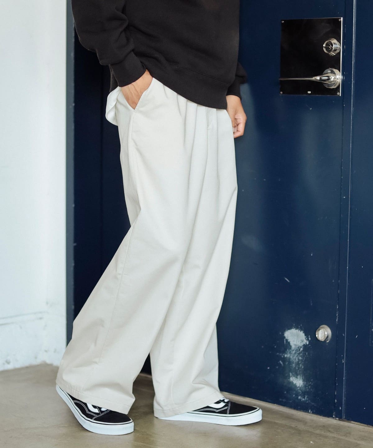 노턱 디자인이며 무릎과 단폭이 넓은 와이드 실루엣의 팬츠. 심플하나 디자인으로 다양한 코디에 잘 어울립니다. 사이즈가 넉넉한 와이드 실루엣입니다. 폴리에스테르 코튼 혼방으로 자연스로운 코튼과 같은 느김입니다.