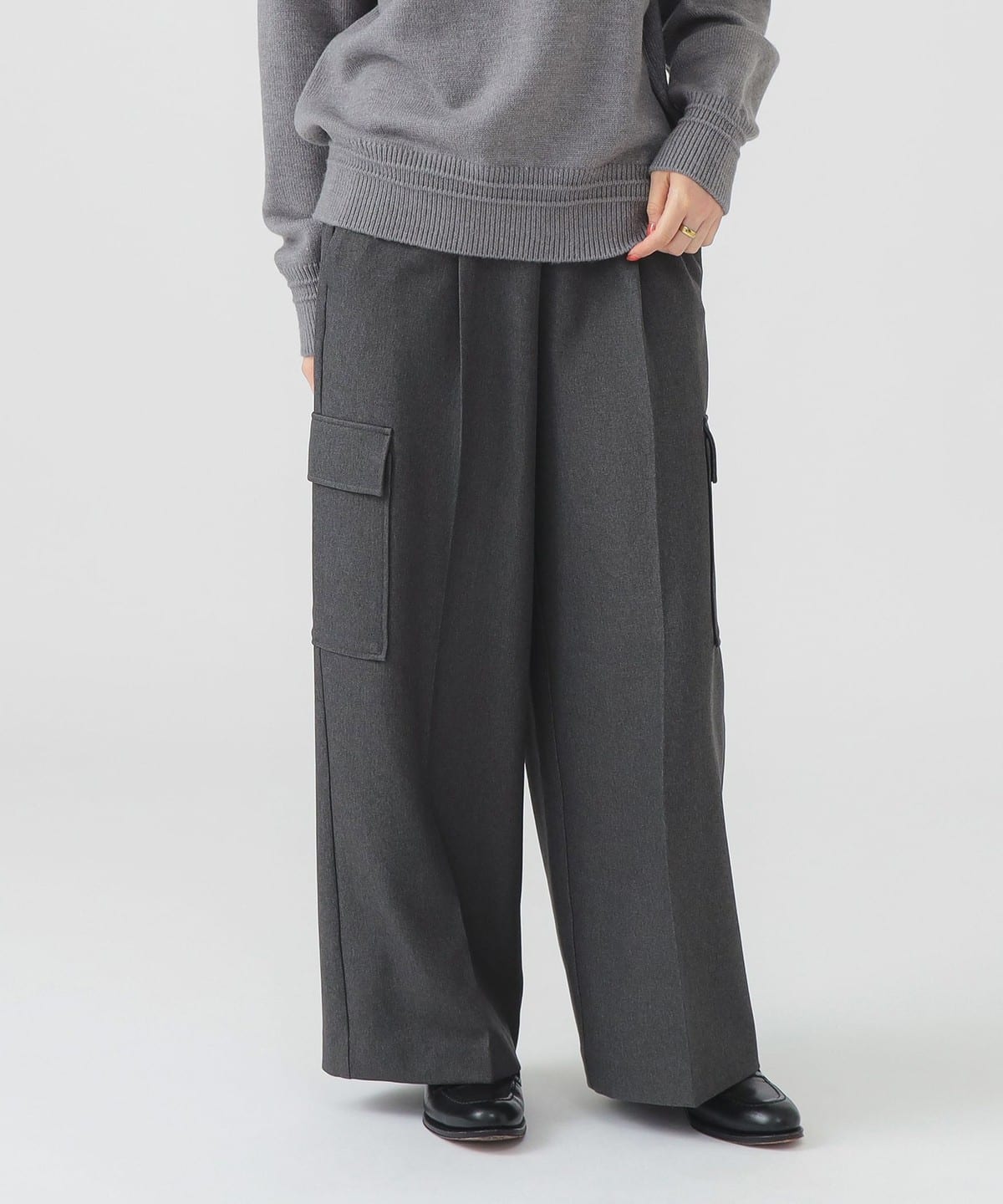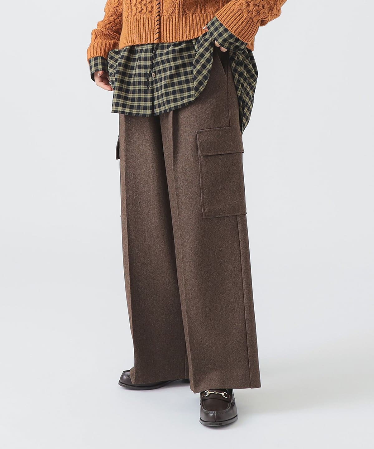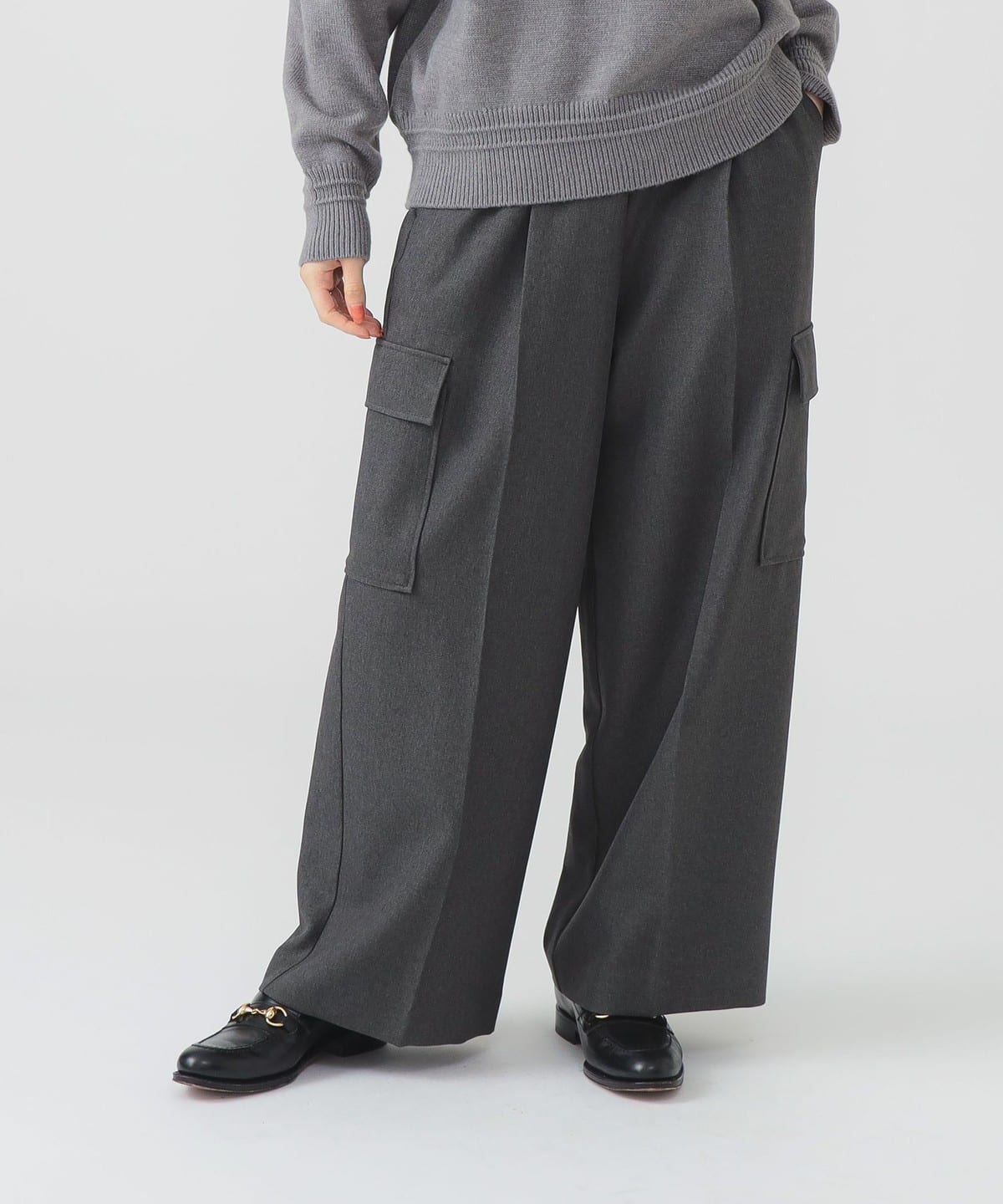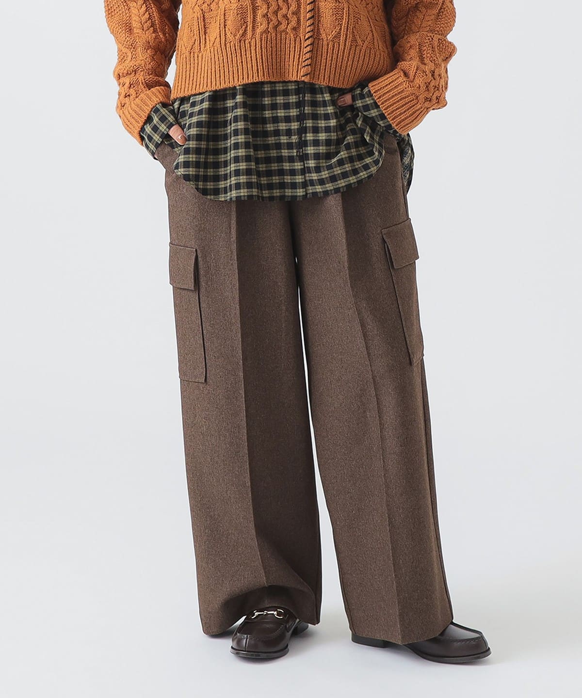 와이드한 실루엣의 카고 팬츠. 허리 고무 밸트로 편안한 착용감입니다. 울처럼 보이는 폴리에스테르 소재로 가볍고 관리가 쉽습니다.