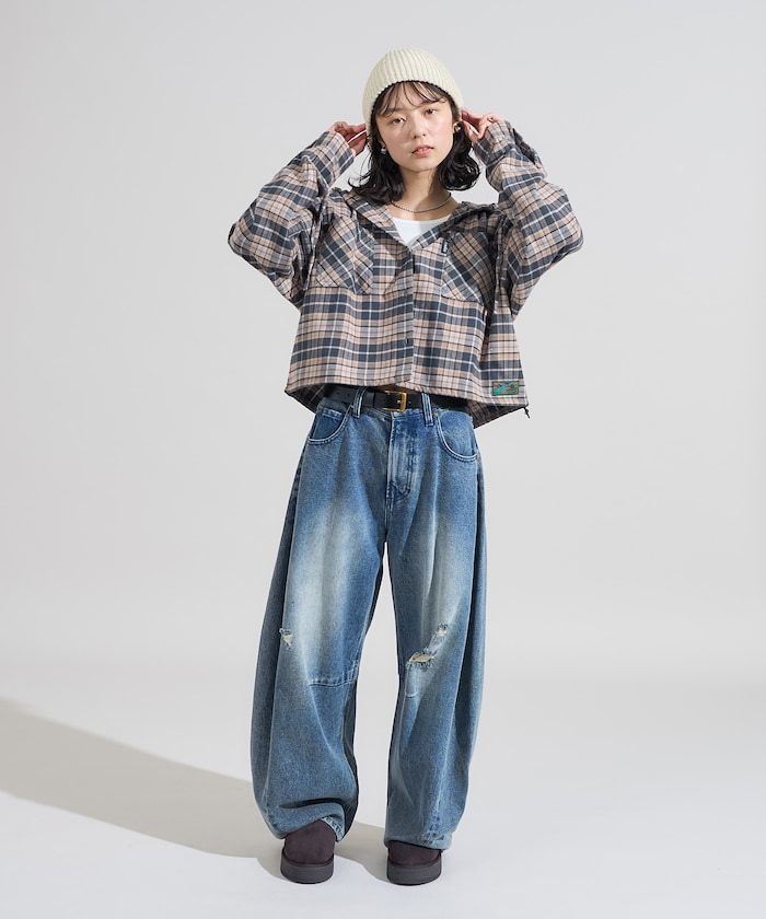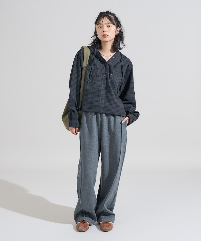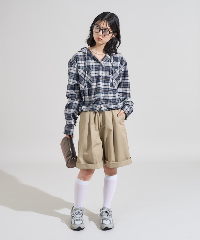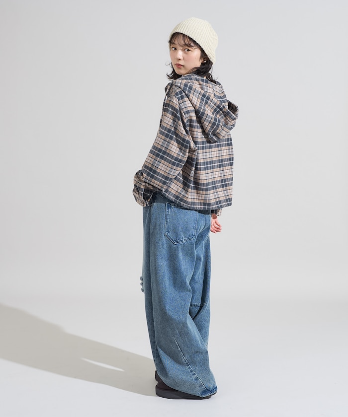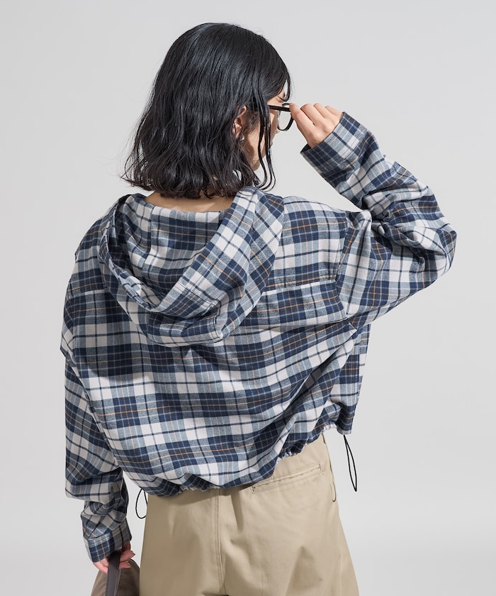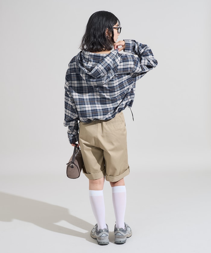 따뜻하고 캐주얼한 분위기를 살려주는 체크 패턴입니다. 길이를 살짝 짧게 디자인했으며 밑단 드로우스트링으로 실루엣을 변화할 수 있습니다