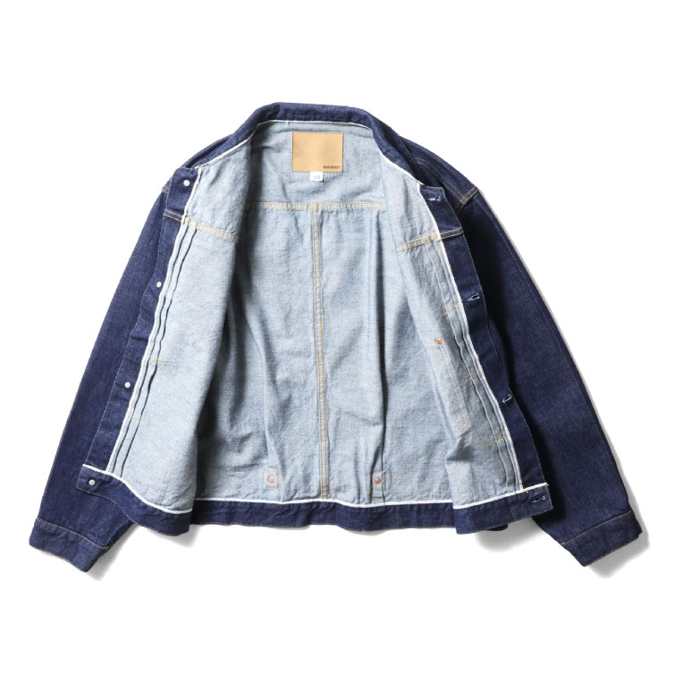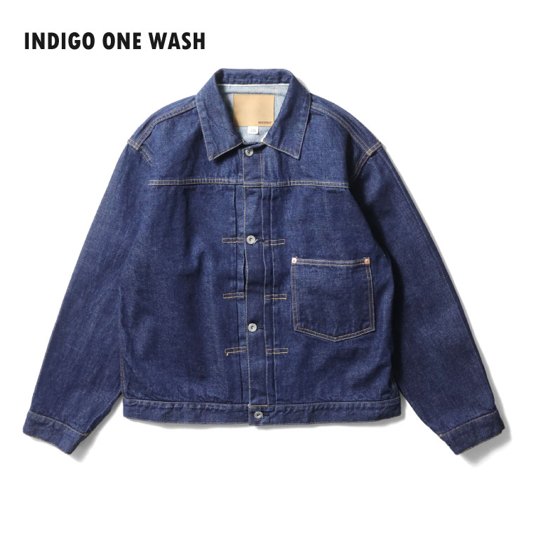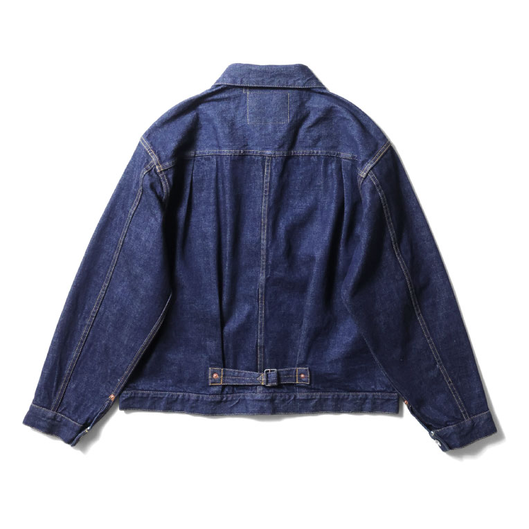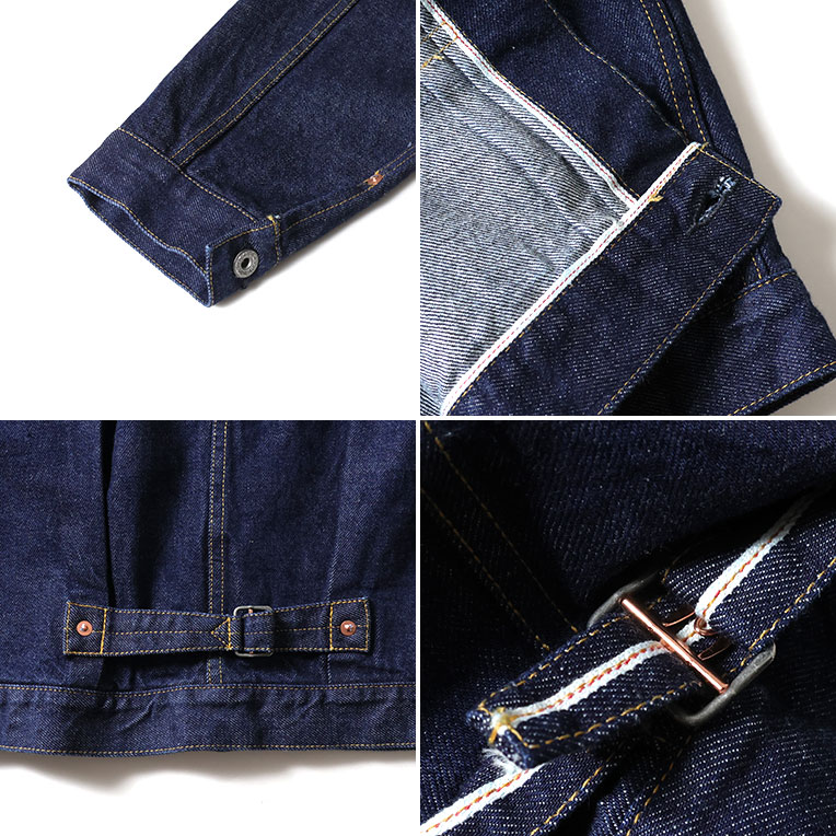 당시 물자 통제로 인해 4개의 프론트 버튼과 플랩이 없는 가슴 포켓이 특징이며, 칼라 안쪽과 허리 벨트 안쪽 등 곳곳에 셀비지 디테일을 다채롭게 사용합니다.