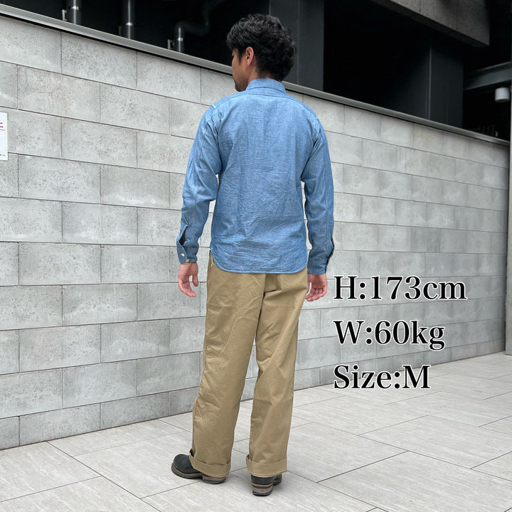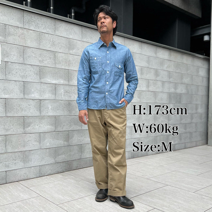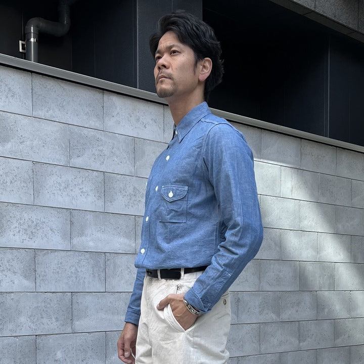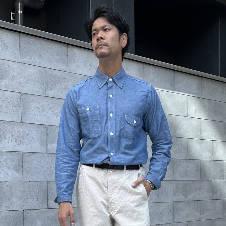 1920~30년대 ‘BRAVEMAN’ 데드스탁 워크셔츠의 원단 을 바탕으로 복원한 샴브레이 셔츠입니다.