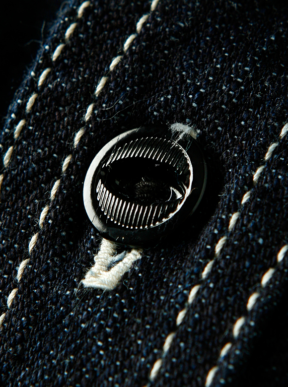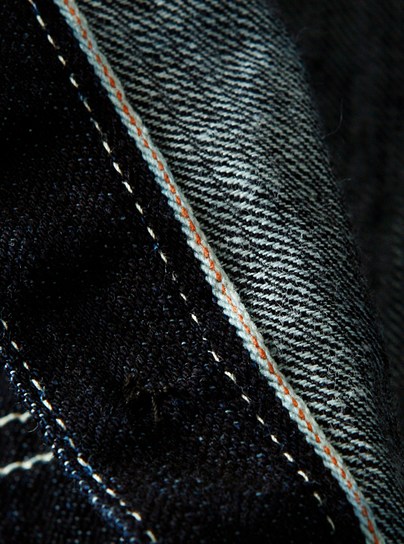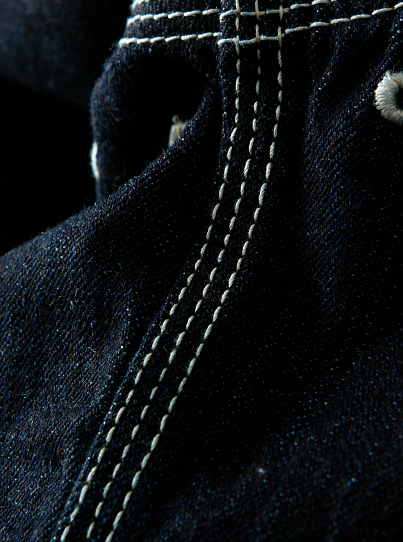 옛 방식의 셔틀 직기로 짠 원단 특유의 거친 질감과 선명한 세로 워싱(縦落ち) 효과를 통해,
