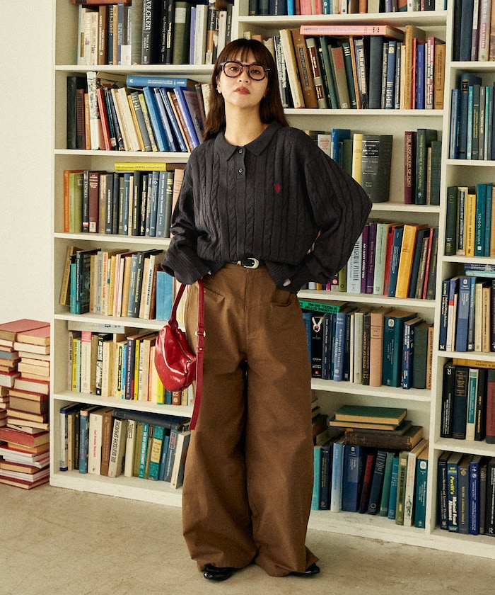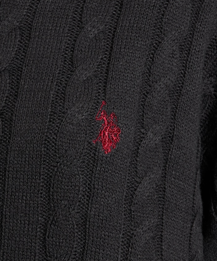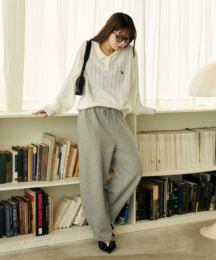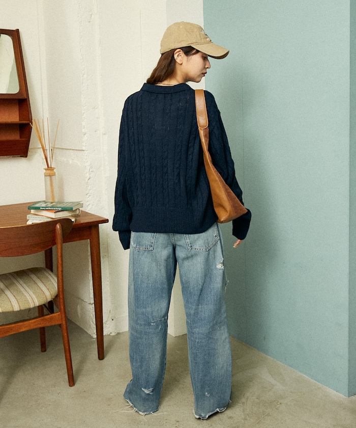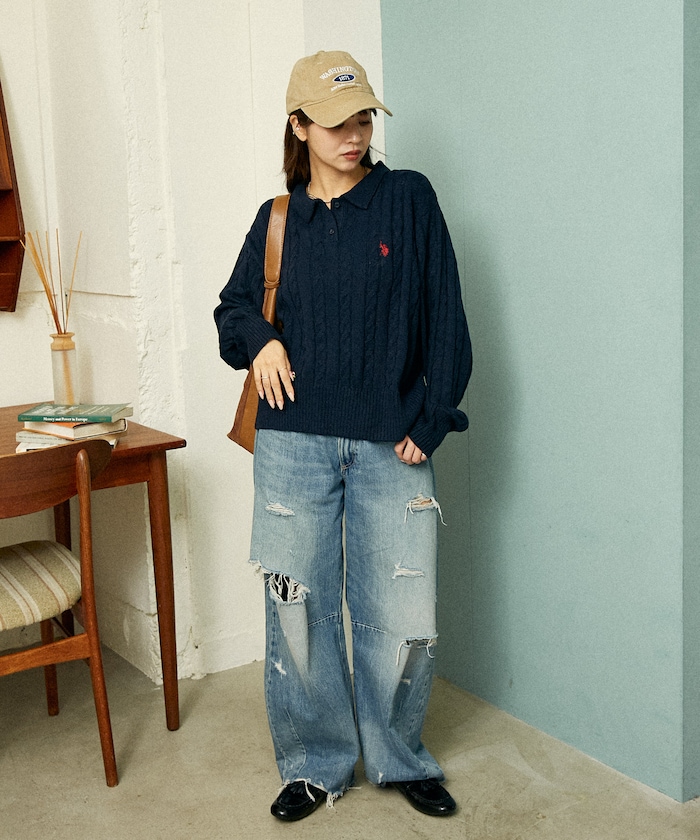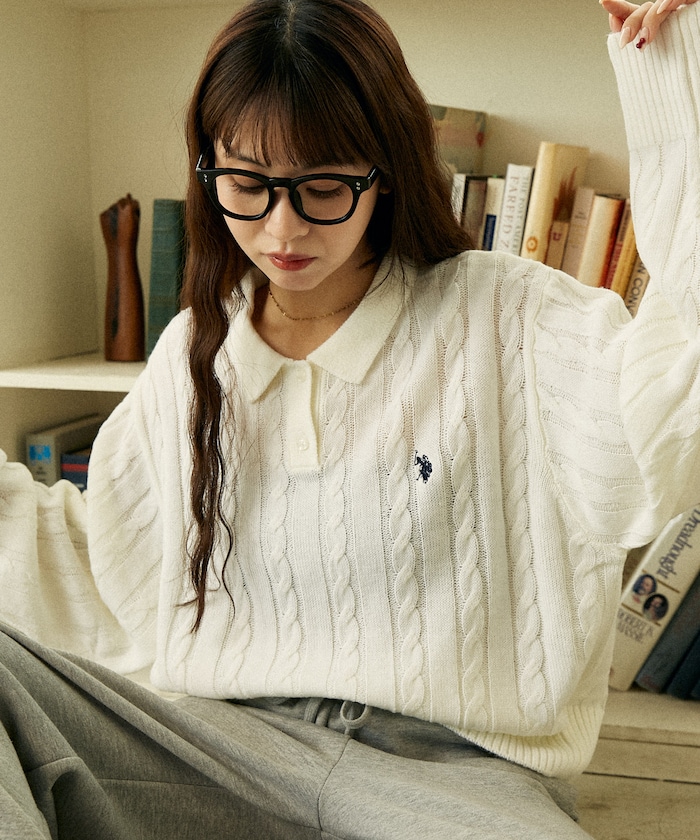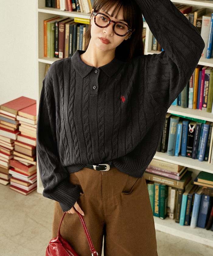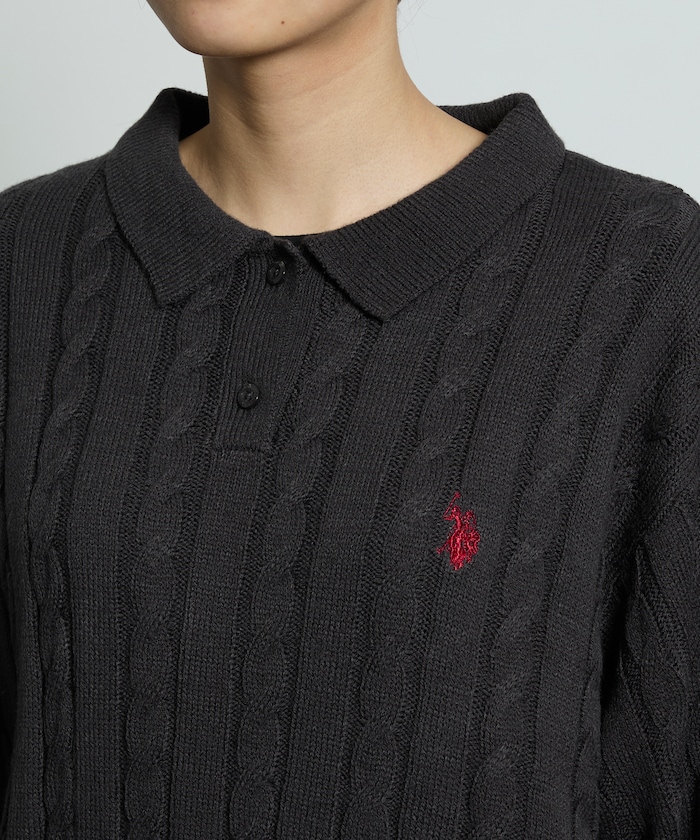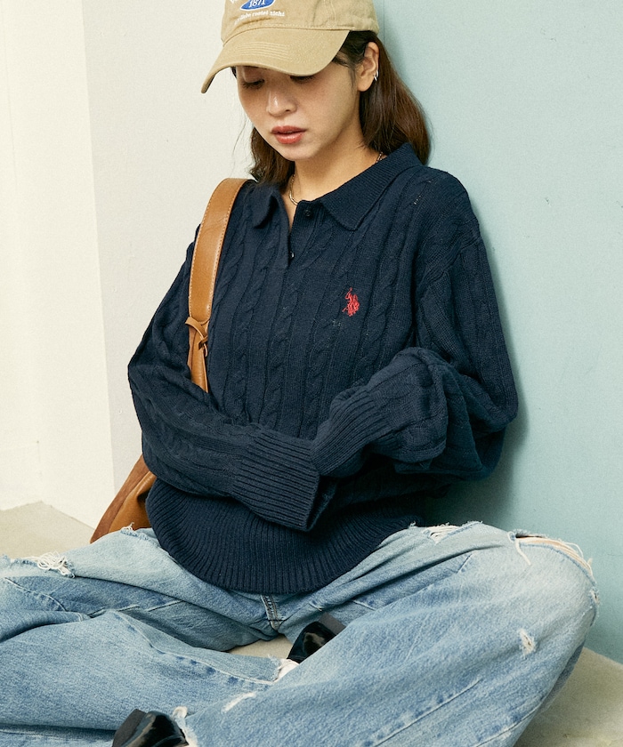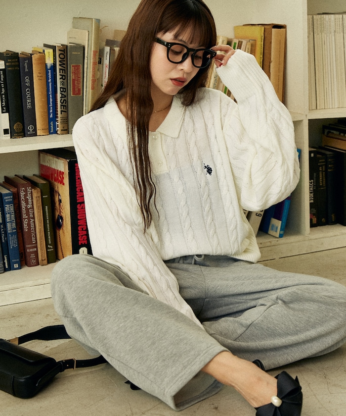 이블 짜임으로 완성된 입체적 텍스처가 고급스러운 폴로 니트. 미들 게이지 니트로 부드럽고 적당한 두께감입니다.