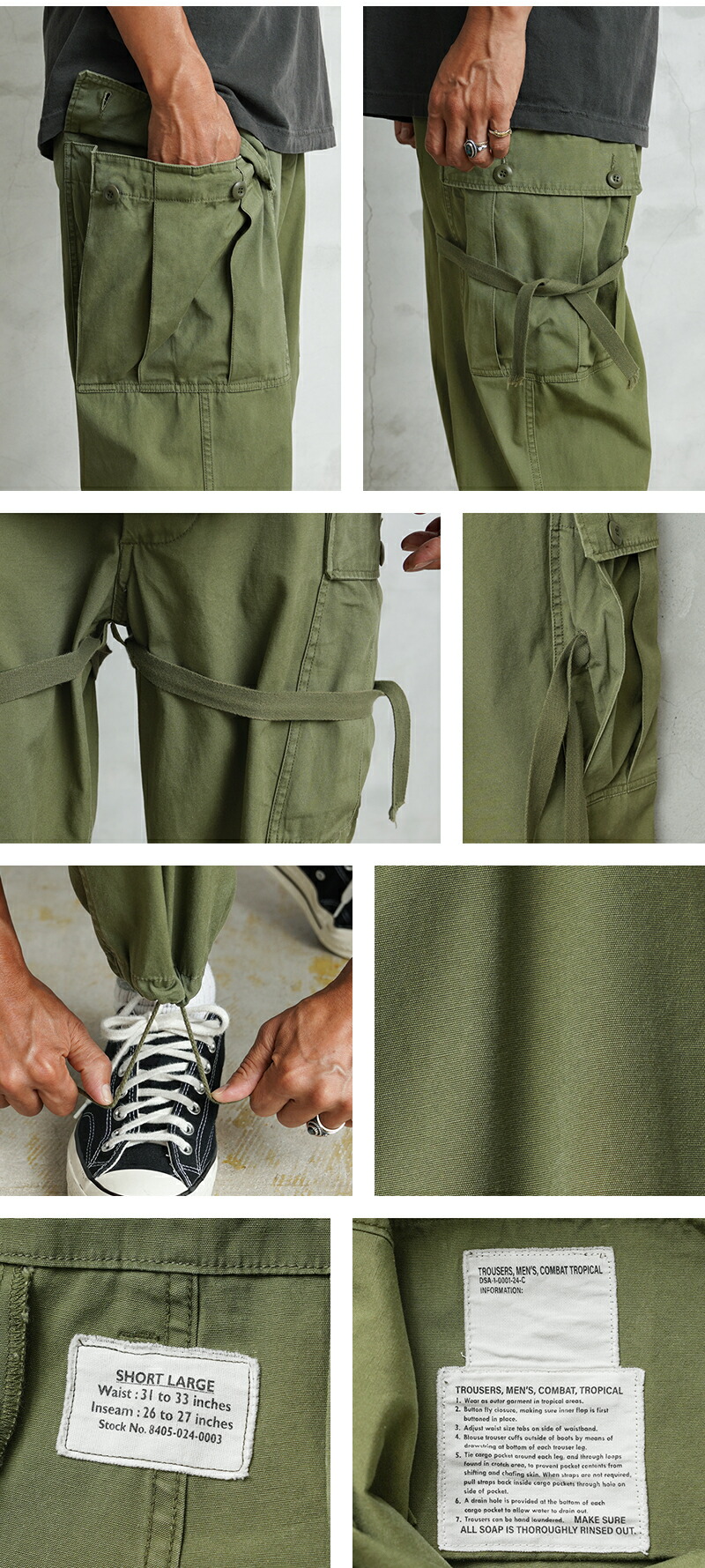 60년대 베트남 전쟁 시기에 채용된 미군 열대용 전투복 중에서도 높은 인기를 자랑하는 아이템입니다. 코튼 포플린을 사용하여 가볍고 편안한 착용감이며 M-65 디자인 요소를 일부 도입하면서 기존 패티그 팬츠의 장점도 살린 고급 디자인입니다.