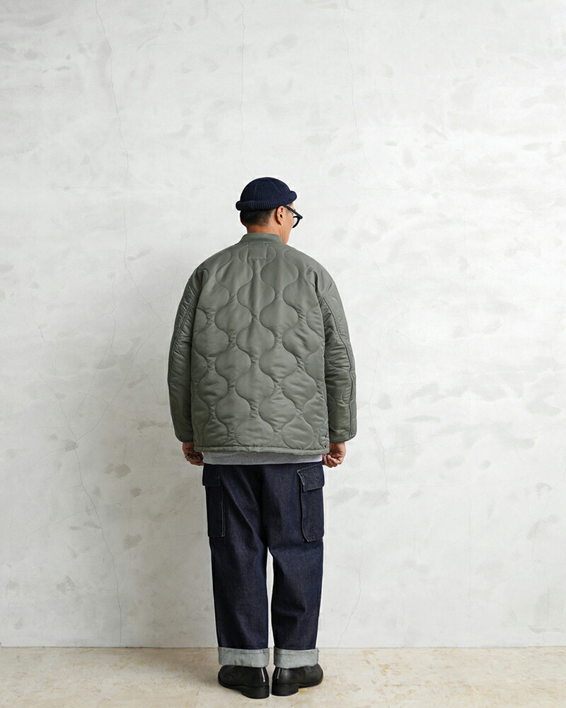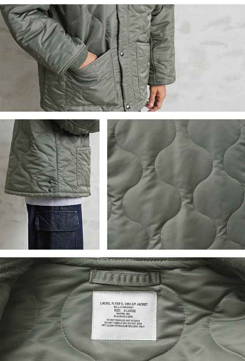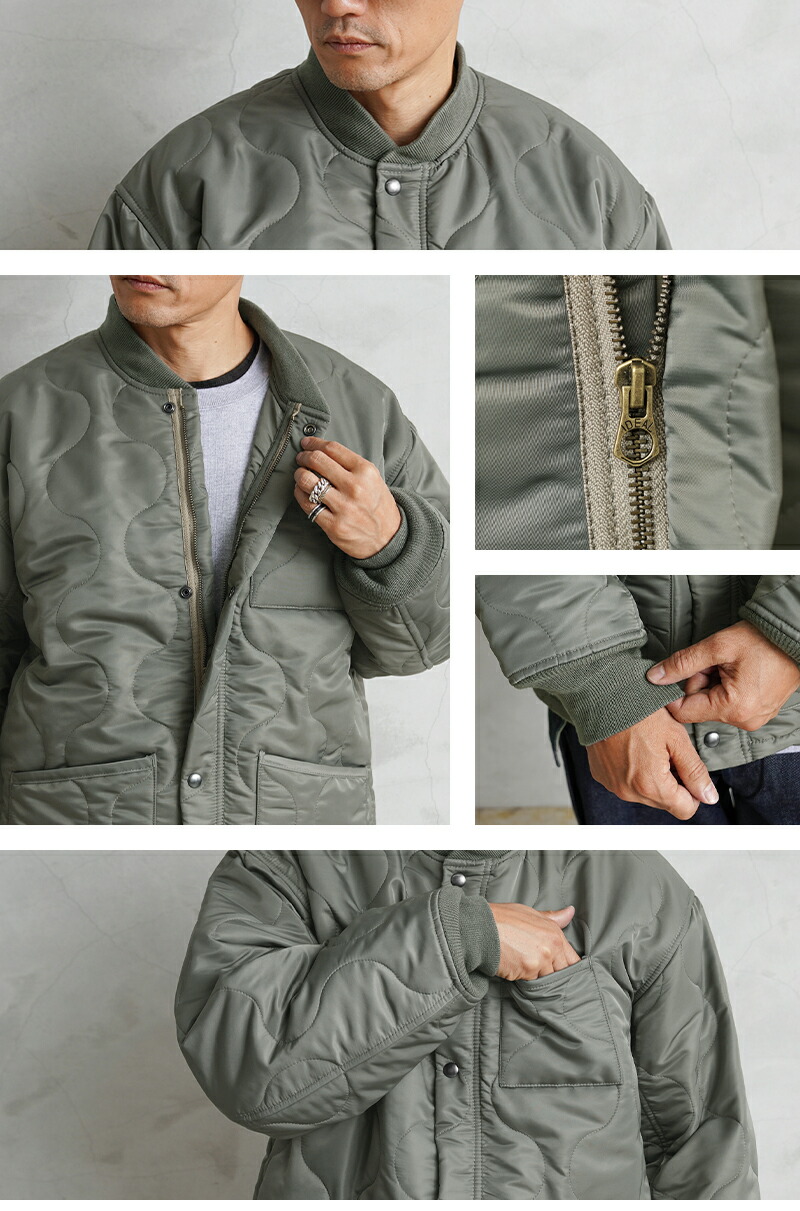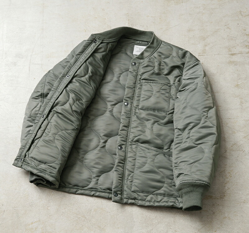 본래는 CWU-7/P 자켓의 라이너(내피) 로 설계된 아이템이지만, 리브 처리된 넥·소매, 지퍼와 스냅 버튼이 달린 전면 여밈 등 아우터로도 손색없는 독특한 디자인이 매력적인 모델입니다. 표주박 모양의 퀼팅 패턴을 사용하며 양쪽 패치 포켓으로 실용성이 높습니다. 충전재는 3M 씬술래이터를 사용하여 보온성이 우수합니다.